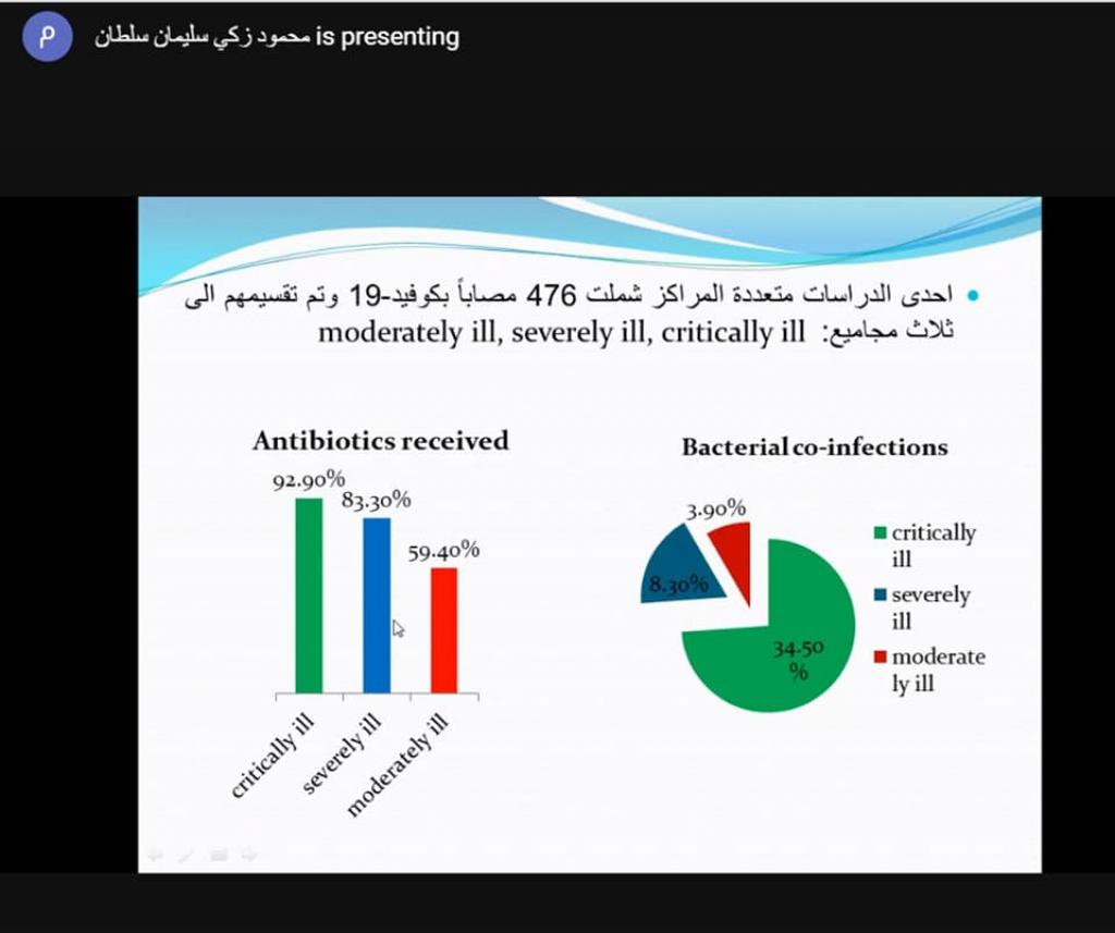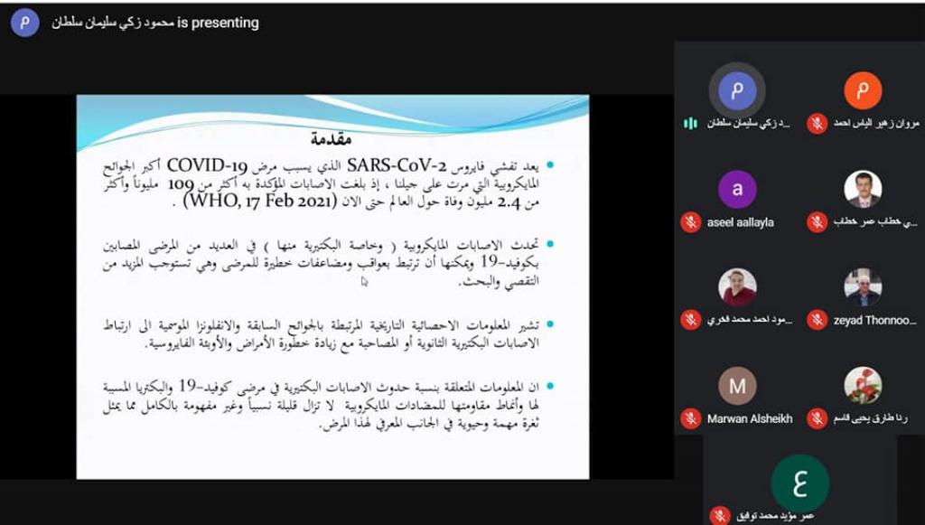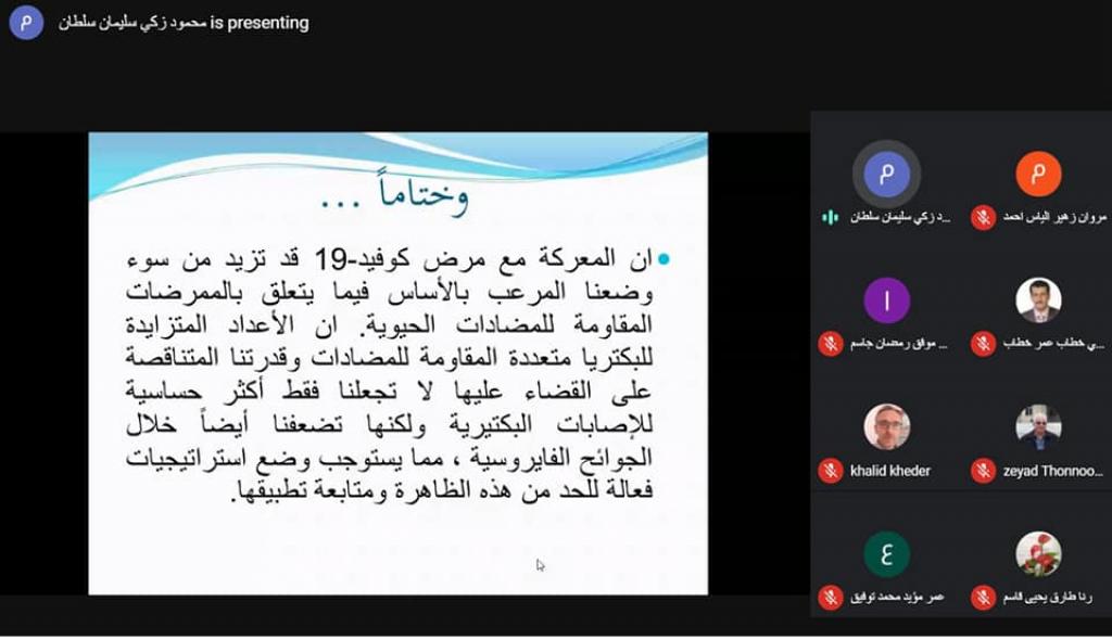 ضمن سلسلة النشاطات العلمية المتمثلة بالحلقات الدراسية لهذه السنة وبمتابعة السيدة عميد كلية العلوم الاستاذ المساعد الدكتور هيام عادل الطائي جرت في قسم الفيزياء الحياتية وبحضور السيد رئيس قسم الفيزياء الحياتية ا.م.د. مروان زهير الياس ومعظم تدريسي ومنتسبي القسم القاء حلقة دراسية بعنوان (جائحة كورونا وعلاقتها بجائحة المضادات الحيوية) في قسم الفيزياء الحياتية مساءا الأربعاء الموافق 17-2-2012 عبر الفضاء الإلكتروني باستخدام منصة meet من قبل الدكتور محمود زكي سليمان بين فيها شرحا وافيا عن خطر الاستعمال الخاطئ او الغير مدروس للمضادات الحيوية المصاحبة للإصابات الفيروسية وخاصة فيروس كورونا مستندا إلى آحدث التقارير والإحصائيات العلمية الموثقة. وصاحب ذلك مشاركة فعالة ومفيدة لمجموعة من الأسئلة والإستفسارات العلمية.
