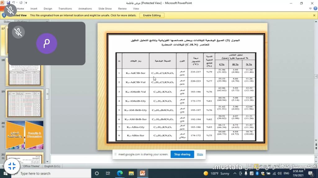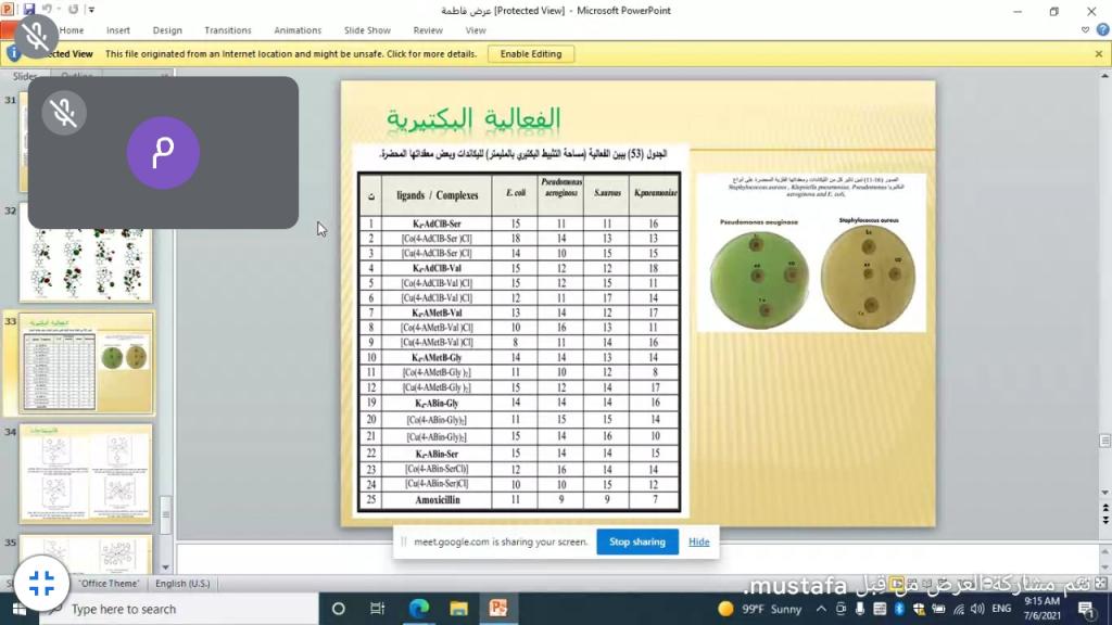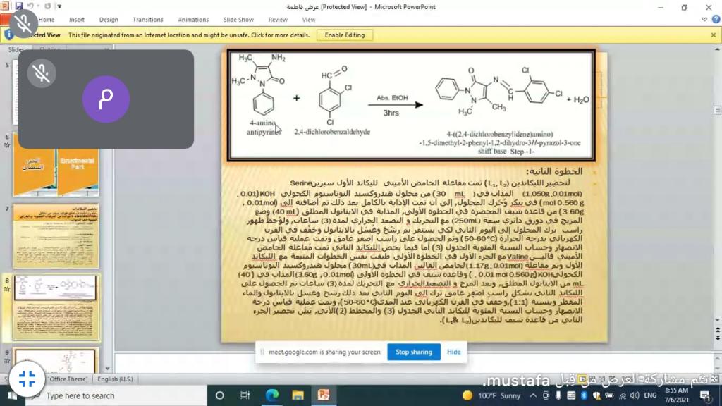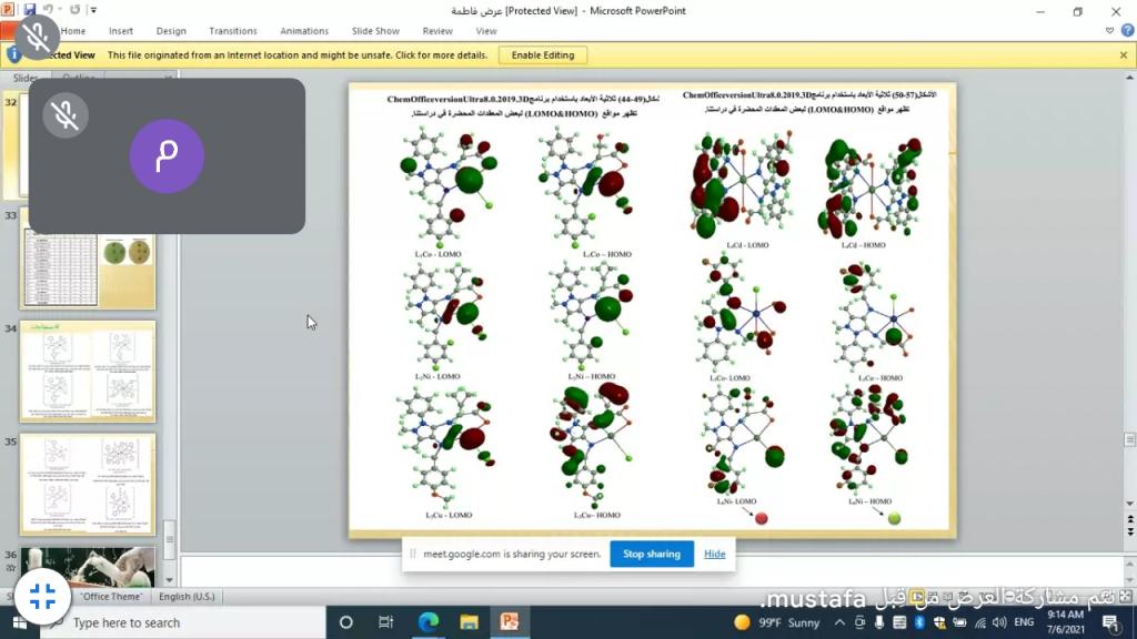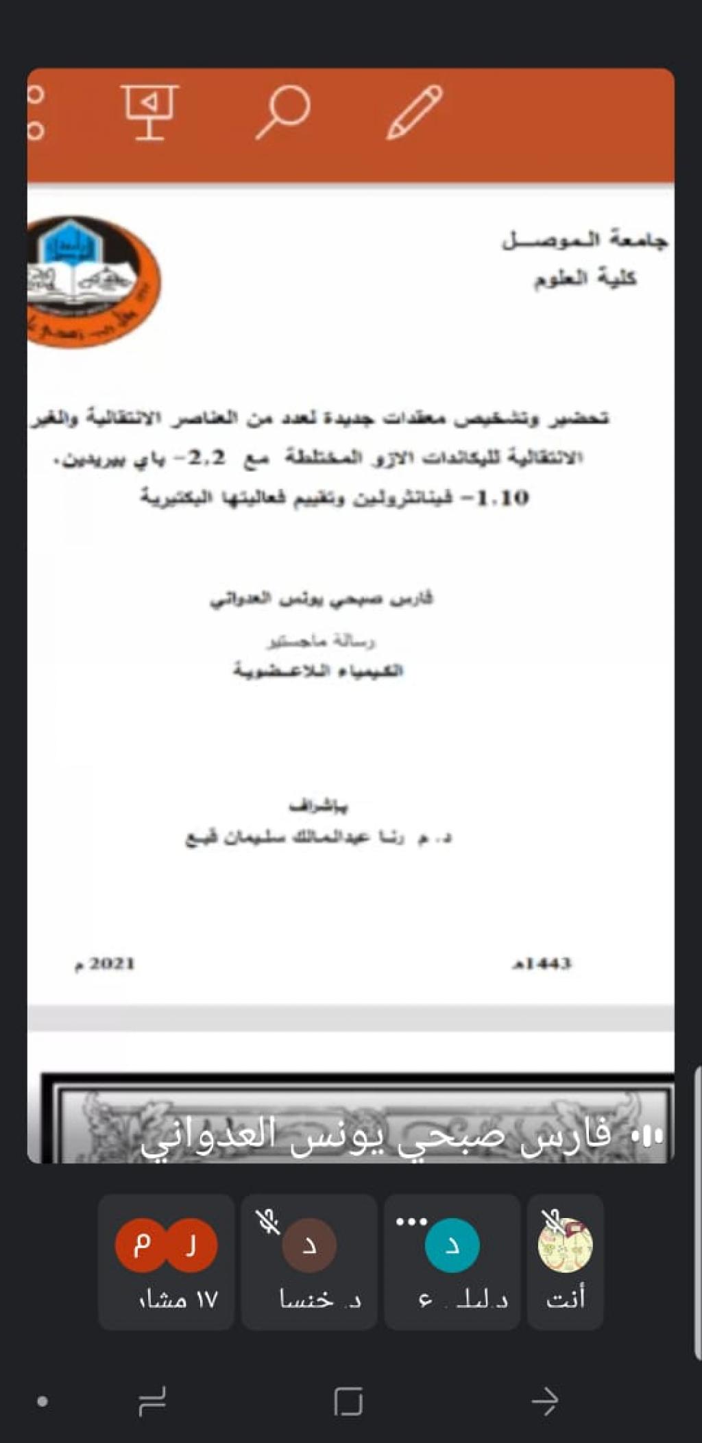 ضمن الحلقات الدراسية لطلبة الدراسات العليا في كلية العلوم قسم الكيمياء تم القاء حلقتين دراسيتين في قسم الكيمياء / فرع الكيمياء اللاعضوية الساعة السادسة من يوم الثلاثاء الموافق 6 تموز 2021 الأولى للطالب ( فارس صبحي يونس العدواني ) بإشراف م.د. رنا عبد المالك قبع الموسومة ” تحضير وتشخيص معقدات جديدة لعدد من العناصر الانتقالية والغير انتقالية لليكاندات الازو المختلطة مع 2,2-باي بيريدين 10,1-فينا نثرولين وتقييم فعاليتها البكتيرية ” حيث تناولت الدراسة تحضير العديد من المعقدات ذات فعالية بايولوجية عالية واجراء قياسات عديدة لها داخل وخارج العراق .و الحلقة الدراسية الثانية للطالبة ( فاطمة علي عيادة الوكاع ) بإشراف أ.م.د. صهباء علي أحمد لرسالتها الموسومة ” تحضير وتشخيص بعض المعقدات المشتقة من ٤-امينو انتي بايرين ودراسة بعضها بالأشعة السينية للمسحوق وفعاليتها البيولوجية ” حيث استعرضت خلالها مقدمة عن قواعد شيف والصيغة العامة لها والطرق المختلفة لتحضيرها والمعقدات المحضرة والطرق المختلفة لتشخيصها ودراسة الفعالية البكتيرية للمركبات المحضرة .