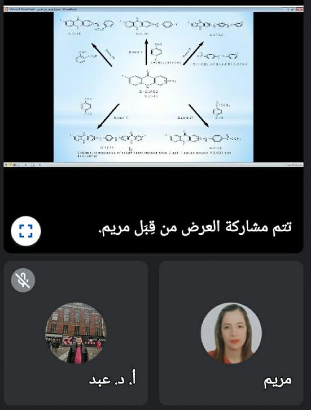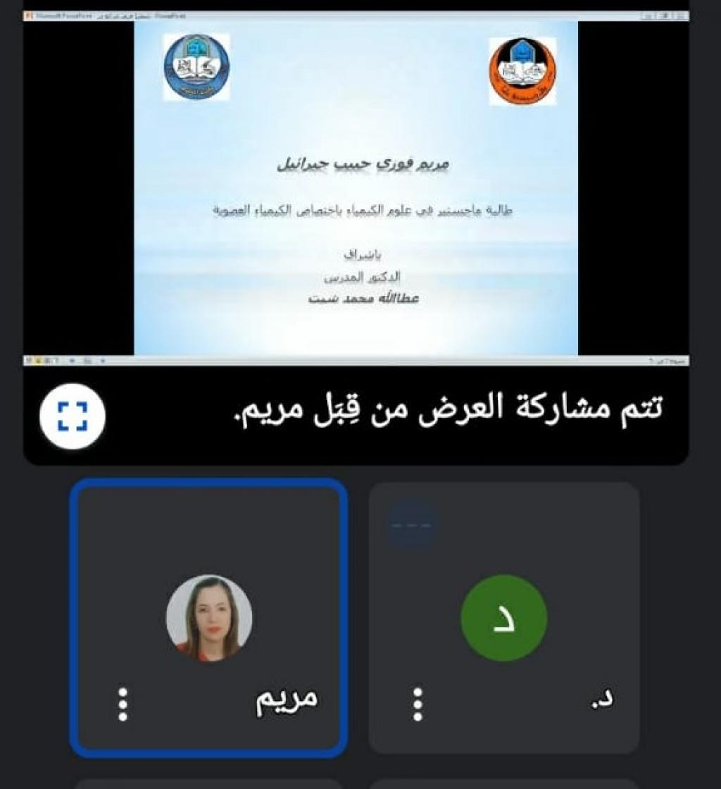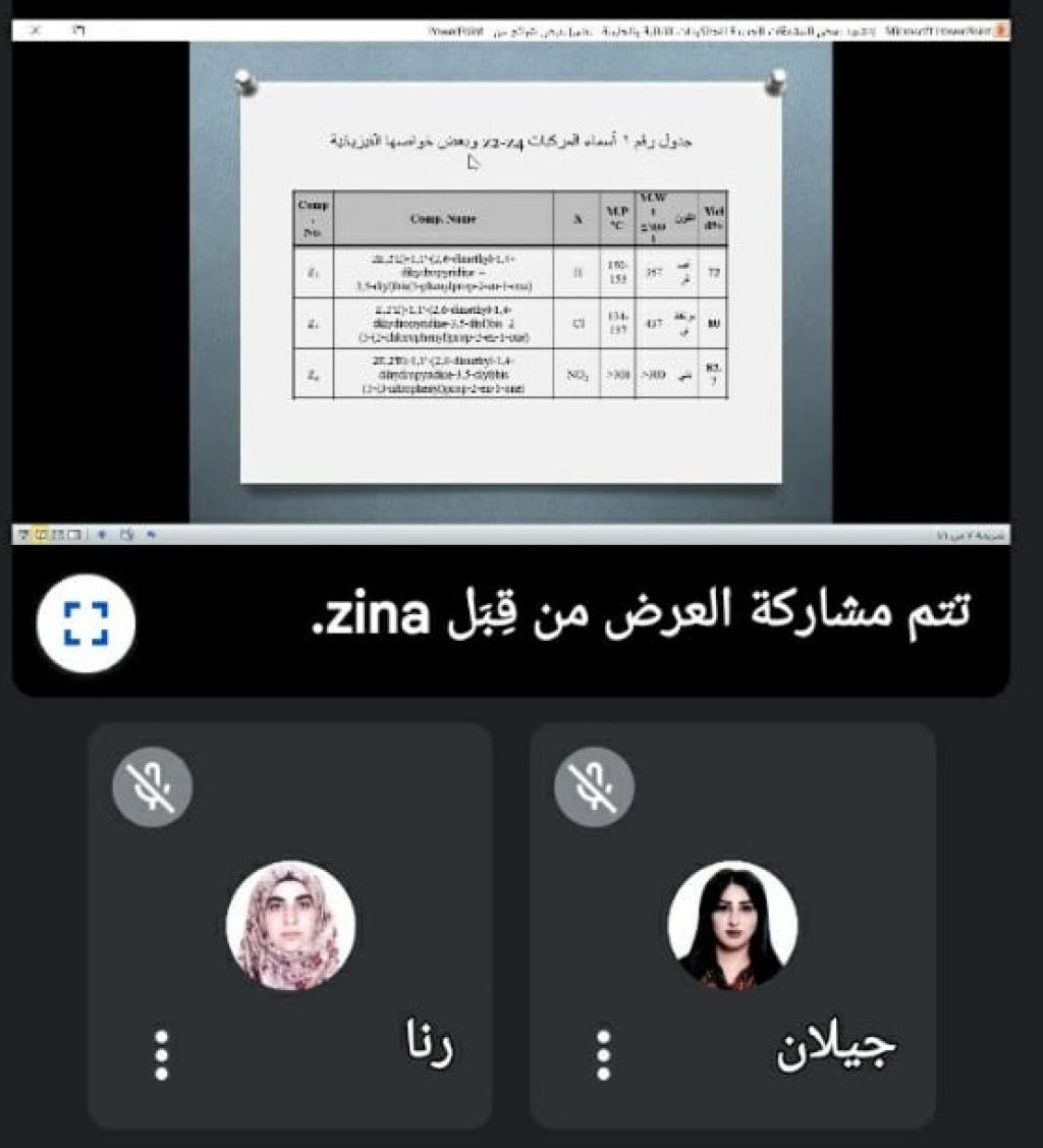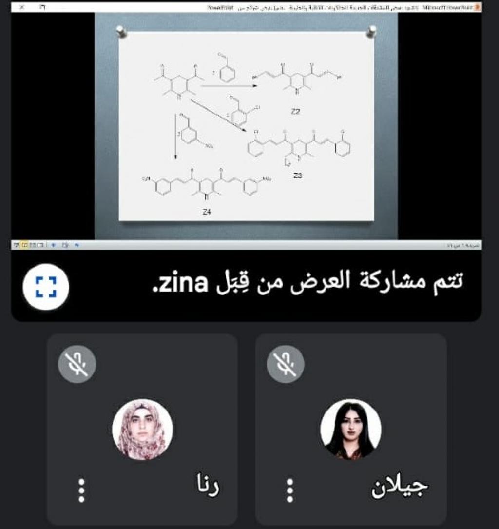 ضمن سلسلة النشاطات العلمية لطلبة الدراسات العليا في كليتنا و المتمثلة بالحلقات الدراسية القت طالبتا الماجستير في قسم الكيمياء/ حلقتان دراسيتين على المنصة الإلكترونية Meet في اختصاص الكيمياء العضوية يوم الثلاثاء الموافق 23 تشرين الثاني 2021 .الحلقة الدراسية الأولى للطالبة ( زينة خالد يحيى ) عن رسالتها الموسومة ” تشييد بعض المشتقات الجديدة للجالكونات الثنائية والحيوية على وحدة 2,6 _ ثنائي مثيل 1,4 ثنائي هيدروبريدين ” بإشراف الأستاذ المساعد الدكتورة منيرة يوسف رؤوف .والحلقة الدراسية الثانية للطالبة ( مريم فوزي حبيب ) عن رسالتها الموسومة ” تحضير و تشخيص بعض قواعد شيف الجديدة المشتقة من الامينو اكريدون وتقييم فعاليتها البايولوجية ” بإشراف الدكتور عطاالله محمد شيت .مع تمنياتنا لطلبتنا الأعزاء دوام النجاح والتوفيق