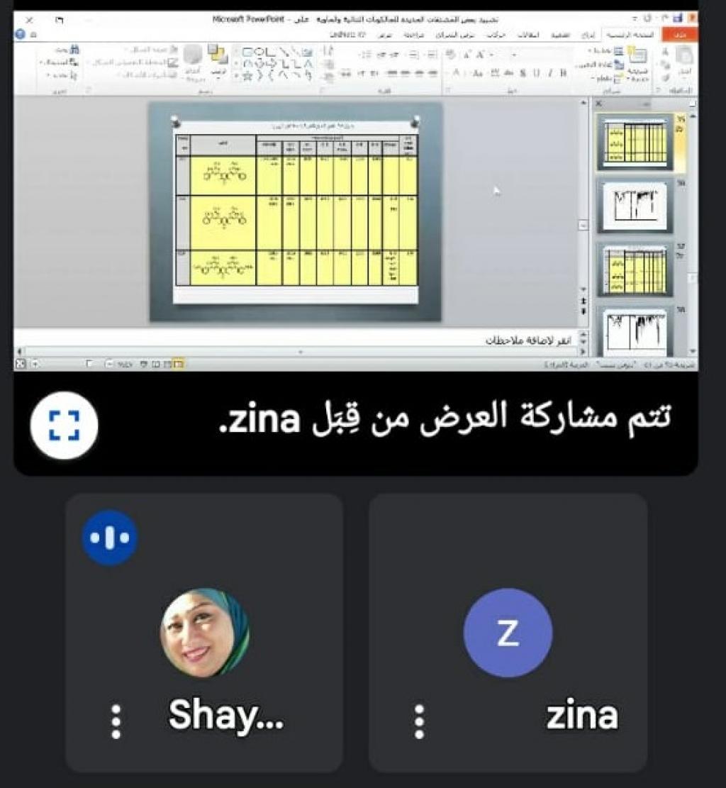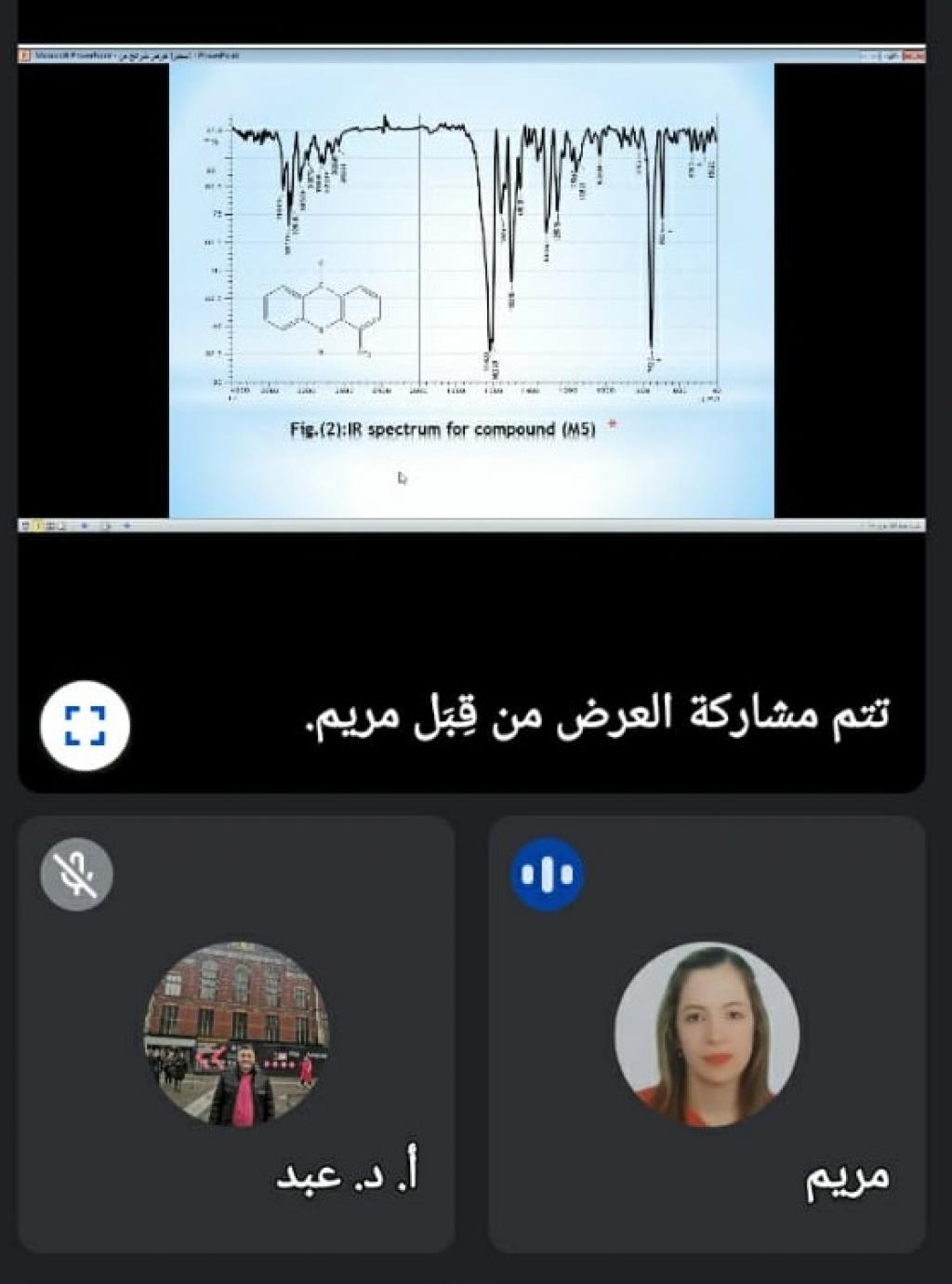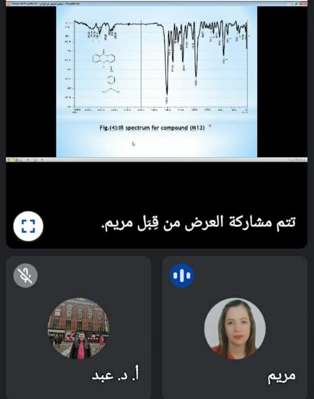 ضمن سلسلة النشاطات العلمية لطلبة الدراسات العليا في كليتنا و المتمثلة بالحلقات الدراسية القت طالبتا الماجستير في قسم الكيمياء/ حلقتان دراسيتين على المنصة الإلكترونية Meet في اختصاص الكيمياء العضوية يوم الثلاثاء الموافق 23 تشرين الثاني 2021 .الحلقة الدراسية الأولى للطالبة ( زينة خالد يحيى ) عن رسالتها الموسومة ” تشييد بعض المشتقات الجديدة للجالكونات الثنائية والحيوية على وحدة 2,6 _ ثنائي مثيل 1,4 ثنائي هيدروبريدين ” بإشراف الأستاذ المساعد الدكتورة منيرة يوسف رؤوف .والحلقة الدراسية الثانية للطالبة ( مريم فوزي حبيب ) عن رسالتها الموسومة ” تحضير و تشخيص بعض قواعد شيف الجديدة المشتقة من الامينو اكريدون وتقييم فعاليتها البايولوجية ” بإشراف الدكتور عطاالله محمد شيت .مع تمنياتنا لطلبتنا الأعزاء دوام النجاح والتوفيق