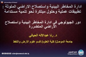 برعايةٍ مُباركـةٍ من السَّيـد رئيـسِ جامِعَـةِ الموصـلِ الأستـاذ الدكتـور وحيـد محمـود الإبراهيمي المُحترم وإشـرافِ السَّيِّــدة عميـد كُليَّـــةِ العلـــومِ الأُستـاذ الدكتـورة هِيــام عـادل إبراهيـم المُحترمـة ومتابعـةِ وحضـور السَّيـد رئيـس قسـم علـومِ الأرضِ والنَّفـط الدكتور عمر خلوق محمد ساجد المحترم وضمن دورات التعليم المستمر في كليتنا ، أقام قسم علوم الأرض والنفط بالتعاون مع قسم الدراسات والتخطيط / وحدة التنمية المستدامة دورةً علميةً بعنوان:“إدارةُ المخاطِـرِ البيئِيَّـةِ واستصـلاح الاراضي المُلوَّثـةِ” للفترة 26 – 30 تشرين الأول 2025، تناوب على إلقائهـا كل من أ.م.د. مهى عبد الحميد و م.د. رنا عبد الاله محمود، و م.د. سند عبدالاله محمود و م. لمى حازم، بحضـورِ عددٍ من تدريسـيِّ القسم.