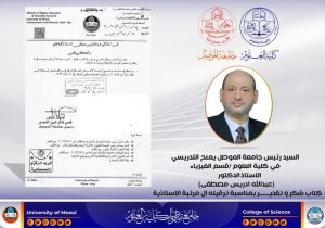 منح السيد رئيس جامعة الموصل الأستاذ الدكتور قصي كمال الدين الأحمدي المحترم كتاب شكر و تقدير الى الدكتور عبدالله ادريس مصطفى التدريسي في قسم الفيزياء ، بمناسبة ترقيته العلمية الى مرتبة الأستاذية.