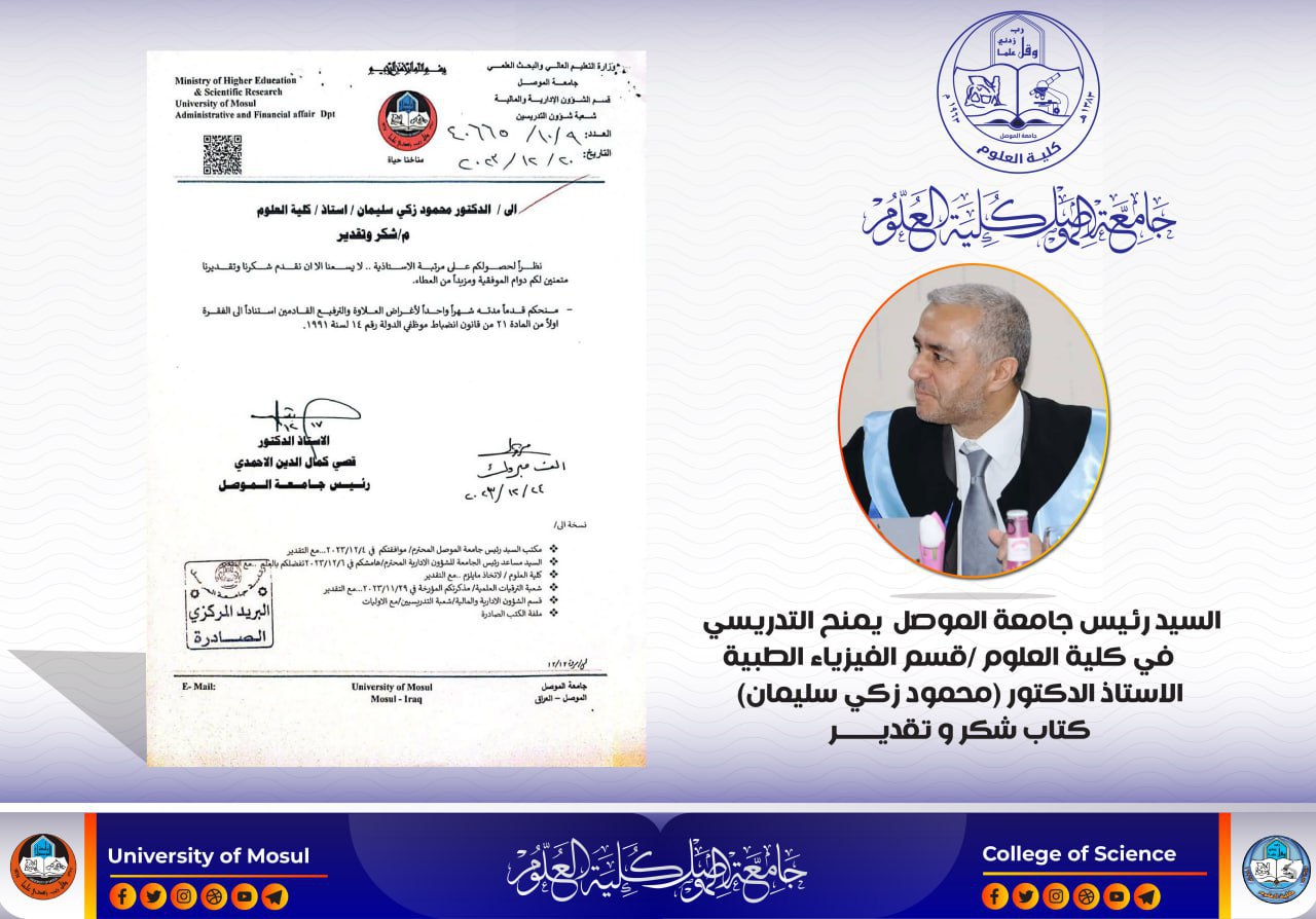 منح السيد رئيس جامعة الموصل الأستاذ الدكتور قصي كمال الدين الأحمدي المحترم كتاب شكر و تقدير إلى التدريسي في قسم الفيزياء الطبية بكليتنا الأستاذ الدكتور محمود زكي سليمان الحسو مع ما يترتب عليه من قدمٍ لمدة شهرٍ لأغراض العلاوة و الترفيع ؛ بمناسبة ترقيته العلمية الى مرتبة الأستاذية .