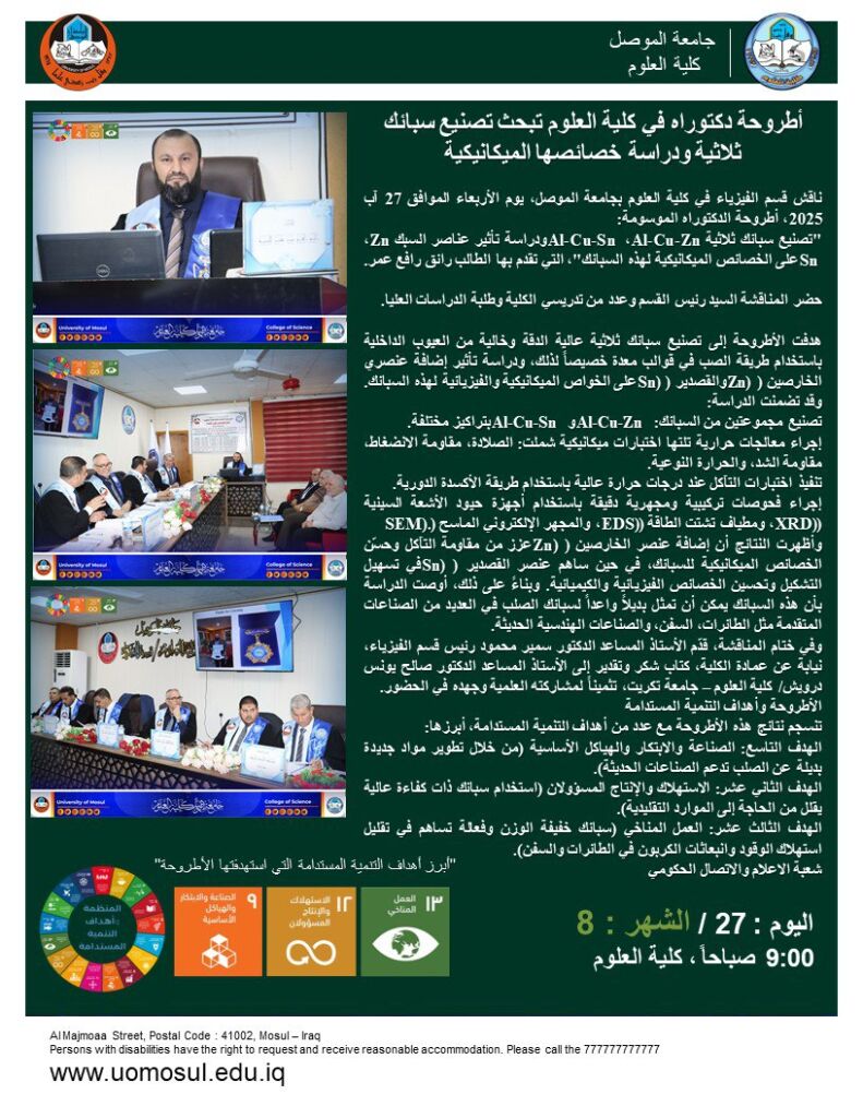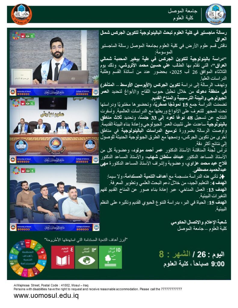 نوقشت في قسم علوم الأرض بكلية العلوم/ جامعة الموصل، يوم الأربعاء الموافق 27 آب 2025، رسالة الماجستير الموسومة ” دراسة رسوبية للصخور الجيرية الحيدية (الپاليوسين – الإيوسين) في مقطع بري بهاري – دهوك شمال العراق”، المقدمة من الطالب فرناس أحكام لقمان إسماعيل ، حضر المناقشة السيد رئيس القسم الأستاذ الدكتور عمر أحمد مولود المحترم، وعدد من تدريسي القسم وطلبة الدراسات العليا.