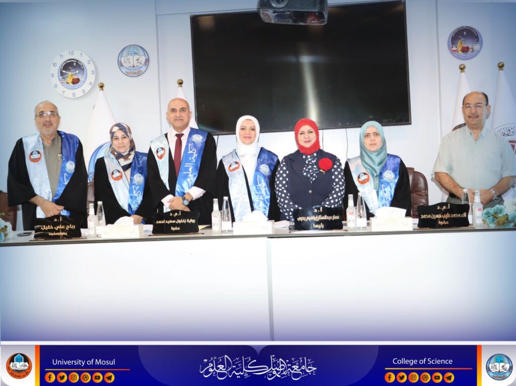 شهدت المناقشة حضور السيدة عميد كلية العلوم الأستاذ الدكتورة هيام عادل إبراهيم ومعاونيها للشؤون العلمية والإدارية، والسيد رئيس القسم، وعدد من تدريسيي الكلية.