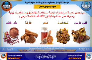 - اختبار حساسية العزلات للمضادات الحيوية والمستخلصات النباتية (قشور الرمان، العكبر، القرفة، المرة، بذور العنب)، وتقييم فعاليتها مقارنة بالمضادات الحيوية.