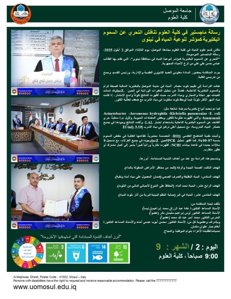 ناقش قسم علوم الحياة في كلية العلوم بجامعة الموصل، يوم الثلاثاء الموافق 2 أيلول 2025، رسالة الماجستير الموسومة ” الأثر البيئي لنوعية المياه الجوفية في القرى التابعة لناحية ربيعة ضمن محافظة نينوى / العراق “، والتي تقدم بها الطالب عبدالرحمن وعد الفضلي من فرع علم النبات.