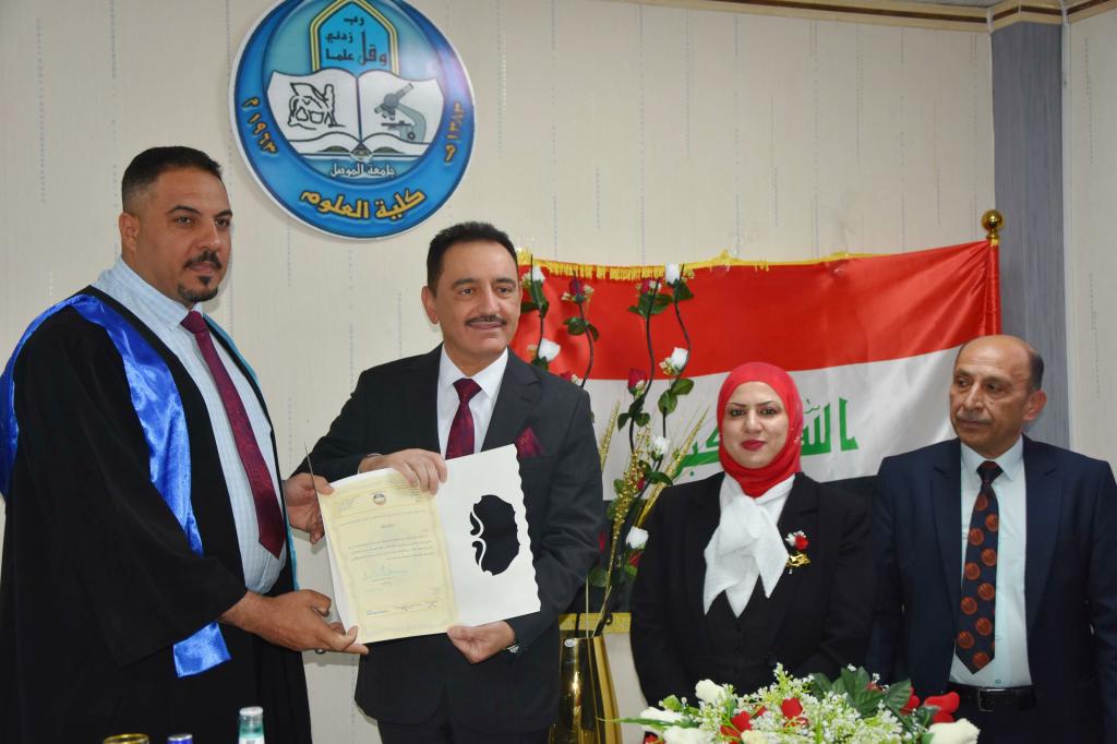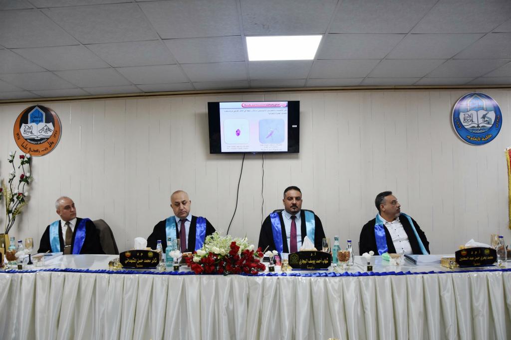 ناقشت كلية العلوم في جامعة الموصل يوم الأحد الموافق 5 أيار 2022 رسالة الماجستير الموسومة ” التأثيرات البايوكيميائية والجزيئية للتآزر بين مركبي Liposomal amphotericin B وThalidomide لعلاج اللشمانيا الجلدية والاحشائية خارج الجسم الحي ” حضر جانباً منها السيد رئيس جامعة الموصل الأستاذ الدكتور قصي كمال الدين الأحمدي والسيدة عميد الكلية الأستاذ الدكتورة هيام عادل ابراهيم والأستاذ أمين الفنش قائمقام الموصل والنائب طالب عبد الكريم المعماري وعدداً من تدريسيي القسم .تناولت الدراسة التي تقدمت بها الطالبة ( نسمة ادريس صالح المعماري ) من قسم علوم الحياة /فرع الحيوان تحديد التأثير السمي لعقاري الامفوترسين اللايبوسومي ب والثاليدومايد والتأزر بينهما على بروماستكوت Promastigote اللشمانيا الجلدية L. tropicaواللشمانيا الاحشائية L. donovani وايجاد التركيز القاتل لــ 50% (IC50) و90% (IC90) عند الطور اللوغاريتمي 72 ساعة.وقد تراوحت التراكيز المثبطة ﻟ 50% من النمو للعقارين كل على حده ما بين (5-30) مايكروغرام/مل وكان تركيز التأزر بين العقارين لكلا النوعين عند الطور اللوغاريتمي 72 ساعة (0.5 + 2.5) و(2 + 2.5) مايكروغرام/ مل. لحظ ظهور زيادة في زمن الجيل مع ازدياد التراكيز المستخدمة للعقارين مع ازدياد فترة التعريض فقد تراوحت ما بين (24-68) ساعة بالنسبة للشمانيا الجلدية و(22-65) ساعة للشمانيا الاحشائية وكان زمن الجيل للتأزر بين العقارين بواقع (12-17) ساعة للشمانيا الجلدية و(11-18) ساعة للشمانيا الاحشائية. وعلى المستوى الجزيئي فقد تمت دراسة تأثير الادوية المستخدمة على عدد من الجينات للنوعين كليهما من الطفيلي عند الطور اللوغاريتمي اذ اظهرت نتائج الترحيل الكهربائي لناتج تضخيم ITS1 للشمانيا الجلدية والاحشائية كليهما توافق مع الحزم الرئيسة للعينات جميعها المستخدمة الجلدية T (C، 5، 10، 0.5+2.5، 2+2.5) والاحشائية D (C، 5، 12.5، 1+2.5، 2+2.5) مايكروغرام/ مل المعاملة وغير المعاملة (السيطرة) عند الحزمة القياسية 322bp مما يدل على انها تعود الى جنس اللشمانيارافق العمل تسجيل ثلاث طفرات وراثية بطفيلي اللشمانيا الجلدية عند استخدام التازر بين المركبين في بنك المورثات التابع للمركز الدولي لمعلومات التكنولوجيا الحيوية NCBI في الولايات المتحدة.هدفت الدراسة الى اختبار فعالية عقاري الثاليدومايد والامفوترسين اللايبوسومي ب كل على حده ومجتمعين سويا على النمو والمظهر الخارجي لبرماستكوت اللشمانيا الجلدية والاحشائية ودراسة سمية العقارين مما قد يسهم في تقليل الجرعة المعطاة من الامفوترسين اللايبوسومي ب فضلا عن تحديد ميكانيكية عمل هذه الادوية على المستوى الجزيئي للطفيليات بدراسة تاثيرها في بعض الجينات وملاحظة التغيرات التي تحدث فيها.ترأس لجنة المناقشة الأستاذ الدكتور شهاب أحمد يوسف وعضوية كل من الأستاذ المساعد الدكتور محمد بحري حسن والمدرس الدكتور ثائر محمد حسن وبإشراف الأستاذ المساعد هيثم لقمان شهاب الحيالي.قدّم السيد رئيس الجامعة كتاب شكر و تقدير إلى الأستاذ الدكتور شهاب أحمد يوسف / الجامعة التقنية الشمالية / المعهد التقني / الموصل لجهوده المبذولة في مناقشة الطالبة.