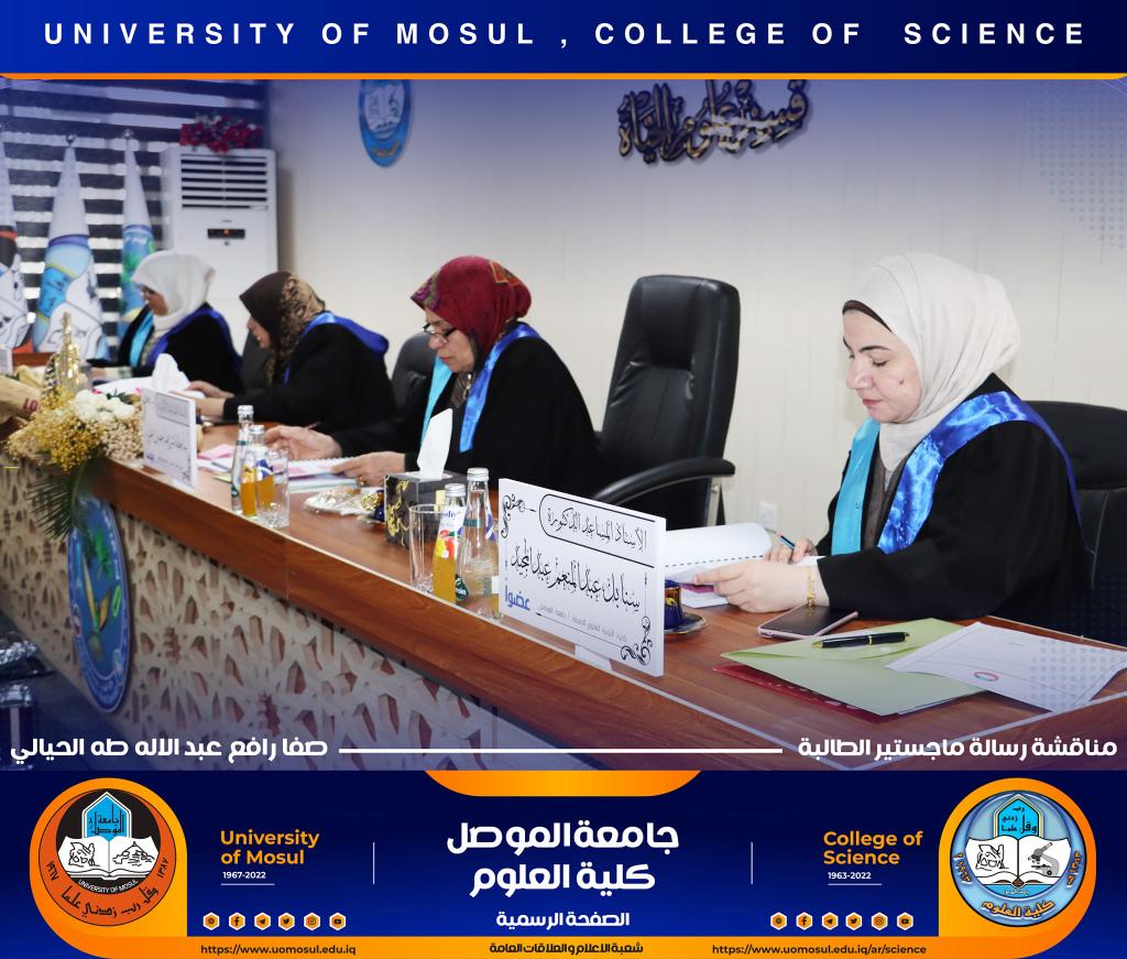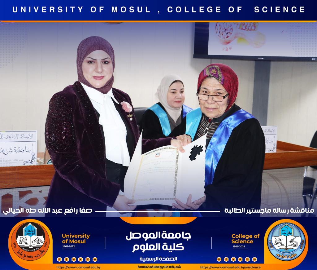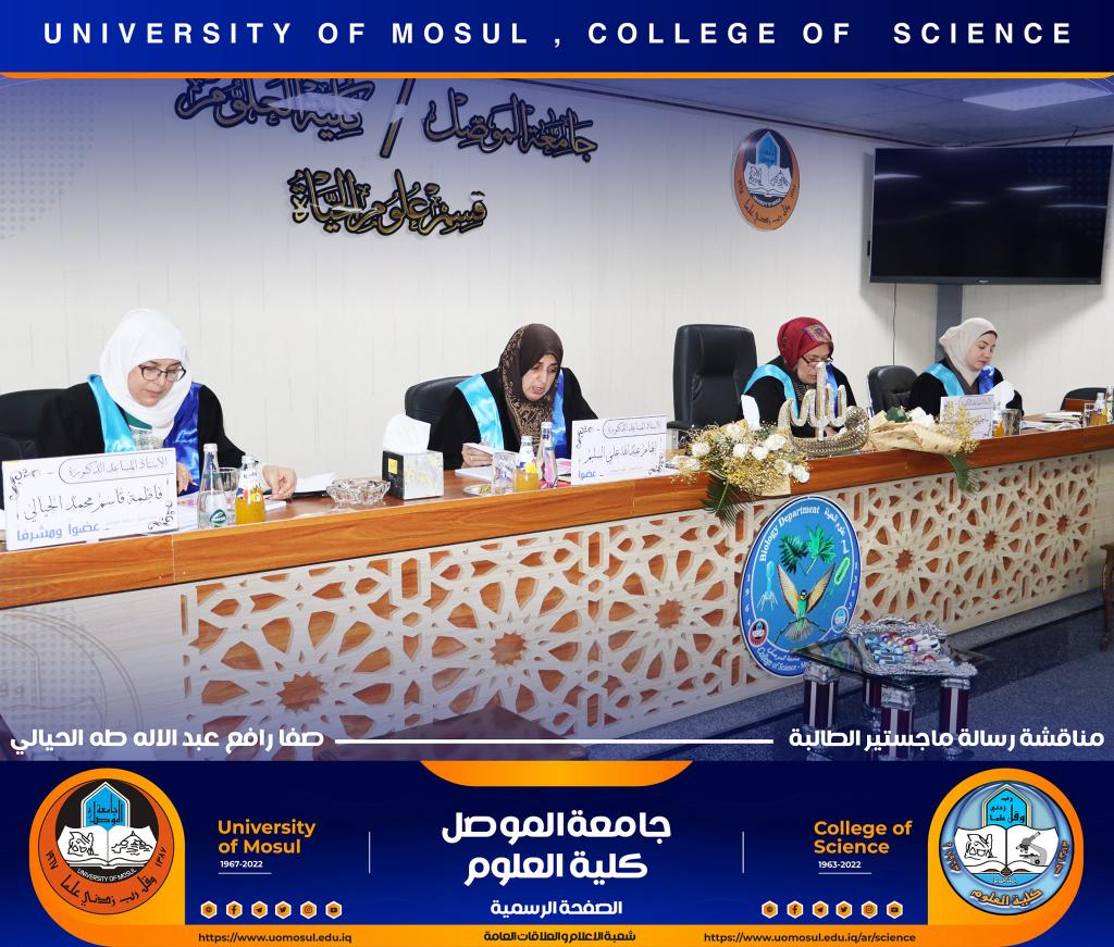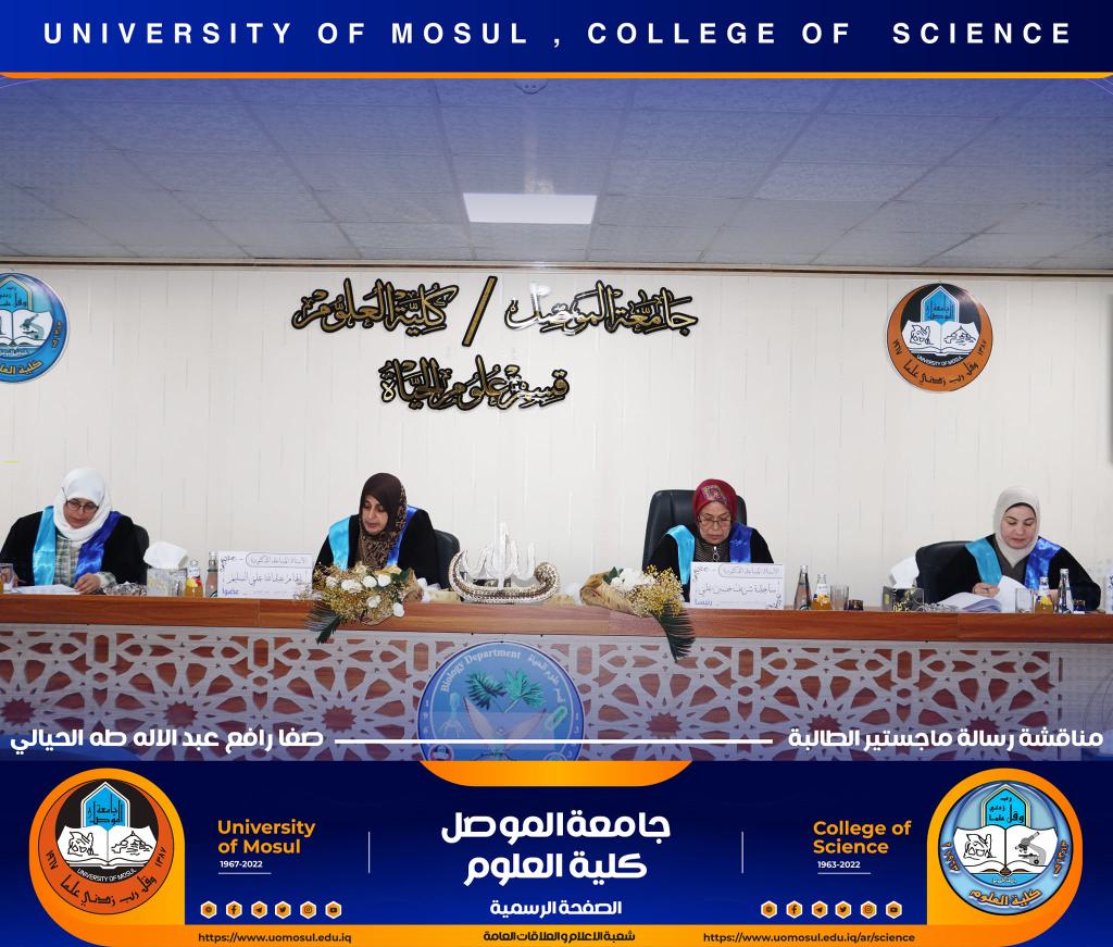 ناقش قسم علوم الحياة بكلية العلوم في جامعة الموصل رسالة ماجستير الموسومة ” التأثير الوقائي للبروبولس لسمية مستخلص بذور اللوز ( امجدالين ) في معايير الخصوبة لذكور الجرذان البالغة ” يوم الثلاثاء الموافق 27 كانون الأول 2022.حضر جانباً منها السيدة عميد الكلية الأستاذ الدكتورة هيام عادل إبراهيم والسيد المعاون العلمي والسيد رئيس القسم وعدد من تدريسي وطلبة القسم.تناولت الدراسة التي تقدمت بها الطالبة ( صفا رافع عبد الإله ) / فرع الحيوان عدد من المحاور منها :استخدام الامغدالين بجرع مختلفة وهو مركب طبيعي في ثمار المشمش واللوز المر يسبب سمية بسبب وجود السيانيد القاتل ، وبيان فعالية الدور الوقائي للعكبر للحد من سمية الجرع المختلفة من الامغدالين.أظهرت النتائج ظهور علامات عيانية وأيضاً نسجية تمثلت بالتنخر التجلطي وارتشاح خلوي وفرط تنسج ونزف دموي ، واحتقان ، واظهر تنظيم التعبير الجيني باستخدام تقنية PCR -Rt انخفاض لانزيمات الكلوتاثيون بيروكسيديز وSOD3 وكاتليز بالنسبة لجرع الامغدالين أما بجرعة العكبر كانت النتائج مرتفعة مشابه لمجموعة السيطرة ، أظهرت دراستنا أيضاً عن التعبير الكيميائى النسجي المناعي للدليل CD31 لتولد الأوعية في كبد الجرذان تعبيراً معتدلاً إلى عالي الكثافة ( اللون البني) .ترأس لجنة المناقشة الأستاذ المساعد الدكتورة ساجدة شريف حسين / كلية النور الجامعة وعضوية كل من الأستاذ المساعد الدكتورة الهام عبد الله علي والأستاذ المساعد الدكتورة سنابل عبد المنعم عبد المجيد وبإشراف الأستاذ المساعد الدكتورة فاطمة قاسم محمد.شعبة الإعلام والعلاقات العامةالثلاثاء 27 كانون الأول 2022