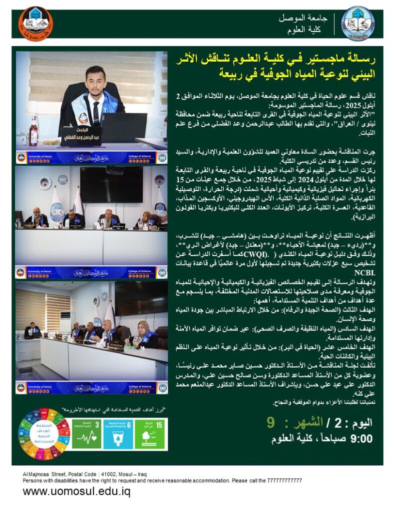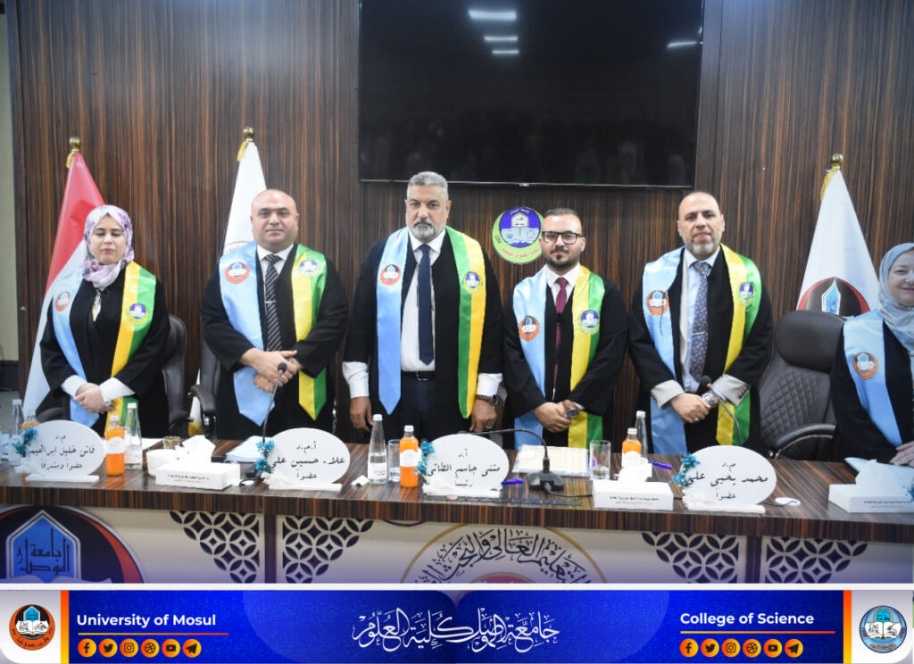 ناقش قسم علوم الحياة في كلية العلوم بجامعة الموصل، يوم الثلاثاء الموافق 2 أيلول 2025، رسالة الماجستير الموسومة ” التحري عن السموم البكتيرية كمؤشر لنوعية المياه في محافظة نينوى ” ، التي تقدم بها الطالب عباس حسن تقي علي من فرع الأحياء المجهرية.