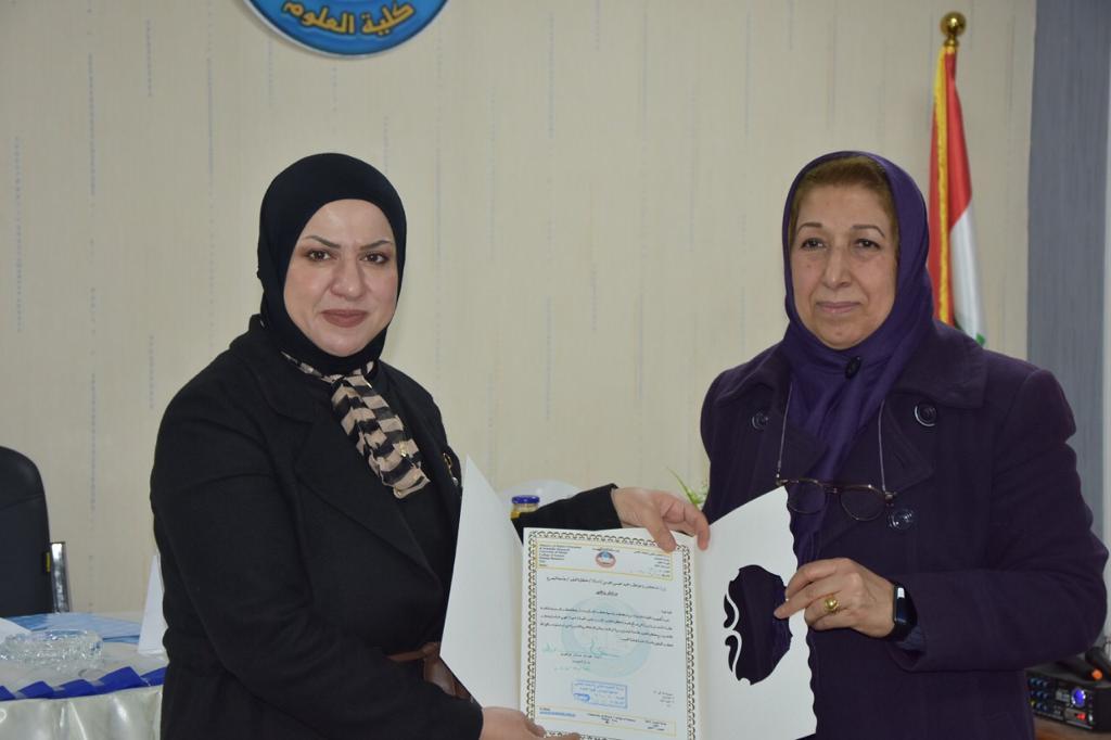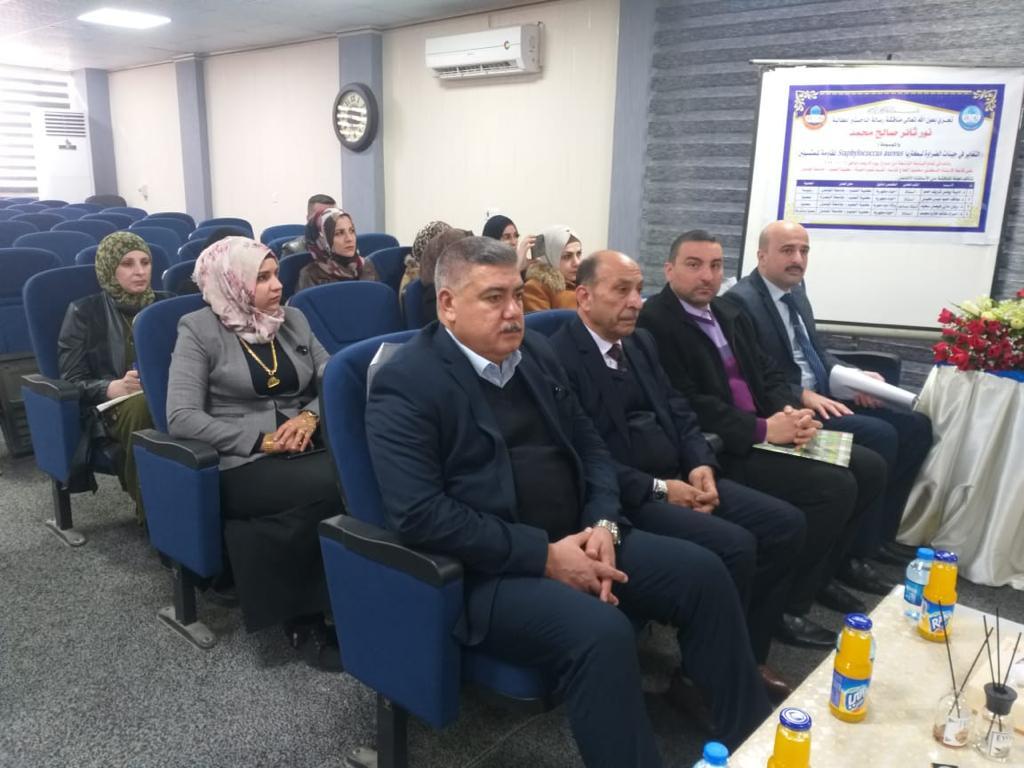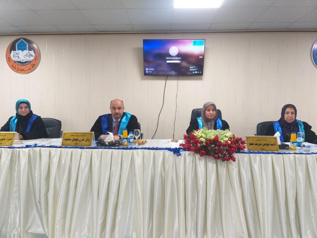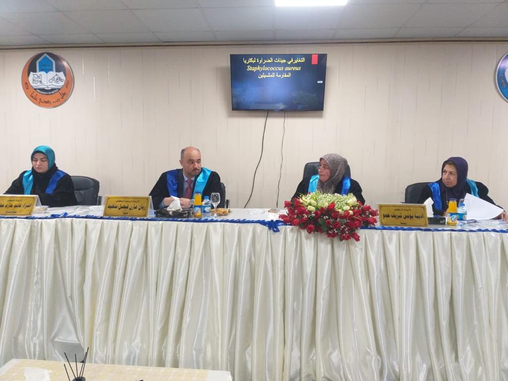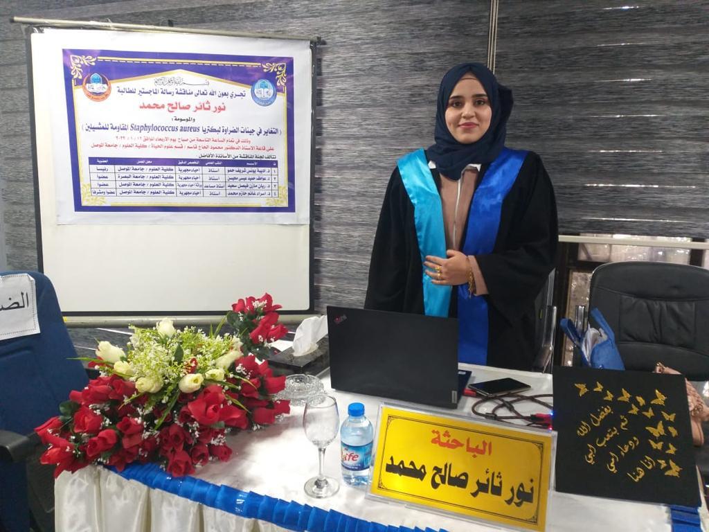 ناقشت كلية العلوم في جامعة الموصل يوم الأربعاء الموافق 12 كانون الثاني 2022 رسالة الماجستير الموسومة ” التغاير في جينات الضراوة لبكتريا Staphylococcus aureus المقاومة للمثسيلين ” حضر جانباً منها الأستاذ المساعد الدكتورة هيام عادل الطائي عميد الكلية و السيد المعاون العلمي وعدداً من تدريسي الكلية.تناولت الدراسة التي تقدمت بها الطالبة (نور ثائر صالح محمد ) من قسم علوم الحياة / فرع الأحياء المجهرية جمع عينات من المرضى والأصحاء( مسحات الأنف) في مدينة الموصل وتم التحري عن بكتريا Staph.aureus وشخصت بطرق التشخيص المختلفة التقليدية وتم تأكيد تشخيصها بجهاز الفايتك.وعلى المستوى الجزيئي تم الكشف عن وجود جينات المقاومة والضراوة فيها وعلاقة بعض جينات الضراوة الخاصة بالالتصاق بتكوين الغشاء الحيوي . تم تنميط سلالات الMRSa وVRSA باستخدام الجين Spa .هدفت الدراسة الى:1- التحري عن انواع aureus المقاومة للمثسيلين والفانكومايسين المعزولة من بعض الحالات المرضية والطبيعية الموجودة في الأنف.2- قدرتها على تكوين الأغشية الحيوية وعلاقتها ببعض جينات الالتصاق .3- التعرف على التغاير الموجود في بعض جينات الضراوة التي تشمل ( Spa,PVL,emp,ebps,eno,ClfA,Clfb,FbnA ).4- تنميط بكتريا Staph.aureus اعتمادا على دراسة تتابعات الجين Spa وايجاد العلاقة التطورية بين سلالات بكتريا Staph.aureus .ترأس لجنة المناقشة الأستاذ الدكتورة أديبة يونس شريف حمو وعضوية كل من الأستاذ الدكتورة عواطف حميد عيسى محيسن والأستاذ المساعد الدكتور ريان مازن فيصل حسين وبأشراف وعضوية الأستاذ الدكتورة اسراء غانم حازم السماك .قدمت السيدة عميد الكلية كتاب شكر وتقدير للأستاذ الدكتورة عواطف حميد عيسى محيسن / جامعة البصرة لتكبدها عناء السفر و حضور مناقشة الطالبة.