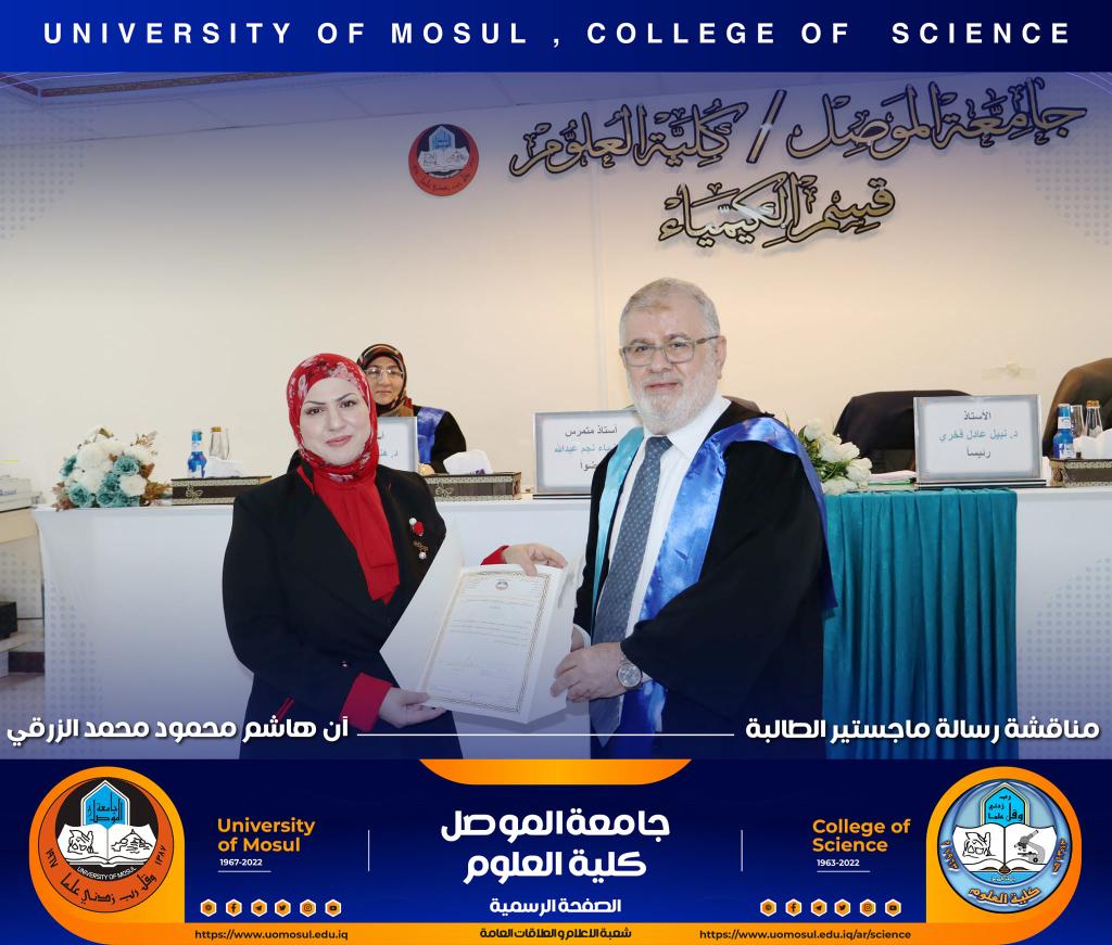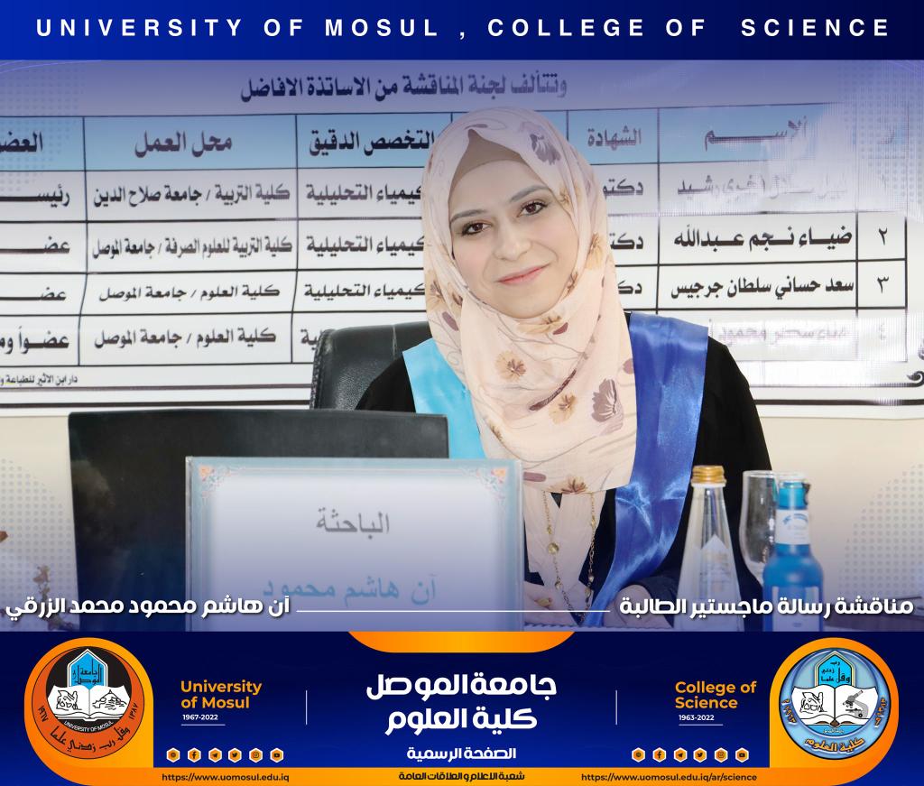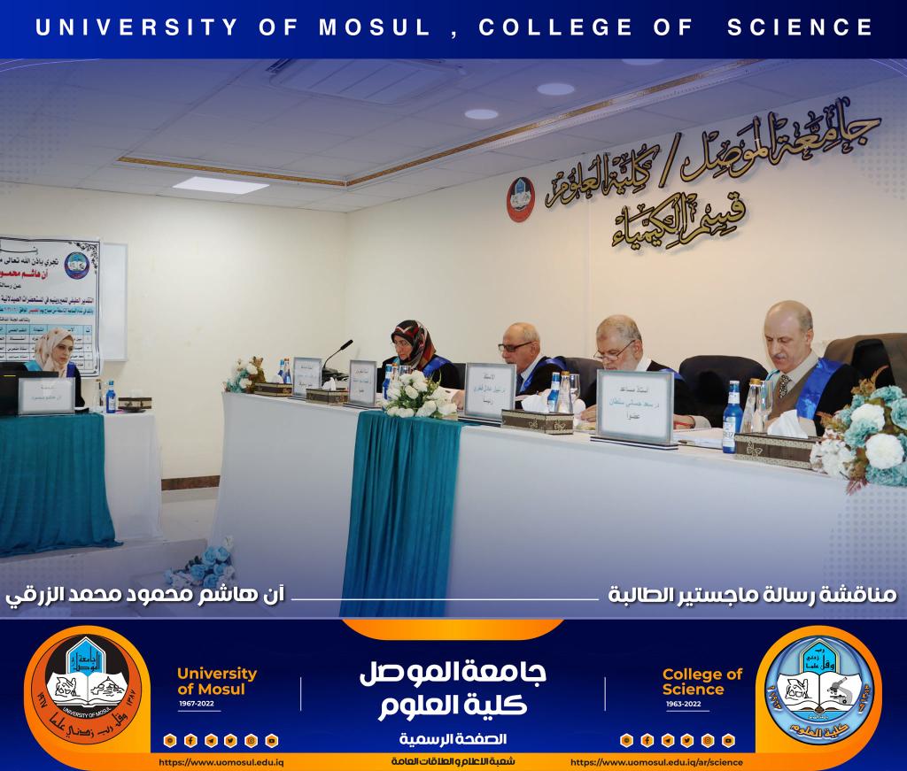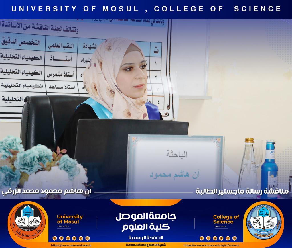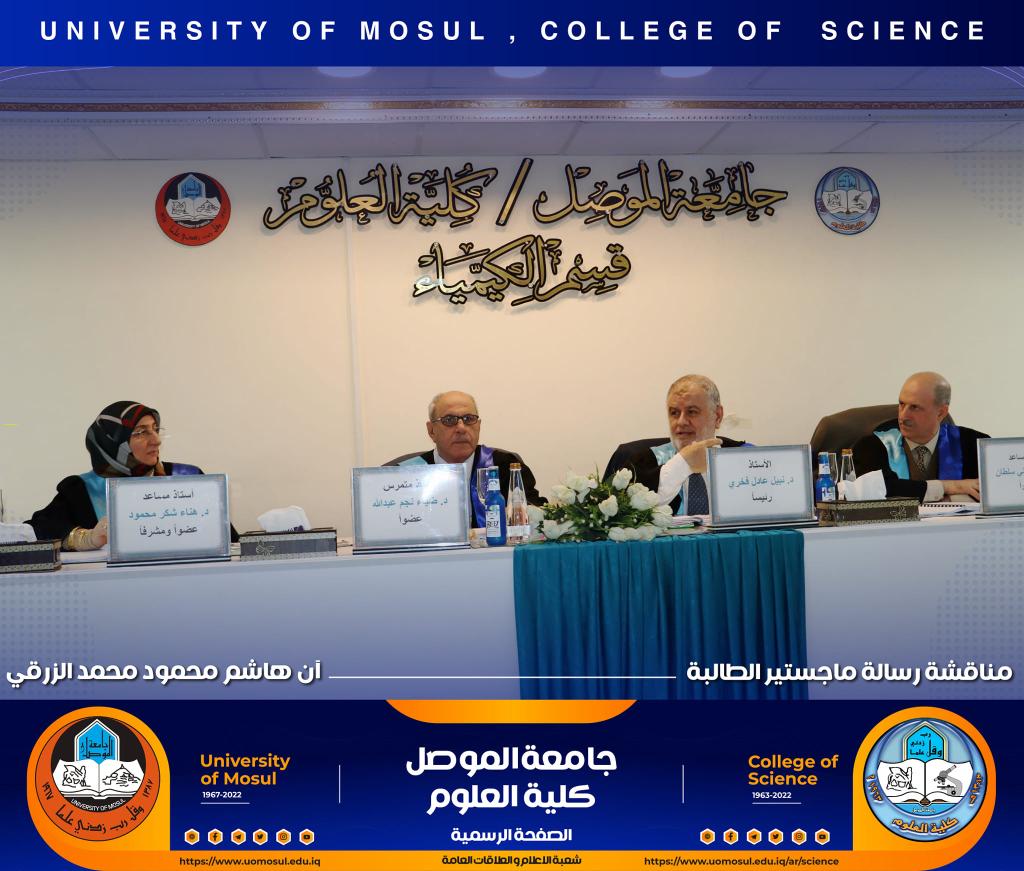 ناقش قسم الكيمياء في كلية العلوم بجامعة الموصل رسالة الماجستير الموسومة ” التقدير الطيفي الميروبنيم في المستحضرات الصيدلانية والميترونيدازول في كل من الدم والمستحضرات الصيدلانية” يوم الخميس الموافق للأول من كانون الأول 2022.حضر جانباً منها الأستاذ الدكتورة هيام عادل إبراهيم الطائي عميد الكلية والسيد المعاون الاداري والسيد رئيس القسم وعدد من تدريسي الكلية .تناولت الرسالة التي تقدمت بها الطالبة ( آن هاشم محمود ) في فرع الكيمياء التحليلية طريقة طيفية مبتكرة لتقدير الميروبنيم حيث تعتمد الطريقة على أكسدة الميروبنيم بوساطة بيرايودات البوتاسيوم ثم اقترانه مع كاشف بارا أمينو ثنائي فنيل أمين في وسط من حامض الهيدروكلوريك ليتكون ناتج ذو لون أزرق مخضر. وتم تطبيق الطريقة المقترحة بنجاح لتقدير الميروبنيم في مستحضراته الصيدلانية بشكل حقن.تطرقت الدراسة كذلك الى تطوير طريقة لتقدير الميروبنيم في حالته النقية وفي مستحضراته الصيدلانية حيث تعتمد الطريقة على أكسدة الميروبنيم في وسط من حامض الهيدروكلوريك، كما تم استخدام طريقة طيفية لتقدير الميترونيدازول بعد اختزاله إلى مناظرةٍ بشكل أمين حيث تعتمد الطريقة على ازوتة كاشف بارا أمينو ثنائي فنيل أمين ثم اقتران الكاشف المؤزوت مع الميترونيدازول المختزل في وسط قاعدي وبوجود عامل الشد السطحي (CPC) Cetyl pyredinium chloride وتم تطبيق الطريقة المقترحة بنجاح لتقدير الميترونيدازول في مستحضراته الصيدلانية بشكل حبوب و حقن كما تم تطبيق الطريقة على عينات دم الإنسان بعد أخذه لجرعة فموية واحدة ( 500ملغم ) .ترأس لجنة المناقشة الأستاذ الدكتور نبيل عادل فخري من جامعة صلاح الدين أربيل وعضوية كل من الأستاذ الدكتور ضياء نجم عبد الله و الأستاذ المساعد الدكتور سعد حساني سلطان ، وبإشراف وعضوية الأستاذ المساعد الدكتورة هناء شكر محمود.شعبة الإعلام والعلاقات العامةالجمعة 2 كانون الأول 2022