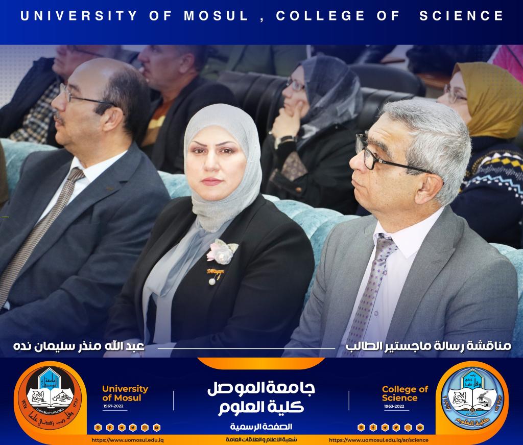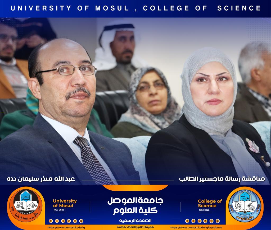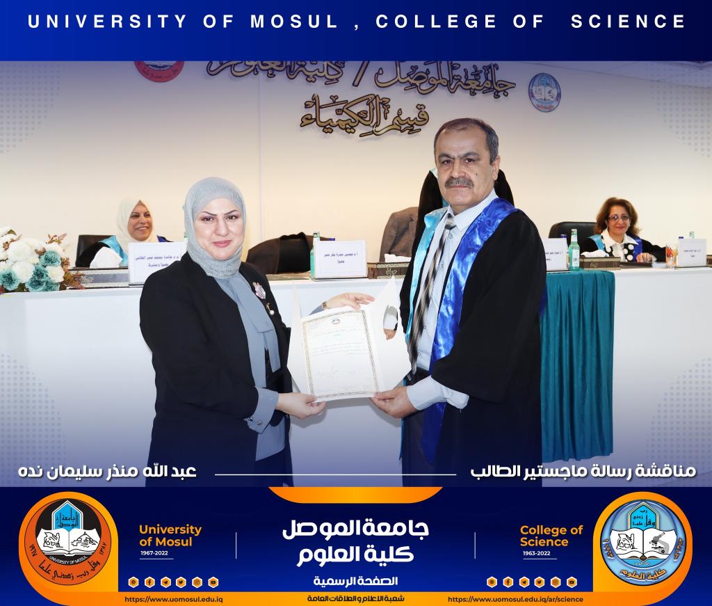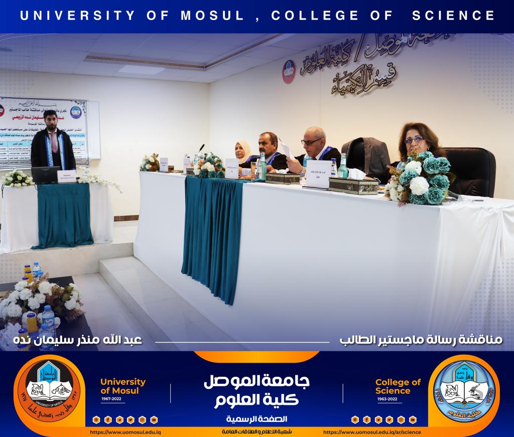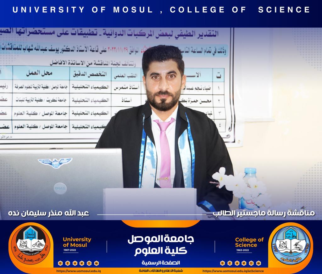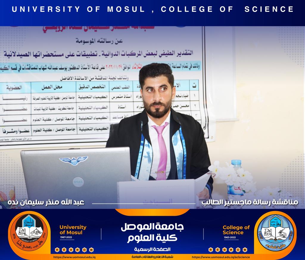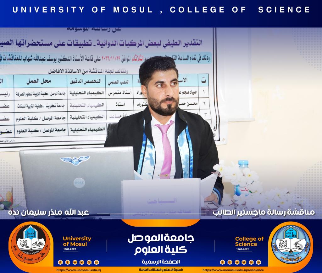 ناقش قسم الكيمياء في كلية العلوم بجامعة الموصل رسالة الماجستير الموسومة ” التقدير الطيفي لبعض المركبات الدوائية- تطبيقات على مستحضراتها الصيدلانية” يوم الثلاثاء الموافق 29 تشرين الثاني 2022.حضر جانباً منها السيدة عميد الكلية الأستاذ الدكتورة هيام عادل إبراهيم و السيد المعاون العلمي و السيد رئيس القسم وعدد من تدريسي الكلية .تناولت الرسالة التي تقدم بها الطالب ( عبد الله منذر سليمان ) في فرع الكيمياء التحليلية تطوير طريقة طيفية بسيطة وحساسة لتقدير كميات مايكروغراميَّة من السلفاميثوكسازول بشكله النقي وفي بعض مستحضراته الصيدلانيَّة , وتتضمن الطريقة أزوتة السلفاميثوكسازول مع كمية متكافئة من نتريت الصوديوم في وسط حامضي من حامض الهيدروكلوريك لتكوين أيون الديازونيوم المقابل ثم اقترانه مع كاشف 4- كلوروريزورسينول في محيط قاعدي لتكوين صبغة أزوية ذات لون برتقالي ذائبة في الماء ومستقرة الَّتي أعطت أعلى امتصاص عند الطول الموجي 498 نانوميتر.تضمنت الدراسة كذلك تطوير طريقة طيفية غير مباشرة لتقدير كميات مايكروغرامية من الترايمثوبريم. تعتمد الطريقة على أكسدة التراميثوبريم في الوسط الحامضي باستعمال زيادة معلومة من محلول ن- برومو سكسينميد, ثم قصر لون صبغة الانديكوكارمين بالعامل المؤكسد الفائض, بعدها يتم قياس المتبقي من الصبغة ذات اللون الأزرق عند الطول الموجي 610 نانوميتر. اضافة الى تطوير طريقة طيفيَّة غير مباشرة لتقدير الباراسيتامول في المحلول المائي باستعمال تفاعل الأَكسدة والاختزال , اعتمدت الطريقة على أكسدة الباراسيتامول بوساطة أيون الحديد الثلاثي ثم مفاعلة أيون الحديد الثنائي المتحرر مع الكاشف 4,7-ثنائي فنيل -1-10-فينانثرولين (الباثوفينانثرولين) , وتكوين معقد أحمر مستقر وذائب في الماء له أعلى امتصاص عند الطول الموجي 533 نانوميتر.ترأس لجنة المناقشة الأستاذ الدكتور ضياء نجم عبد الله الصبحة وعضوية كل من الأستاذ الدكتور محسن حمزة بكر من جامعة تكريت و الأستاذ المساعد الدكتورة لمياء عدنان نجيب سرسم ، وبإشراف وعضوية الأستاذ المساعد الدكتورة خالدة محمد عمر.شعبة الإعلام والعلاقات العامةالثلاثاء 29 تشرين الثاني 2022
