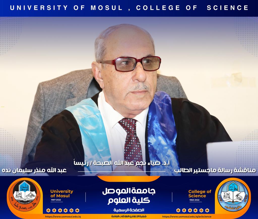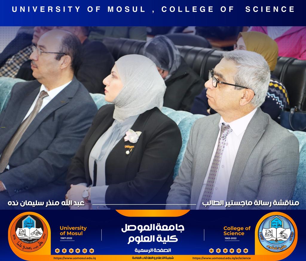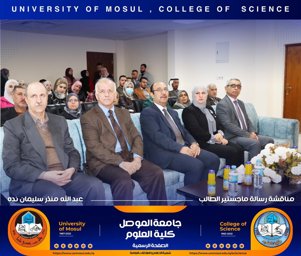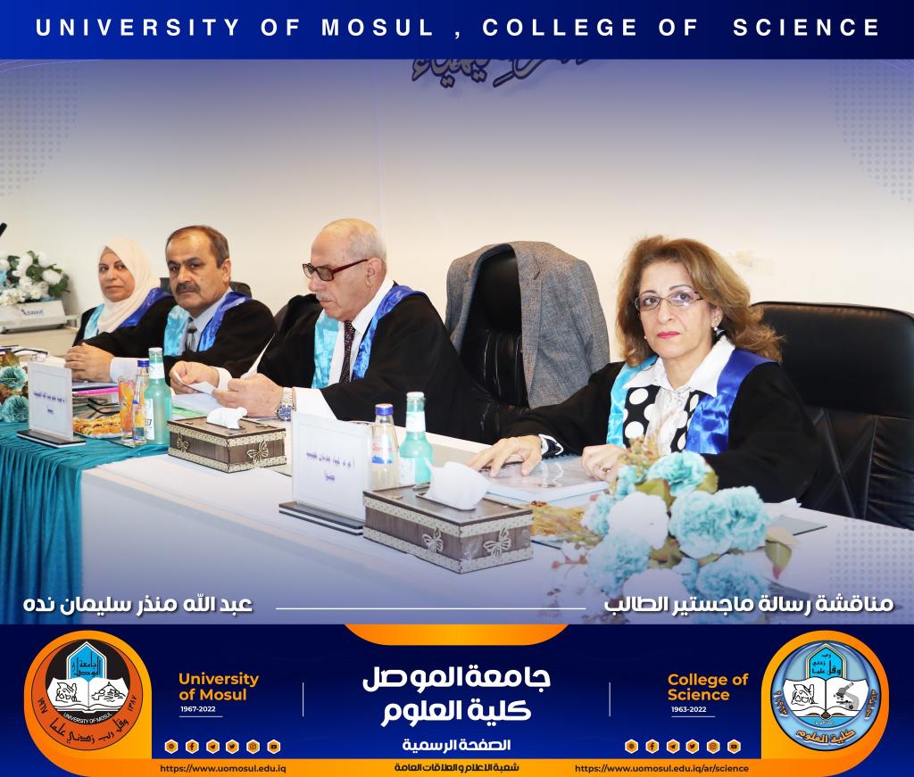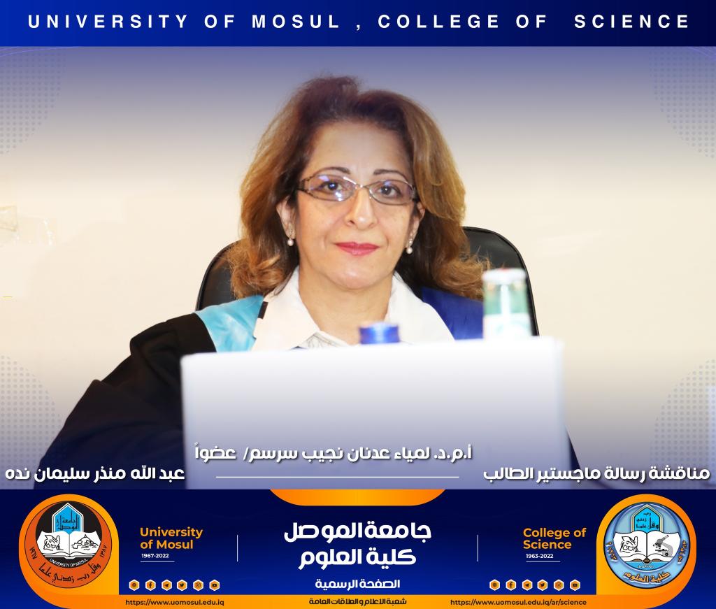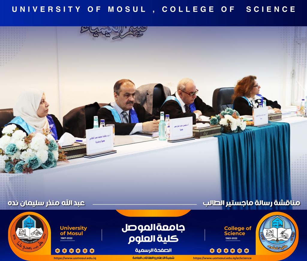 ناقش قسم الكيمياء في كلية العلوم بجامعة الموصل رسالة الماجستير الموسومة ” التقدير الطيفي لبعض المركبات الدوائية- تطبيقات على مستحضراتها الصيدلانية” يوم الثلاثاء الموافق 29 تشرين الثاني 2022.حضر جانباً منها السيدة عميد الكلية الأستاذ الدكتورة هيام عادل إبراهيم و السيد المعاون العلمي و السيد رئيس القسم وعدد من تدريسي الكلية .تناولت الرسالة التي تقدم بها الطالب ( عبد الله منذر سليمان ) في فرع الكيمياء التحليلية تطوير طريقة طيفية بسيطة وحساسة لتقدير كميات مايكروغراميَّة من السلفاميثوكسازول بشكله النقي وفي بعض مستحضراته الصيدلانيَّة , وتتضمن الطريقة أزوتة السلفاميثوكسازول مع كمية متكافئة من نتريت الصوديوم في وسط حامضي من حامض الهيدروكلوريك لتكوين أيون الديازونيوم المقابل ثم اقترانه مع كاشف 4- كلوروريزورسينول في محيط قاعدي لتكوين صبغة أزوية ذات لون برتقالي ذائبة في الماء ومستقرة الَّتي أعطت أعلى امتصاص عند الطول الموجي 498 نانوميتر.تضمنت الدراسة كذلك تطوير طريقة طيفية غير مباشرة لتقدير كميات مايكروغرامية من الترايمثوبريم. تعتمد الطريقة على أكسدة التراميثوبريم في الوسط الحامضي باستعمال زيادة معلومة من محلول ن- برومو سكسينميد, ثم قصر لون صبغة الانديكوكارمين بالعامل المؤكسد الفائض, بعدها يتم قياس المتبقي من الصبغة ذات اللون الأزرق عند الطول الموجي 610 نانوميتر. اضافة الى تطوير طريقة طيفيَّة غير مباشرة لتقدير الباراسيتامول في المحلول المائي باستعمال تفاعل الأَكسدة والاختزال , اعتمدت الطريقة على أكسدة الباراسيتامول بوساطة أيون الحديد الثلاثي ثم مفاعلة أيون الحديد الثنائي المتحرر مع الكاشف 4,7-ثنائي فنيل -1-10-فينانثرولين (الباثوفينانثرولين) , وتكوين معقد أحمر مستقر وذائب في الماء له أعلى امتصاص عند الطول الموجي 533 نانوميتر.ترأس لجنة المناقشة الأستاذ الدكتور ضياء نجم عبد الله الصبحة وعضوية كل من الأستاذ الدكتور محسن حمزة بكر من جامعة تكريت و الأستاذ المساعد الدكتورة لمياء عدنان نجيب سرسم ، وبإشراف وعضوية الأستاذ المساعد الدكتورة خالدة محمد عمر.شعبة الإعلام والعلاقات العامةالثلاثاء 29 تشرين الثاني 2022