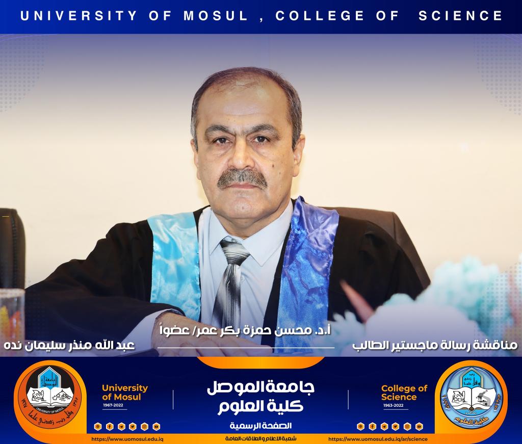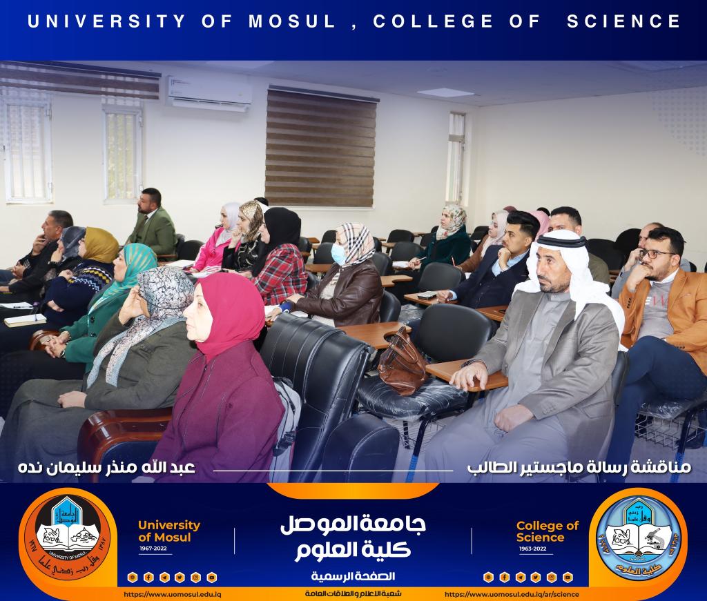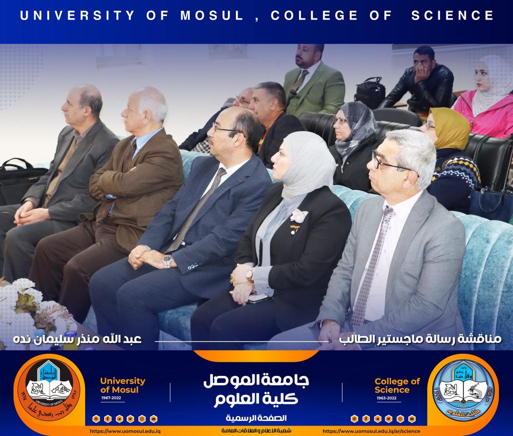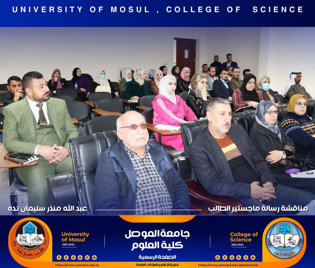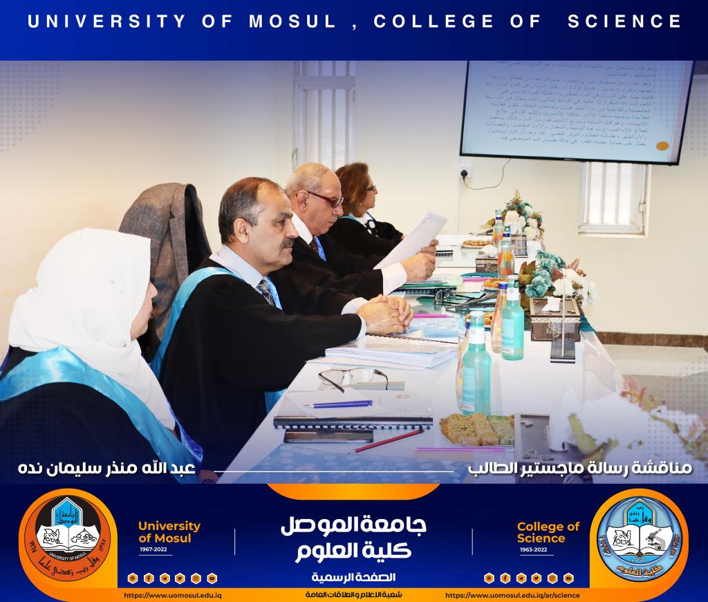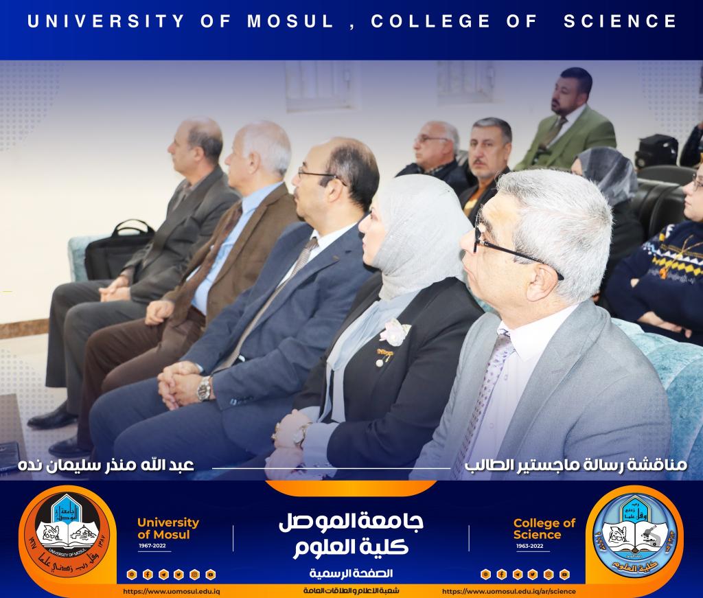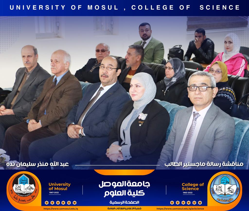 ناقش قسم الكيمياء في كلية العلوم بجامعة الموصل رسالة الماجستير الموسومة ” التقدير الطيفي لبعض المركبات الدوائية- تطبيقات على مستحضراتها الصيدلانية” يوم الثلاثاء الموافق 29 تشرين الثاني 2022.حضر جانباً منها السيدة عميد الكلية الأستاذ الدكتورة هيام عادل إبراهيم و السيد المعاون العلمي و السيد رئيس القسم وعدد من تدريسي الكلية .تناولت الرسالة التي تقدم بها الطالب ( عبد الله منذر سليمان ) في فرع الكيمياء التحليلية تطوير طريقة طيفية بسيطة وحساسة لتقدير كميات مايكروغراميَّة من السلفاميثوكسازول بشكله النقي وفي بعض مستحضراته الصيدلانيَّة , وتتضمن الطريقة أزوتة السلفاميثوكسازول مع كمية متكافئة من نتريت الصوديوم في وسط حامضي من حامض الهيدروكلوريك لتكوين أيون الديازونيوم المقابل ثم اقترانه مع كاشف 4- كلوروريزورسينول في محيط قاعدي لتكوين صبغة أزوية ذات لون برتقالي ذائبة في الماء ومستقرة الَّتي أعطت أعلى امتصاص عند الطول الموجي 498 نانوميتر.تضمنت الدراسة كذلك تطوير طريقة طيفية غير مباشرة لتقدير كميات مايكروغرامية من الترايمثوبريم. تعتمد الطريقة على أكسدة التراميثوبريم في الوسط الحامضي باستعمال زيادة معلومة من محلول ن- برومو سكسينميد, ثم قصر لون صبغة الانديكوكارمين بالعامل المؤكسد الفائض, بعدها يتم قياس المتبقي من الصبغة ذات اللون الأزرق عند الطول الموجي 610 نانوميتر. اضافة الى تطوير طريقة طيفيَّة غير مباشرة لتقدير الباراسيتامول في المحلول المائي باستعمال تفاعل الأَكسدة والاختزال , اعتمدت الطريقة على أكسدة الباراسيتامول بوساطة أيون الحديد الثلاثي ثم مفاعلة أيون الحديد الثنائي المتحرر مع الكاشف 4,7-ثنائي فنيل -1-10-فينانثرولين (الباثوفينانثرولين) , وتكوين معقد أحمر مستقر وذائب في الماء له أعلى امتصاص عند الطول الموجي 533 نانوميتر.ترأس لجنة المناقشة الأستاذ الدكتور ضياء نجم عبد الله الصبحة وعضوية كل من الأستاذ الدكتور محسن حمزة بكر من جامعة تكريت و الأستاذ المساعد الدكتورة لمياء عدنان نجيب سرسم ، وبإشراف وعضوية الأستاذ المساعد الدكتورة خالدة محمد عمر.شعبة الإعلام والعلاقات العامةالثلاثاء 29 تشرين الثاني 2022