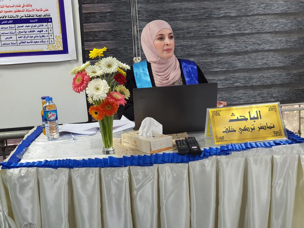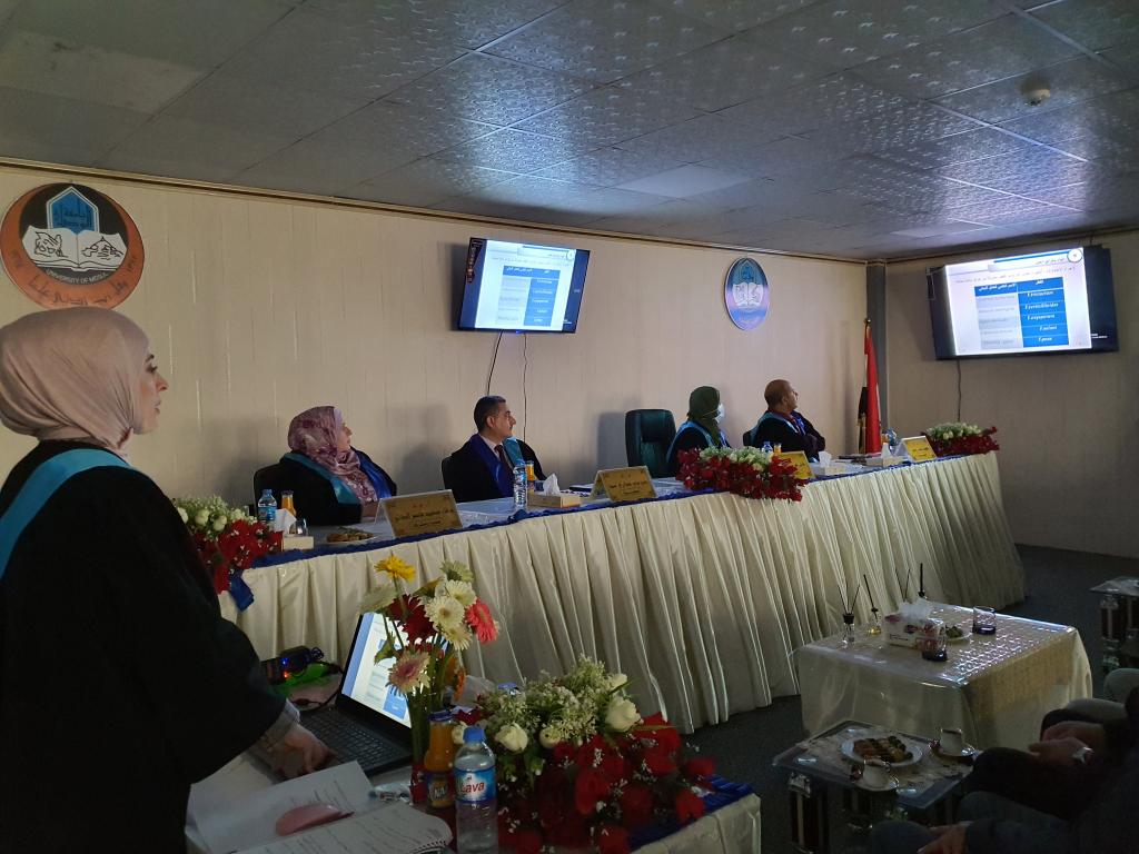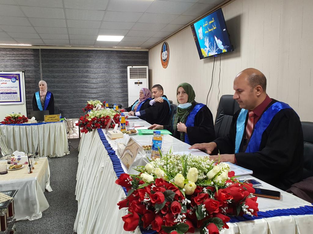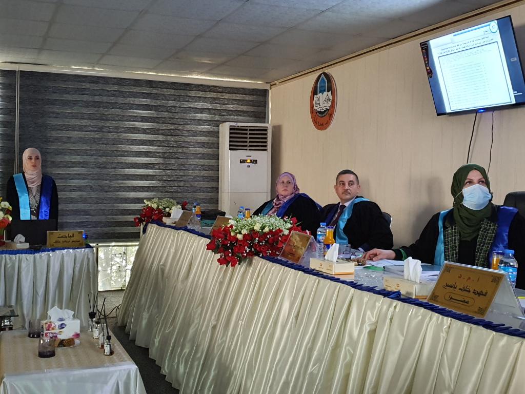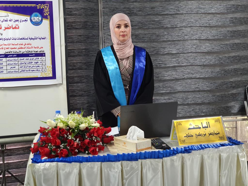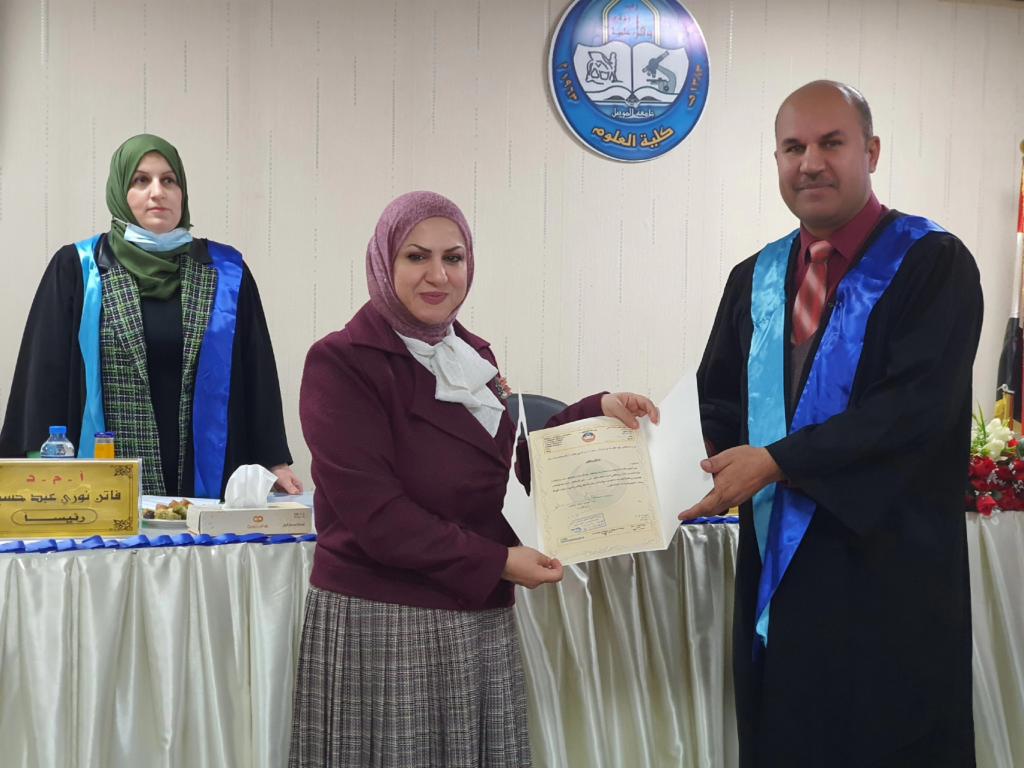 ناقشت كلية العلوم في جامعة الموصل يوم الثلاثاء الموافق 30 تشرين الثاني 2021 رسالة الماجستير ” الفعالیة التثبیطیة لمستخلصات نباتات البابونج واكلیل الجبل والكركم ضد انواع الفطر sp. Fusaruim) ) حضر جانباً منها الأستاذ المساعد الدكتورة هيام عادل الطائي عميد الكلية والسيد المعاون العلمي والسيد عميد كلية الزراعة والغابات الأستاذ الدكتور محمد يونس العلاف والسادة معاونيه وعدداً من تدريسي الكلية.تناولت الدراسة التي تقدمت بها الطالبة ( تماضر تركي خلف ) من قسم علوم الحياة عزل وتشخیص ستة عشر عزلة عائدة لانواع الجنس Fusarium من جذور نباتات زینة ومحاصیل خضر ، تم اختبار القدرة الامراضیة لخمسة عزلات وهي 1 oxysporum.F ,oxysporum2.F ، 3 solani.F، 4 solani.F و5 poae. . واختبار تأثیر المستخلصات الكحولیة لنباتات الكركم والجبل واكلیل والبابونج على العزلات اعلاه . كما تم الكشف عن بعض المركبات الفعالة وتقدیر محتواها في المستخلص الكحولي للكركم و المستخلص الكحولي لأوراق اكلیل الجبل، اذ احتوى كل منها على الفینولات والفلافونیدات، .تم استخلاص المركب الفعال الكركمین من نبات الكركم وشخص باستخدام جهاز كروماتوغرافیا السائل العالي الاداء HPLC و بمحتوى یقدر بـ gm/mg 189.0 و تم استخلاص المركب الفعال لنبات اكلیل الجبل وهو الزیت الطیار وشخص باستخدام جهاز كر و ماتو غرافیا الغاز MS/GC وتم تقدیر محتواه البالغ 9.48 %من المحتوى الكلي للأور اق . و في اختبار تأثیر جسیمات او كسید النحاس النانویة NPS CuO ضد نمو مستعمرات عزلات الجنس Fusarium لو حظ عدم وجود قیود في النمو الشعاعي للمستعمرات عند جمیع التراكیز المستخدمة الا ان هناك انخفاض في كثافة الغزل الفطري للمستعمرات.هدفت الدراسة الى ما يلي :1- عزل وتشخیص انواع الجنس Fusarium من جذور نباتات زینة ومحاصیل خضر وتشخیص انواع الجنس Fusarium جزیئیا باستعمال تفاعل البلمرة المتسلسل وتقانة تتابع القواعد النیتروجینیة في سلسلة الحامض النووي .2- اختبار تأثیر الراشح الفطري لبعض انواع الجنس Fusarium في انبات البذورواختبار الفاعلیة التثبیطیة للمستخلصات الكحولیة لنباتات الكركم و اكلیل الجبل و البابونج ضد بعض انواع الجنس Fusarium.3- اجراء الكشف الكیمیائي للمركبات الفعالة لنباتي الكركم واكلیل الجبل باستخدام تقانة HPLC و MS/GC و استخلاصها واختبار فاعلیتها التثبیطیة ضد انواع الفطر .4- اختبار تأثیر التراكیز المختلفة للمبید الكیمیائيBeltanol ضد انواع Fusarium spp و اختبار الفاعلیة التثبیطیة لجسیمات اوكسید النحاس النانویة ضد بعض انواع الجنس .Fusariumترأس لجنة المناقشة الاستاذ المساعد الدكتورة فاتن نوري عبد حسين وعضوية كل من الاستاذ المساعد الدكتور فهد خلف ياسين و المدرس الدكتور زكريا سامي عبد الرزاق وبأشراف وعضوية الاستاذ المساعد الدكتورة ورقاء سعيد قاسم الطائي .قدمت السيدة عميد الكلية كتاب شكر إلى أ. م. د. فهد خلف ياسين من الجامعة التقنية الشمالية / قسم الشؤون العلمية لمناقشة الطالبة لمشاركته في مناقشة الطالبة .
