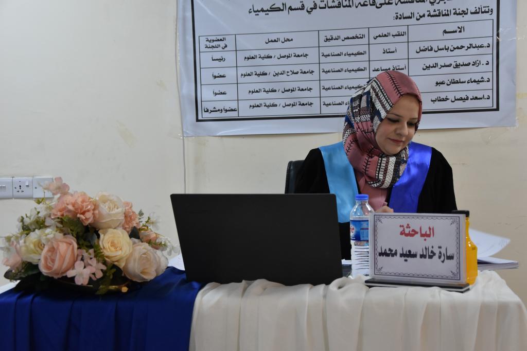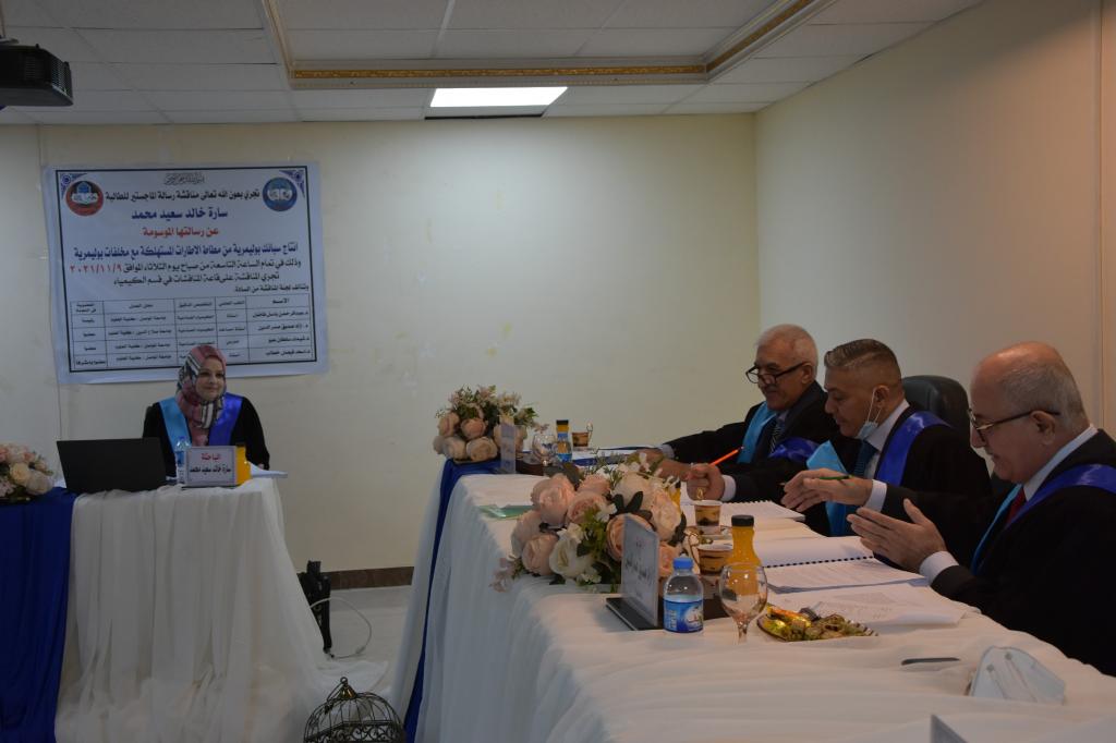 ناقشت كلية العلوم في جامعة الموصل يوم الثلاثاء الموافق 9 تشرين الثاني 2021 رسالة الماجستير الموسومة ” انتاج سبائك بوليمرية من مطاط الاطارات المستهلكة مع مخلفات بوليمرية ” حضر جانباً منها السيدة عميد الكلية الأستاذ المساعد الدكتورة هيام عادل الطائي و السيد المعاون العلمي الدكتور محمد صبحي وعدداً من تدريسيي الكلية .تناولت الرسالة التي تقدمت بها الطالبة ( سارة خالد سعيد ) في قسم الكيمياء/ فرع الكيمياء الصناعية استعمال نفايات المطاط كمادة أولية لإدخال مجاميع كاربوكسيلية فعالة إلى المطاط المفلكن المكون لها وتحويلهُ إلى مطاط كاربوكسيلي مباشرة دون الحاجة إلى فصل المواد المضافة أو إسترداد المطاط لوحده.استعملت ثلاثة أنواع من المواد الكاربوكسيلية الفعالة للتفاعل وهي أنهدريد المالئيك (MAn) و N(2,5-dimethoxy phenyl ) maleimic acid(MAdm)و (MAca) N(3-Carboxy phenyl)maleimic acid .حيث أجري التفاعل داخل إناء مغلق وباستعمال بيروكسيد البنزويل كمادة بادئة. بعد ذلك تم إجراء تفاعلات للمواد الجديدة المحضرة مع نفايات الورق ونفايات بولي ترفثالات الاثيلين PET. حيث استعمل المطاط مع MAn في إنتاج سبائك متجانسة مع نفايات الورق التالف . أما المطاط الكاربوكسيلي الناتج من تفاعل المطاط مع أحماض الماليميكMAca, MAdm فأنتج منه سبائك مع PET , كما أنتجت سبيكة من الورق مع PET مع المطاط +MAdm .كما تمت دراسة العزل الحراري للسبائك الناتجة المتجانسة مع تحويلها إلى رغوات.وكذلك الى استغلال نفايات اطارات السيارات المطاطية لانتاج سبائك مختلفة مع نفايات الورق ونفايات البولي تريفثالات الاثيلين واستخدام هذه السبائك في انتاج الواح تستخدم كعوازل حرارية. استنتجت الدارسة انه بالامكان تحويل مطاط الاطارات التالفة الى مطاط كاربوكسيلي مباشرة بدون فصله عن مكونات الاطارات الاحرى او فك الفلكنة بواسطة التفاعل المباشر مع انهدريد المالئيك واحماض الماليميكترأس لجنة المناقشة الأستاذ الدكتور عبد الرحمن باسل وعضوية كل من الأستاذ المساعد الدكتور آزاد صدر الدين و المدرس الدكتورة شيماء سلطان وبإشراف وعضوية الاستاذ الدكتور أسعد فيصل خطاب .قدمت السيدة عميد الكلية كتاب شكر وتقدير الى الممتحن الخارجي الأستاذ المساعد الدكتور آزاد صديق صدر الدين من جامعة صلاح الدين/ كلية العلوم ؛ لتحمله عناء السفر وحضور المناقشة .