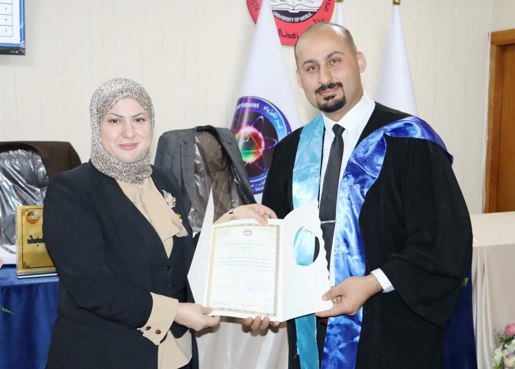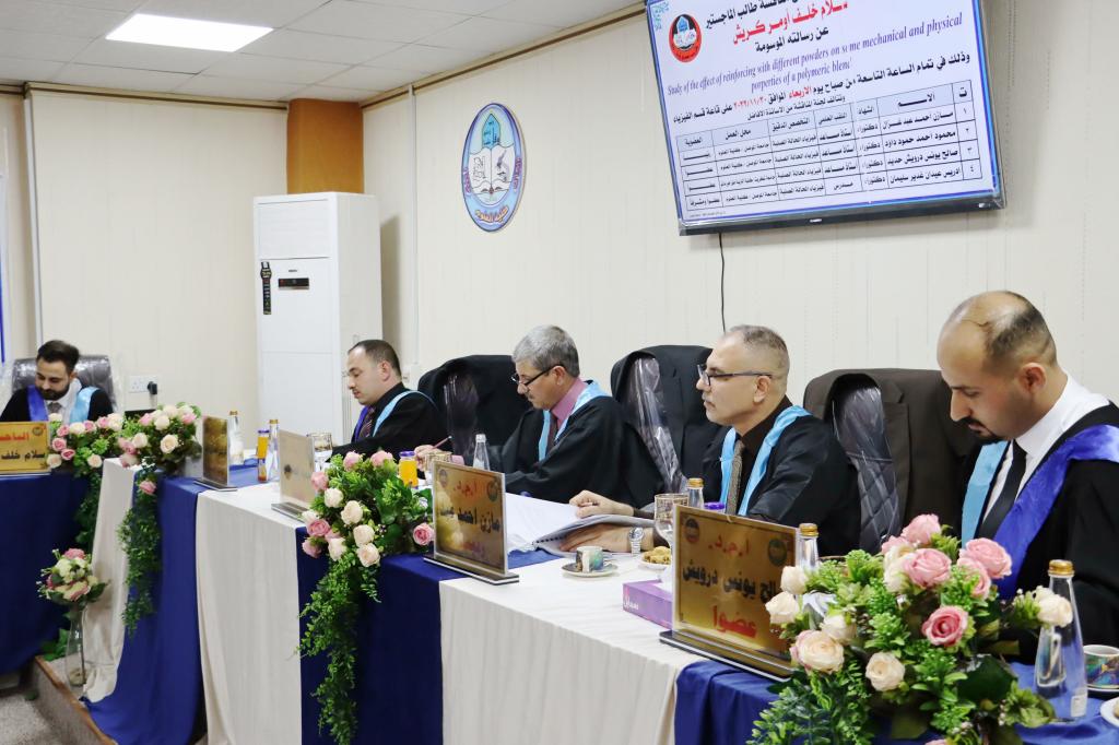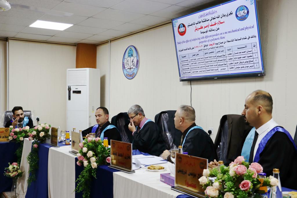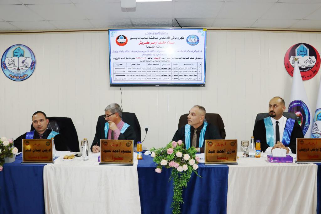 ناقش قسم الفيزياء في كلية العلوم بجامعة الموصل يوم الأربعاء الموافق 30 تشرين الثاني 2022 رسالة الماجستير الموسومة ” دراسة تأثير التقوية بمساحيق مختلفة على بعض الخواص الميكانيكية والفيزيائية لخليط البوليمري ” .حضر جانباً من المناقشة السيدة عميد كلية العلوم الاستاذ الدكتورة هيام عادل والسيد المعاون العلمي اضافة الى عدد من تدريسيي الكلية وطلبة الدراسات العليا .تناولت الرسالة التي تقدمت بها الطالب ( سلام خلف أومر ) تحضير مادة مركبة تتكون من مزيج بوليمري تم تحضيره بخلط نوعين من راتنجات الايبوكسي بنسبة نسبية (50:50). تم تعزيز هذا المزيج بواسطة مواد مالئة مختلفة بما في ذلك (CNP) و (Al2O3) و (NiO) و (ZnO) بأجزاء مختلفة من الوزن. ولتقييم أداء هذه المواد أجريت دراسة للتعرف على تأثير الكسر الوزني لمواد التدعيم على الخواص الميكانيكية والفيزيائية للمركبات المحضرة من هذه المواد.تطرقت الدراسة الى تقديم اختبارات (SEM) وقوة الشد والضغط والصلادة والتوصيل الحراري والتجانس . تُظهر صور SEM سطح بنية لمادة الاساس غير مدعومة، والتي تبدو شبه متجانسة.أظهرت النتائج انخفاضًا ملحوظًا في قيم مقاومة الشد ومعامل الشد للمرونة عند نقطة الكسر، حيث يزداد جزء وزن المساحيق مقارنةً بالمادة الاساس. أظهرت نتائج اختبار الانضغاط عكس السلوك السابق. على الجانب الآخر، فإن زيادة وزن المسحوق يزيد من صلادة الشور D. (Al2O3) قدمت قيم أعلى من المادة الاساس والمركبات الأخرى. كما وجدت أن الموصلية الحرارية لمركب (NiO) كانت الأعلى مقارنة بالآخرين.ترأس لجنة المناقشة الأستاذ المساعد الدكتور مازن أحمد عبد غزال رئيس قسم الفيزياء وعضوية كل من الأستاذ المساعد الدكتور محمود أحمد حمود والأستاذ المساعد الدكتور صالح يونس درويش كلية التربية جامعة تكريت وعضوية وإشراف المدرس الدكتور إدريس عيدان غدير .شعبة الإعلام والعلاقات العامةالأربعاء 30 تشرين الثاني 2022