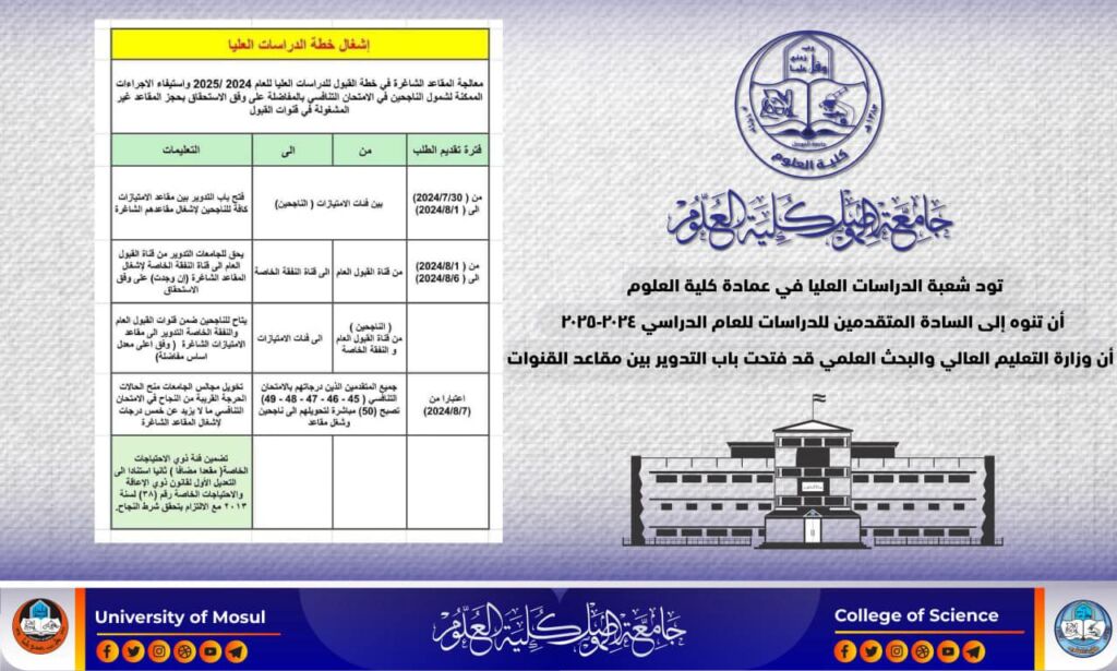 كلية العلوم تعلن عن أوائل المراحل الثانية وتسلسلاتهم ولكافة الأقسام للعام الدراسي 2023-2024: