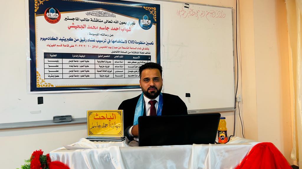 ناقشت كلية العلوم في جامعة الموصل اليوم الخميس الموافق 10 من شباط 2022 رسالة الماجستير الموسومة ” تحسين منظومة CVD لاستخدامها في ترسيب غشاء رقيق من كبريتيد الكادميوم” حضر جانباً منها المعاون الإداري الدكتور عمر عادل شريف والمعاون العلمي الدكتور محمد صبحي الجادر و عدداً من تدريسيي القسم .تناولت الرسالة التي تقدم بها الطالب ( شهاب احمد جاسم الجحيشي ) من قسم الفيزياء تحضير الأغشية الرقيقة من كبريتيد الكادميومCdS على أرضيات زجاجية بطريقة الترسيب بالبخار الكيميائي وذلك من خلال المنظومة التي تم اجراء التحويرات عليها والمصممة سابقاً في قسم الفيزياء . حيث أن تحضير هذه النماذج من الأغشية تم بظروف ترسيب مختلفة وهي تغيير تراكيز المواد الكيميائية , تغيير المسافة بين النماذج و سطح المحلول , تغيير درجة حرارة التلدين , بزمن تلدين ثابت واخيراً تأثير تغير زمن التلدين عند درجة حرارة تلدين ثابتة .تم إستخدام طيف الأشعة السينية للأغشية المحضرة في حساب قيم أبعاد الحبيبات من خلال معادلة شيرر حيث أعطت قيم مقاربة لقيم صور المجهر الالكتروني الماسح SEM وكذلك تم إيجاد معاملات ملر لهذه القمم . كذلك لدراسة الخواص الكهربائية فقد تم ترسيب أغشية من الكاربون فوق أغشيةCdS لتحضير مفرقCdS-carbon بتقنيتين هما منظومة الترسيب بالبلازمة والمنظومة المصممة وتم دراسة خواص ألتيار – ألفولتية للمفرق للنماذج المحضرة بكلا التقنيتين كما تمت دراسة مدى تحسس المفرق للأشعة فوق البنفسجية ذي الشدة الواطئة .ترأس لجنة المناقشة الأستاذ مساعد الدكتور عبدالله ادريس وعضوية كلا من أ.م.د. محمد علوان حمزة عبد من جامعة بغداد و م. د. ادريس عيدان وعضوية واشراف أ.د. أنور مصطفى عزت .قدّم السيد المعاون العلمي نيابةً عن السيدة عميد الكلية الأستاذ المساعد الدكتورة هيام عادل إبراهيم كتاب شكر وتقدير الى الدكتور محمد علوان حمزة من كلية العلوم / جامعة بغداد لتكبده عناء السفر وحضور المناقشة .
