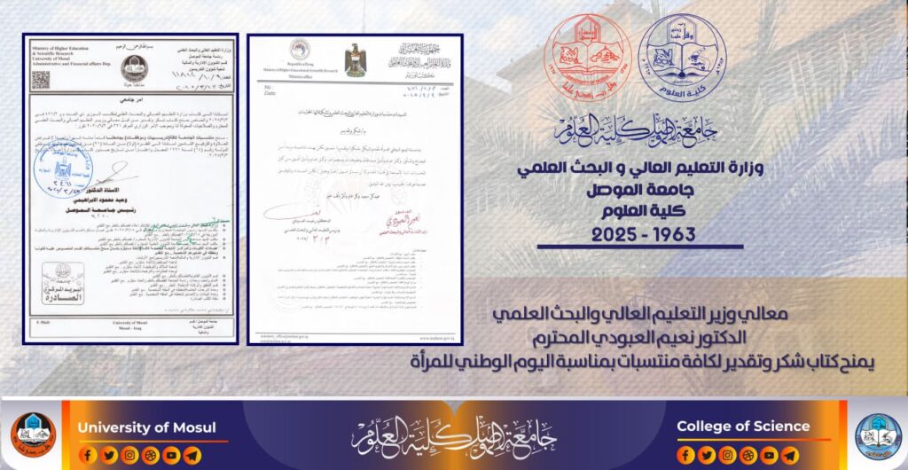 نوقشت في قسم الفيزياء بكلية العلوم / جامعة الموصل رسالة الماجستير الموسومة ” تحضير المركب Bi-AgxBa2-ySryCa2CO2C3O10+8 الفائق التوصيل عند درجات الحرارة العالية ودراسة تأثير التلدين المتكرر على الخصائص التركيبية والكهربائية للمركب ” يوم الاربعاء الموافق ٢٦ آذار ٢٠٢٥ ,حضر جانباً منها السيدة عميد الكلية الأستاذ الدكتورة هيام عادل إبراهيم المحترمة والسيد المعاون الأداري أ.م.د. عمر عادل شريف والسيد رئيس القسم وعدد من تدريسيي وطلبة القسم المحترمين.
