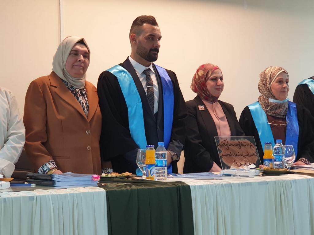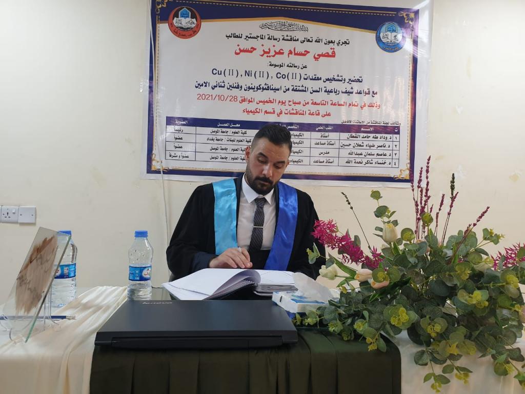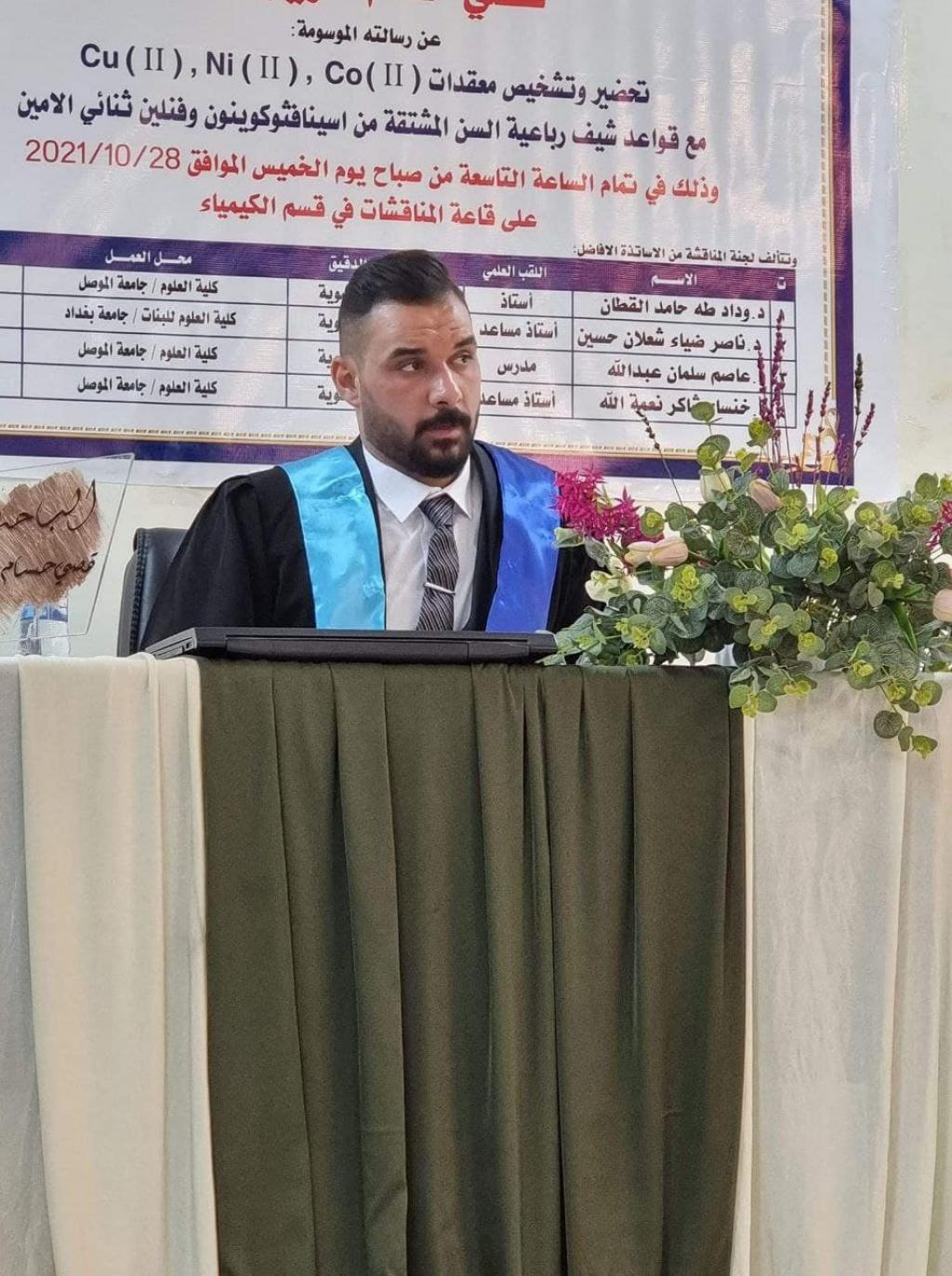 ناقشت كلية العلوم في جامعة الموصل يوم الخميس الموافق 28 تشرين الأول 2021 رسالة الماجستير الموسومة ” تحضير وتشخيص معقدات Cu(II), Ni(II), Co(II) مع قواعد شيف رباعية السن المشتقة من اسينافثوكوينون و فنلين ثنائي الأمين “حضر جانباً منها السيدة عميد الكلية الأستاذ المساعد الدكتورة هيام عادل الطائي و السيد المعاون العلمي الأستاذ المساعد الدكتور محمد صبحي و السيد رئيس القسم الدكتور أسعد فيصل خطاب وعدد من تدريسيي الكلية .تناولت الرسالة التي تقدم بها الطالب ( قصي حسام عزيز ) في فرع الكيمياء اللاعضوية ، تحضير ستة ليكاندات من قواعد شيف وذلك بتكاثف Acenaphthenequinon مع كل من para-phenylenediamine او meta-phenylenediamine او 4-methyl-o-phenylenediamine او 4-nitro-o-phenylenediamine.تطرقت الدراسة الى تفاعلات الليكاندات مع املاح كلوريدات كل من Zn(II), Cu(II), Ni(II), Co(II) لتحضير نوعين من المعقدات.تهدف الدراسة الى ان الليكاندات L6, L4, L2, L1 سلكت بوصفها ليكالندات رباعية السن من نوع N2O2 اذ تناسقت مع الايونات الفلزية Co(II) وNi(II) وCu(II) و Zn(II) من خلال ذرات نتروجين مجاميع الازوميثين (C=N) فضلا عن ذرات اوكسجين مجاميع الكاربونيل (C=O) الطرفية. ومن نوع N4 لليكاندات L3 وL5 والتي تتناسق مع الايونات الفلزية من خلال ذرات نتروجين مجاميع الازوميثين (C=N) وذرات نتروجين مجاميع الامين الطرفية.ونتج عن الدراسة ان الليكاندات L6, L4, L2, L1 سلكت بوصفها ليكالندات رباعية السن من نوع N2O2 اذ تناسقت مع الايونات الفلزية Co(II) وNi(II) وCu(II) و Zn(II) من خلال ذرات نتروجين مجاميع الازوميثين (C=N) فضلا عن ذرات اوكسجين مجاميع الكاربونيل (C=O) الطرفية. ومن نوع N4 لليكاندات L3 وL5 والتي تتناسق مع الايونات الفلزية من خلال ذرات نتروجين مجاميع الازوميثين (C=N) وذرات نتروجين مجاميع الامين الطرفية.ترأس لجنة المناقشة الأستاذ الدكتور وداد طه حامد القطان , وعضوية كل من الأستاذ المساعد الدكتور ناصر ضياء شعلان حسين , والمدرس الدكتور عاصم سلمان عبدالله ، وبإشراف وعضوية الأستاذ المساعد الدكتور خنساء شاكر نعمة الله.قدمت السيدة العميد كتاب شكر وتقدير الى الممتحن الخارجي الاستاذ المساعد الدكتور ناصر ضياء شعلان حسين / جامعة بغداد ؛ لتحمله عناء السفر و حضور المناقشة .