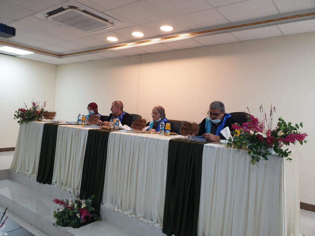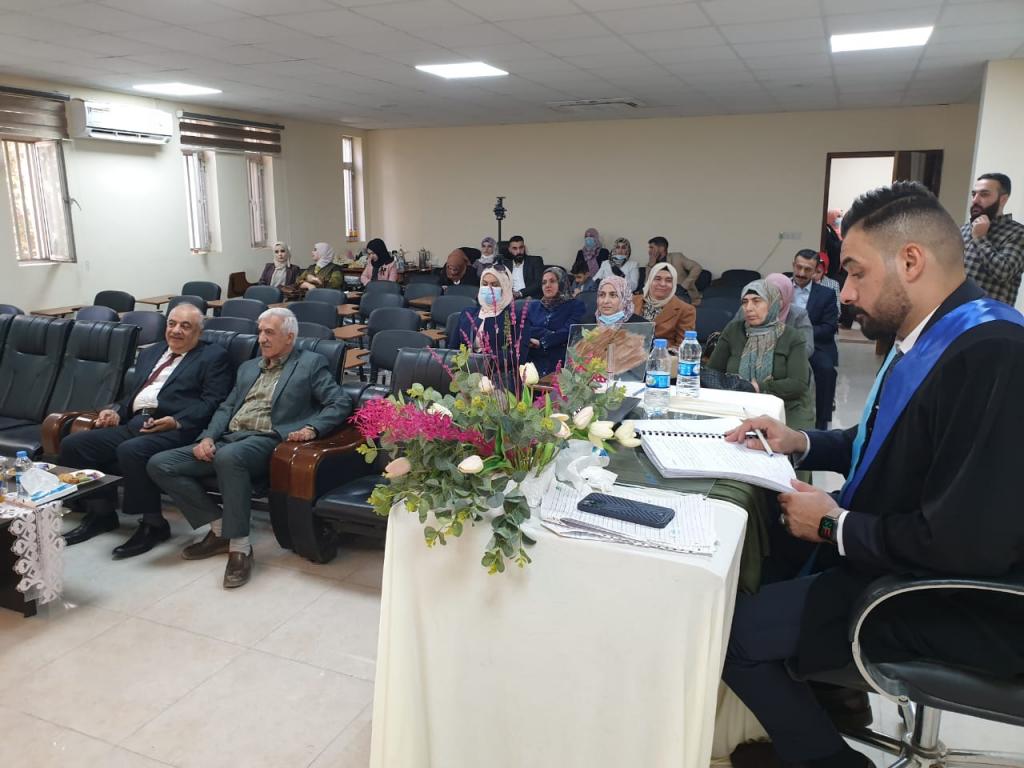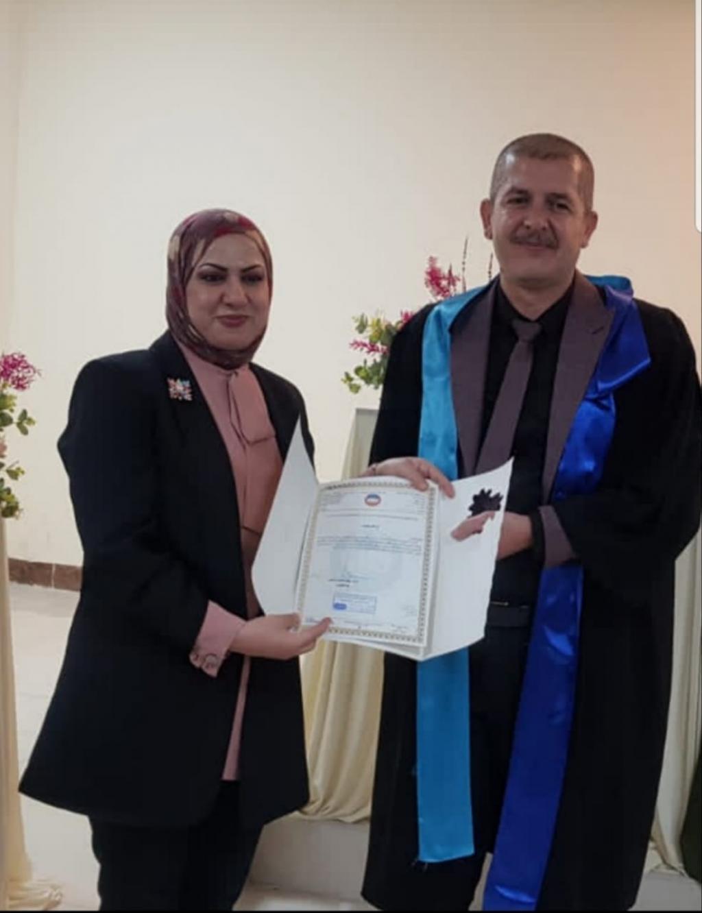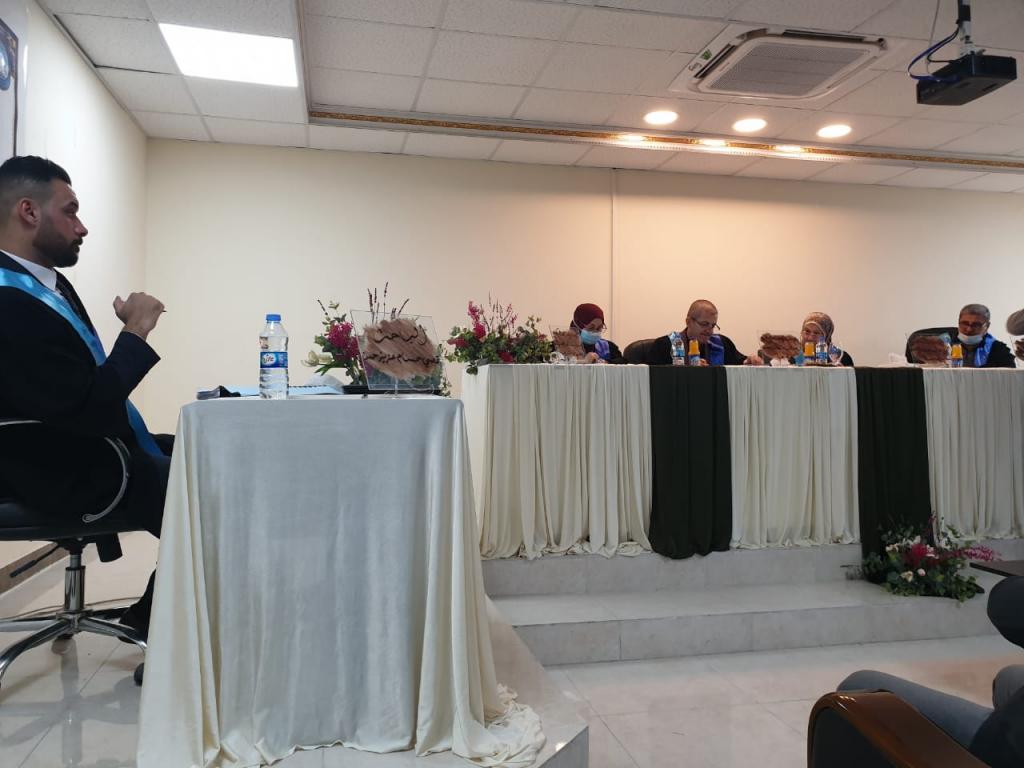 ناقشت كلية العلوم في جامعة الموصل يوم الخميس الموافق 28 تشرين الأول 2021 رسالة الماجستير الموسومة ” تحضير وتشخيص معقدات Cu(II), Ni(II), Co(II) مع قواعد شيف رباعية السن المشتقة من اسينافثوكوينون و فنلين ثنائي الأمين “حضر جانباً منها السيدة عميد الكلية الأستاذ المساعد الدكتورة هيام عادل الطائي و السيد المعاون العلمي الأستاذ المساعد الدكتور محمد صبحي و السيد رئيس القسم الدكتور أسعد فيصل خطاب وعدد من تدريسيي الكلية .تناولت الرسالة التي تقدم بها الطالب ( قصي حسام عزيز ) في فرع الكيمياء اللاعضوية ، تحضير ستة ليكاندات من قواعد شيف وذلك بتكاثف Acenaphthenequinon مع كل من para-phenylenediamine او meta-phenylenediamine او 4-methyl-o-phenylenediamine او 4-nitro-o-phenylenediamine.تطرقت الدراسة الى تفاعلات الليكاندات مع املاح كلوريدات كل من Zn(II), Cu(II), Ni(II), Co(II) لتحضير نوعين من المعقدات.تهدف الدراسة الى ان الليكاندات L6, L4, L2, L1 سلكت بوصفها ليكالندات رباعية السن من نوع N2O2 اذ تناسقت مع الايونات الفلزية Co(II) وNi(II) وCu(II) و Zn(II) من خلال ذرات نتروجين مجاميع الازوميثين (C=N) فضلا عن ذرات اوكسجين مجاميع الكاربونيل (C=O) الطرفية. ومن نوع N4 لليكاندات L3 وL5 والتي تتناسق مع الايونات الفلزية من خلال ذرات نتروجين مجاميع الازوميثين (C=N) وذرات نتروجين مجاميع الامين الطرفية.ونتج عن الدراسة ان الليكاندات L6, L4, L2, L1 سلكت بوصفها ليكالندات رباعية السن من نوع N2O2 اذ تناسقت مع الايونات الفلزية Co(II) وNi(II) وCu(II) و Zn(II) من خلال ذرات نتروجين مجاميع الازوميثين (C=N) فضلا عن ذرات اوكسجين مجاميع الكاربونيل (C=O) الطرفية. ومن نوع N4 لليكاندات L3 وL5 والتي تتناسق مع الايونات الفلزية من خلال ذرات نتروجين مجاميع الازوميثين (C=N) وذرات نتروجين مجاميع الامين الطرفية.ترأس لجنة المناقشة الأستاذ الدكتور وداد طه حامد القطان , وعضوية كل من الأستاذ المساعد الدكتور ناصر ضياء شعلان حسين , والمدرس الدكتور عاصم سلمان عبدالله ، وبإشراف وعضوية الأستاذ المساعد الدكتور خنساء شاكر نعمة الله.قدمت السيدة العميد كتاب شكر وتقدير الى الممتحن الخارجي الاستاذ المساعد الدكتور ناصر ضياء شعلان حسين / جامعة بغداد ؛ لتحمله عناء السفر و حضور المناقشة .