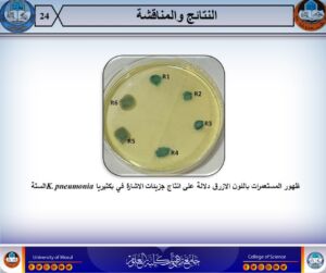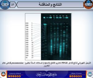قدمت الطالبة رسلية يونس محمود أحمد من فرع الأحياء المجهرية دراسة متكاملة ركّزت على الكشف عن قدرة سلالات Klebsiella pneumoniae على إنتاج جزيئات الإشارة ضمن ظاهرة Quorum Sensing (QS)، إضافة إلى تحري تأثير تراكيز مختلفة من فيتامين C في تثبيط إنتاج هذه الجزيئات عبر ظاهرة Quorum Quenching (QQ). كما اعتمدت الدراسة لأول مرة محليًا تقنية PFGE لتحديد العلاقة الوراثية بين السلالات ومصدر العدوى.