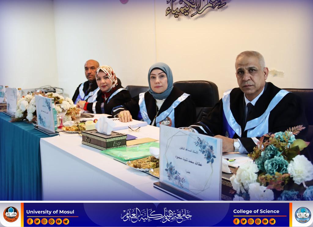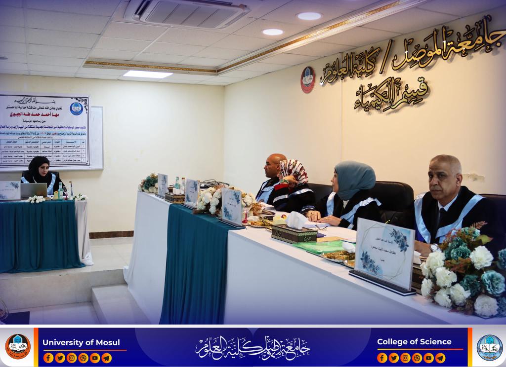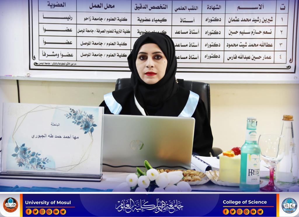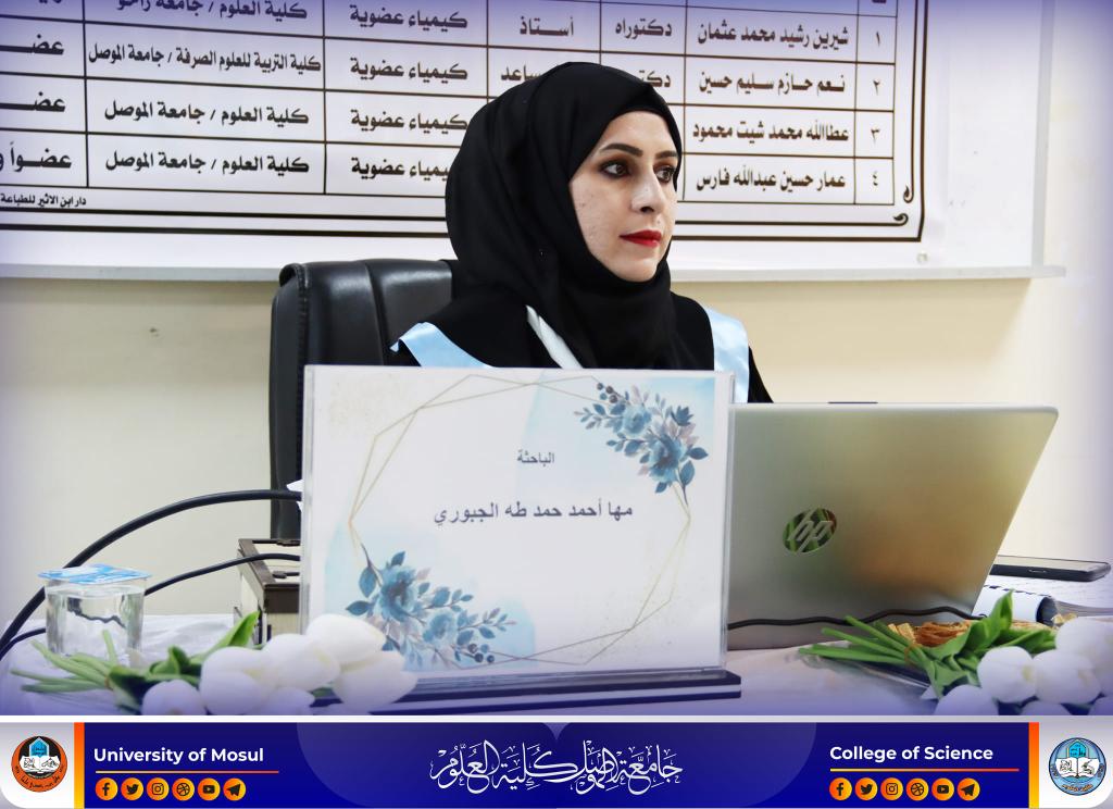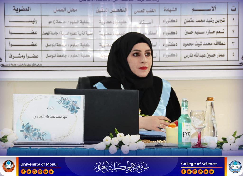 ناقش قسم الكيمياء في كلية العلوم بجامعة الموصل رسالة ماجستير بعنوان ” تشييد بعض المركبات الحلقية غير المتجانسة الجديدة المشتقة من الهيدرازايد ودراسة فعاليتها البايولوجية ” يوم الخميس الموافق 9 آذار 2023.حضر جانباً منها السيدة عميد كلية العلوم الأستاذ الدكتورة هيام عادل إبراهيم و معاونيها للشؤون العلمية و الإدارية و السيد مقرر القسم و عدد من تدريسي الكلية.تناولت الرسالة التي تقدمت بها الطالبة (مها أحمد حمد طه الجبوري) من فرع الكيمياء العضوية تحضير المركبات الحلقية غير المتجانسة الجديدة المشتقة من الهيدرازيد عبر أربعة مسارات مبتدءاً بتحضير المادة الأولية(B3)،إذ حُضّرَت المادة الأوليةN-(4-(hydrazine carbonyl) phenyl)-4- methyl benzene sulfonamideبثلاث خطوات :الخطوة الأولى تضمنت تحضير4-امينو ايثيل بنزويت(B1) وذلك من خلال تفاعل 4-امينو حامض البنزويك والايثانول المطلق بوجود حامض الكبريتيك ، وبعدها الخطوة الثانية مفاعلة المركب ( (B1مع بارا-تلوين سلفونيل كلورايد لينتج لدينا المركب (B2)Ethyl 4-(4-methyl phenyl sulfonamido) benzoate , أما الخطوة الثالثة فهي مفاعلة المركب(B2)مع الهيدرازين وبوجود الايثانول ليعطي المادة الأولية الهيدرازايد (B3).ترأس لجنة المناقشة الأستاذ الدكتورة شيرين رشيد محمد عثمان من جامعة زاخو وعضوية كل من الأستاذ المساعد الدكتورة نعم حازم سليم حسين و الأستاذ المساعد الدكتور عطا الله محمد شيت محمود ، وبإشراف وعضوية الأستاذ المساعد الدكتور عمار حسين عبد الله فارس.