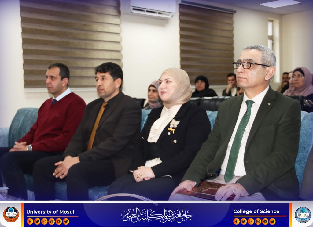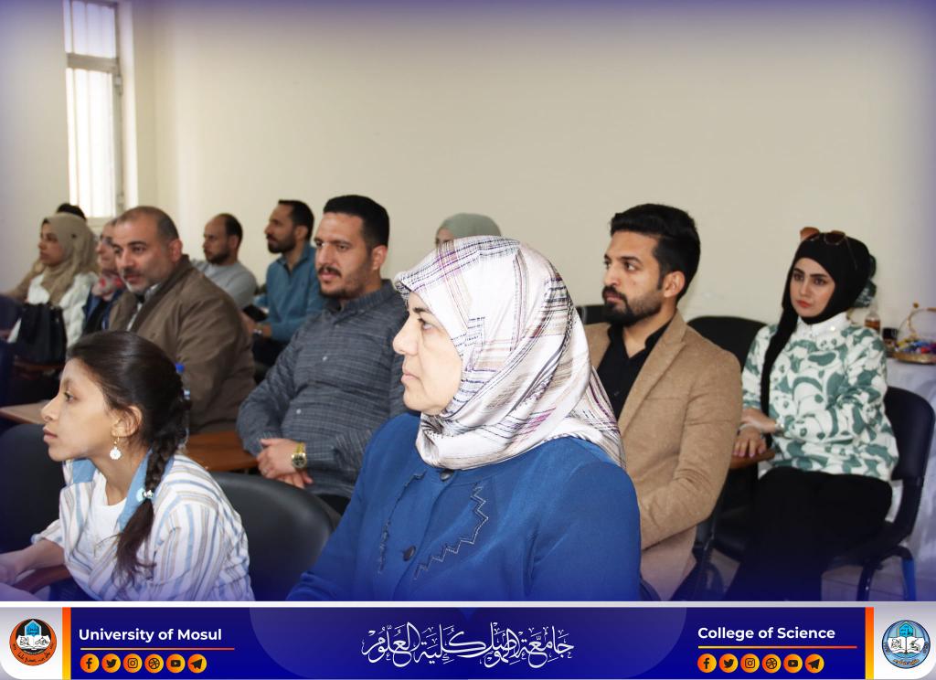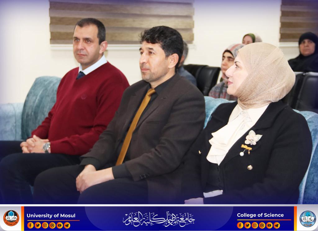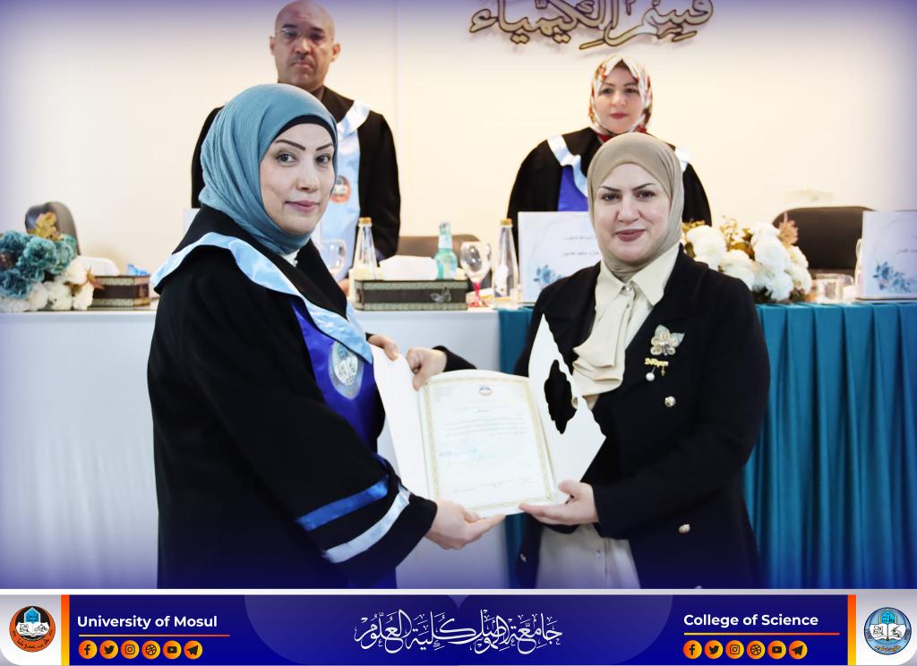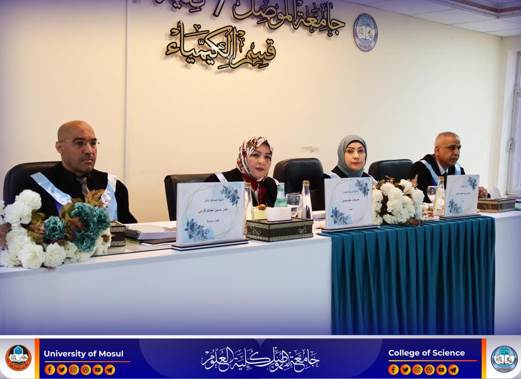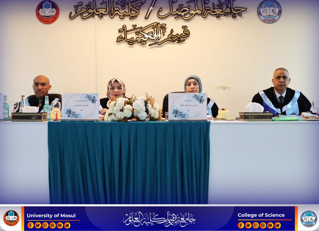 ناقش قسم الكيمياء في كلية العلوم بجامعة الموصل رسالة ماجستير بعنوان ” تشييد بعض المركبات الحلقية غير المتجانسة الجديدة المشتقة من الهيدرازايد ودراسة فعاليتها البايولوجية ” يوم الخميس الموافق 9 آذار 2023.حضر جانباً منها السيدة عميد كلية العلوم الأستاذ الدكتورة هيام عادل إبراهيم و معاونيها للشؤون العلمية و الإدارية و السيد مقرر القسم و عدد من تدريسي الكلية.تناولت الرسالة التي تقدمت بها الطالبة (مها أحمد حمد طه الجبوري) من فرع الكيمياء العضوية تحضير المركبات الحلقية غير المتجانسة الجديدة المشتقة من الهيدرازيد عبر أربعة مسارات مبتدءاً بتحضير المادة الأولية(B3)،إذ حُضّرَت المادة الأوليةN-(4-(hydrazine carbonyl) phenyl)-4- methyl benzene sulfonamideبثلاث خطوات :الخطوة الأولى تضمنت تحضير4-امينو ايثيل بنزويت(B1) وذلك من خلال تفاعل 4-امينو حامض البنزويك والايثانول المطلق بوجود حامض الكبريتيك ، وبعدها الخطوة الثانية مفاعلة المركب ( (B1مع بارا-تلوين سلفونيل كلورايد لينتج لدينا المركب (B2)Ethyl 4-(4-methyl phenyl sulfonamido) benzoate , أما الخطوة الثالثة فهي مفاعلة المركب(B2)مع الهيدرازين وبوجود الايثانول ليعطي المادة الأولية الهيدرازايد (B3).ترأس لجنة المناقشة الأستاذ الدكتورة شيرين رشيد محمد عثمان من جامعة زاخو وعضوية كل من الأستاذ المساعد الدكتورة نعم حازم سليم حسين و الأستاذ المساعد الدكتور عطا الله محمد شيت محمود ، وبإشراف وعضوية الأستاذ المساعد الدكتور عمار حسين عبد الله فارس.