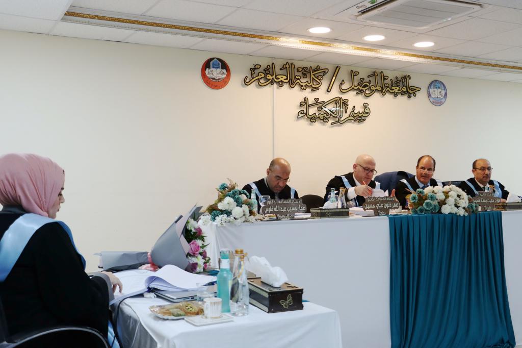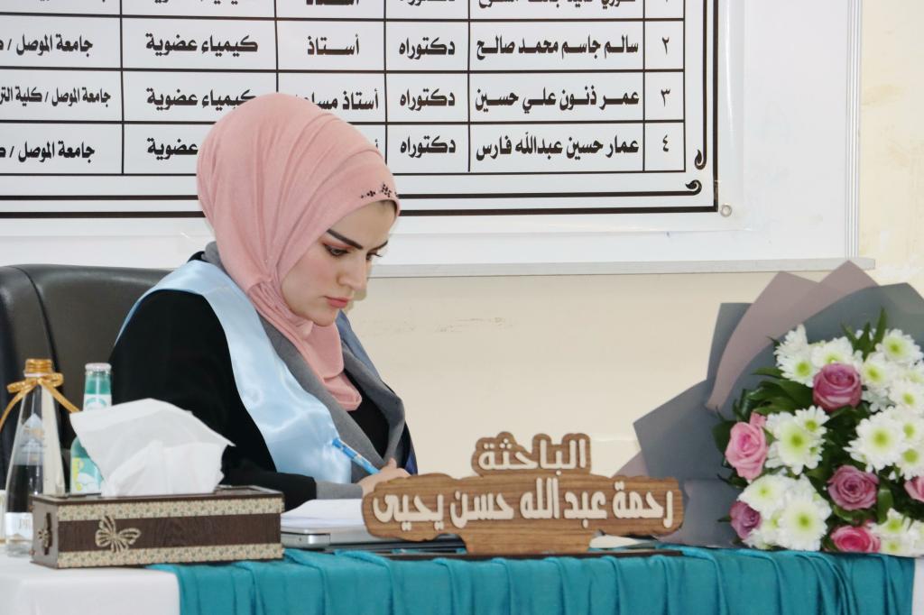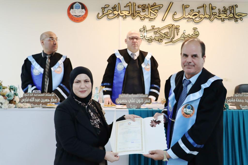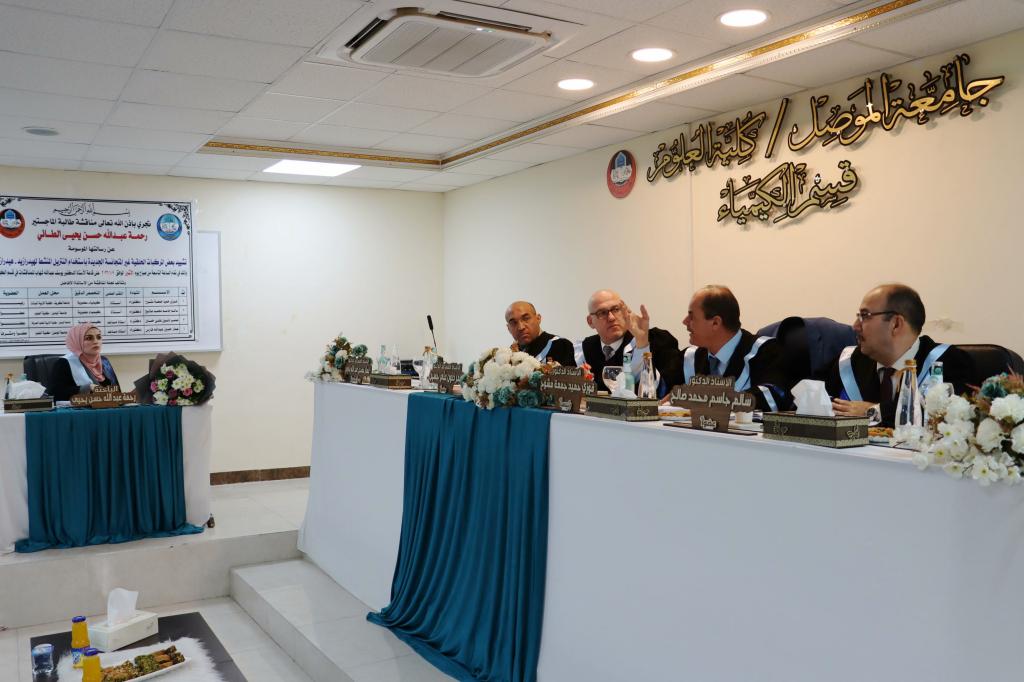 ناقش قسم الكيمياء في كلية العلوم بجامعة الموصل يوم الإثنين الموافق 9 كانون الثاني 2023 رسالة الماجستير الموسومة ” تشييد بعض المركبات الحلقية غير المتجانسة الجديدة باستخدام النتريل المنشط لهيدرازيد- هيدرازون ” ، حضر جانباً منها السيدة عميد الكلية الأستاذ الدكتورة هيام عادل إبراهيم الطائي والسادة معاوني العميد وعدداً من تدريسيي الكلية .تناولت الرسالة التي تقدمت بها الطالبة ( رحمة عبد الله حسن يحيى ) في فرع الكيمياء العضوية تحضير العديد من المركبات العضوية منها مركبات الفا, بيتا – كاربونيل غير المشبعة ومركبات حلقية غير متجانسة خماسية الحلقة متمثلة بالبايرازول والثايوفين وسداسية الحلقة متمثلة بالايمين وكومارين عبر مسارات مختلفة من خلال استخدام المادة الأولية هيدارزيد-هيدرازون التي تمتلك فاعلية دوائية معروفة ولها طيف واسع في مختلف المجالات والتي حُضرت من تفاعل المادة الاولية الاساسية المحضرة سيانو اسيتو هيدارزيد مع مادة piperonal . ومن ثم دراسة الخواص االفيزيائية والطيفية (FT-IR, 1H-NMR ,13C-NMR) لاثبات جميع الصيغ التركيبة للمركبات المحضرة.ترأس لجنة المناقشة الأستاذ الدكتور فوزي حميد جمعة وعضوية كل من الأستاذ المساعد الدكتور عمر ذنون علي و الأستاذ الدكتور سالم جاسم محمد ، وبإشراف وعضوية الأستاذ المساعد الدكتور عمار حسين عبد الله.قدمت السيدة عميد الكلية كتاب شكر وتقدير إلى الأستاذ الدكتور فوزي حميد جمعة من كلية التربية للبنات / جامعة تكريت ؛ لتكبده عناء السفر و ترأسه لجنة المناقشة .شعبة الإعلام والعلاقات العامةالإثنين 9 كانون الثاني 2023