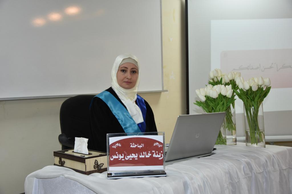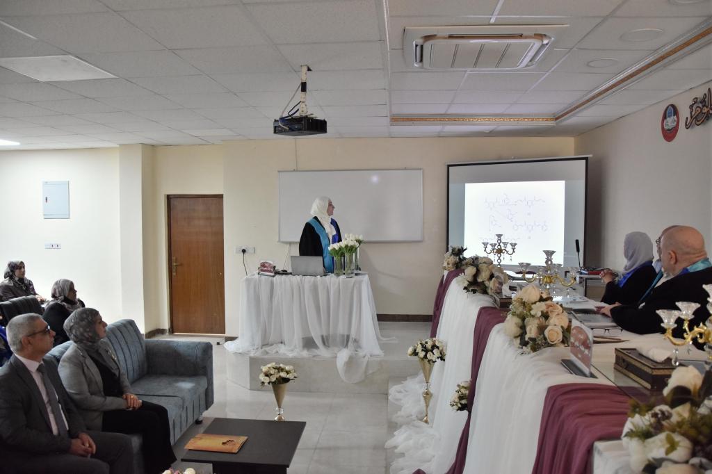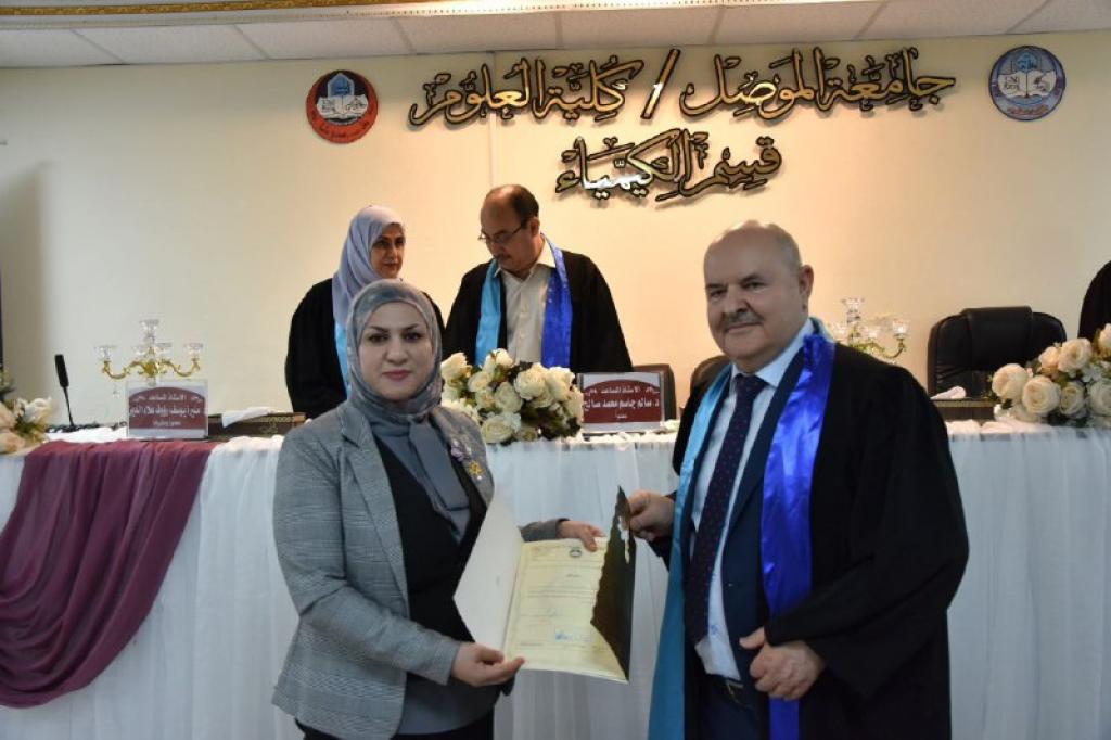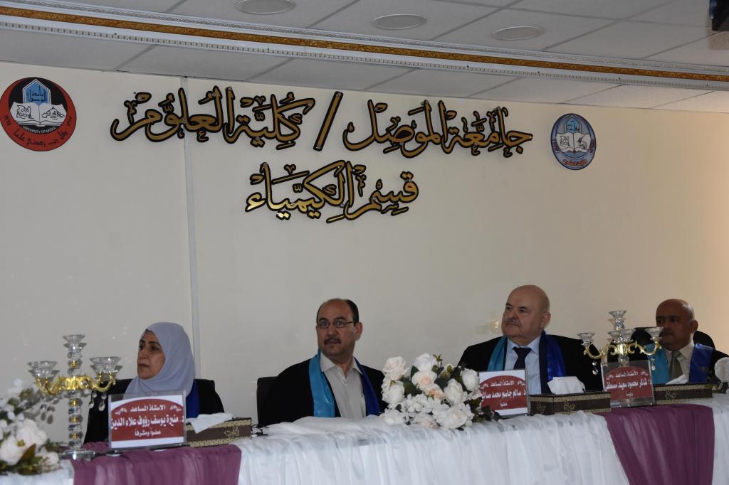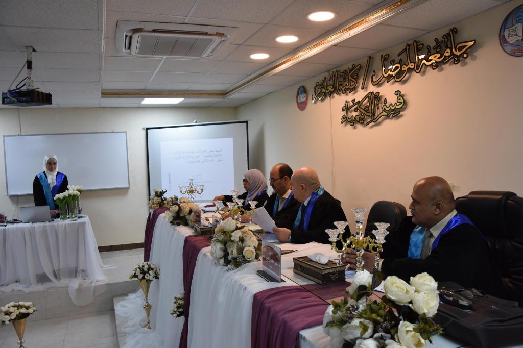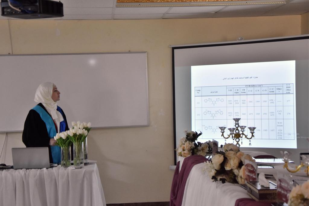 ناقشت كلية العلوم في جامعة الموصل يوم الإثنين الموافق 25 نيسان 2022 رسالة الماجستير الموسومة (( تشييد بعض المشتقات الجديدة للجالكونات الثنائية والحاوية على وحدة 6,2 -ثنائي مثيل -4,1- ثنائي هيدروبريدين )) حضر جانباً منها السيدة عميد الكلية الأستاذ الدكتورة هيام عادل إبراهيم والسيد المعاون العلمي الأستاذ المساعد الدكتور محمد صبحي وعدداً من تدريسي القسم وطلبة الدراسات العليا .تضمنت الرسالة التي تقدمت بها الطالبة ( زينة خالد يحيى ) من قسم الكيمياء تحضير وتشخيص عدد من المركبات الحلقية غير المتجانسة ومركبات أخرى غير حلقية ومن خلال ثلاث مراحل .المرحلة الأولى : تضمنت تحضير المادة الأولية 6,2-ثنائي مثيل-5،3-ثنائي أسيتايل-4،1-ثنائي هيدربريدين (Z1) من مفاعلة البارافورمالديهايد مع أمونيوم اسيتيت والاسيتايل اسيتون.المرحلة الثانية : تضمنت تحضير عدد من مركبات ثنائية الكاربونيل – الفا، بيتا – غير المشبعة (Z2, Z4) من تفاعل Z1 مع البنزالديهايد وبعض مشتقاته.المرحلة الثالثة : تضمنت تحضير عدد من المركبات الحلقية غير المتجانسة من مفاعلة (Z2, Z4) مع مجموعة من المركبات ذات الهيدروجين الحامضية ومن خلال سلسلة التفاعلات الآتية :١-تفاعلات التكاثف مع الثايوسيميكاربازايد والسيميكاربازايد والهيدرازين انتجت مركبات البايرازولينات (Z5, Z13) وهي مركبات حلقية خماسية غير متجانسة.٢-تفاعلات التكاثف مع الثايويوريا واليوريا والكواندين انتجت مركبات حلقية سداسية غير متجانسة على شكل مشتقات البرمدين ( Z14, Z22).٣-تفاعلات التكاثف مع أثيل اسيتو اسيتيت أعطت مشتقات السايكلو هكسينون (Z23, Z25) وهي كيتونات حلقية سداسية غير مشبعة.٤-تفاعلات التكاثف مع أسيتوأسيتانلايد أعطت مشتقات سداسية الحلقة تحتوي على ذرة نيتروجين ومجموعة كاربونيل معروفة باسم مشتقات البريدون (Z26, Z28).٥-كما تم تحضير مشتقات مفتوحة السلسلة ( Z29, Z31) من تفاعل المواد الاولية (Z2, Z4) مع 5-برومو اندول، ومن ناحية اخرى تم أكسدة الجالكونات الثنائية (Z2, Z4) بوجود بيروكسيد الهيدروجين وانتجت مركبات الايبوكسيدات (Z32, Z34)..ترأس لجنة المناقشة أ.م.د. شاكر محمود سعيد و عضوية كل من أ.م.د. سالم جاسم محمد ود. عمر محمد يحيى و عضوية وإشراف .أ.م.د. منيرة يوسف رؤوف .قدمت السيدة عميد الكلية كتاب شكر وتقدير للأستاذ المساعد الدكتور شاكر محمود سعيد من كلية النور الجامعة لجهوده المبذولة و ترأسه لجنة المناقشة .