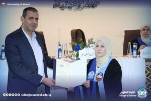 وفي ختام المناقشة، نيابةً عن السيدة عميد كلية العلوم الأستاذ الدكتورة هيام عادل إبراهيم، قدّم السيد معاون العميد للشؤون الإدارية الأستاذ المساعد الدكتور عمر عادل شريف كتاب شكر وتقدير إلى الأستاذ الدكتورة فرحة خلف عمر أحمد من جامعة النور رئيسة لجنة المناقشة، تعبيرًا عن الامتنان لجهودها العلمية ومشاركتها الفاعلة في إنجاح الجلسة العلمية.