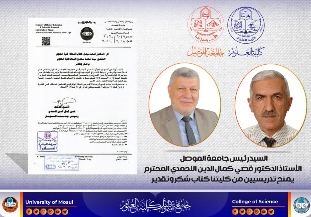 ناقش قسم الكيمياء في كلية العلوم بجامعة الموصل رسالة الماجستير الموسومة ” تطوير طرائق مختلفة لتقدير الثيامين هيدروكلوريد في مستحضراته الصيدلانية ” يوم الأربعاء الموافق 25 أيلول 2024.