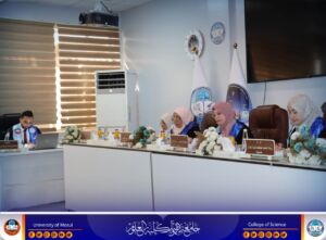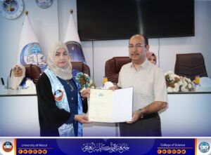 نيابةً عن السيدة عميد كلية العلوم الأستاذ الدكتورة هيام عادل إبراهيم المحترمة، قدّم السيد رئيس قسم الكيمياء الأستاذ الدكتور سالم جاسم محمد المحترم كتاب شكر وتقدير إلى المدرس الدكتورة زينة أحمد محمد عبد الجبار من الجامعة التقنية الشمالية تقديراً لمشاركتها العلمية وجهودها في مناقشة الرسالة.