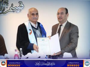 ونيابة عن السيدة عميد الكلية الأستاذ الدكتورة هيام عادل إبراهيم المحترمة قدم رئيس قسم الكيمياء كتاب شكر وتقدير إلى الأستاذ الدكتور طه حسن طه الصائغ لمشاركته في عضوية لجنة مناقشة الطالبة .