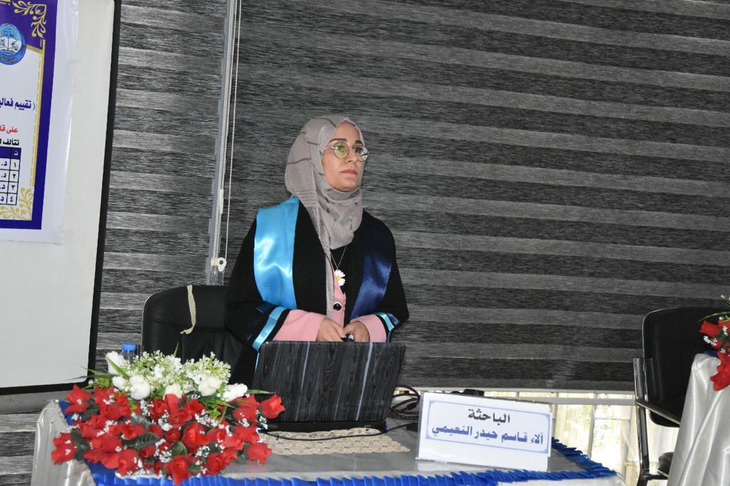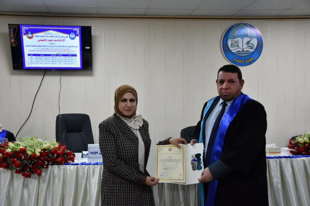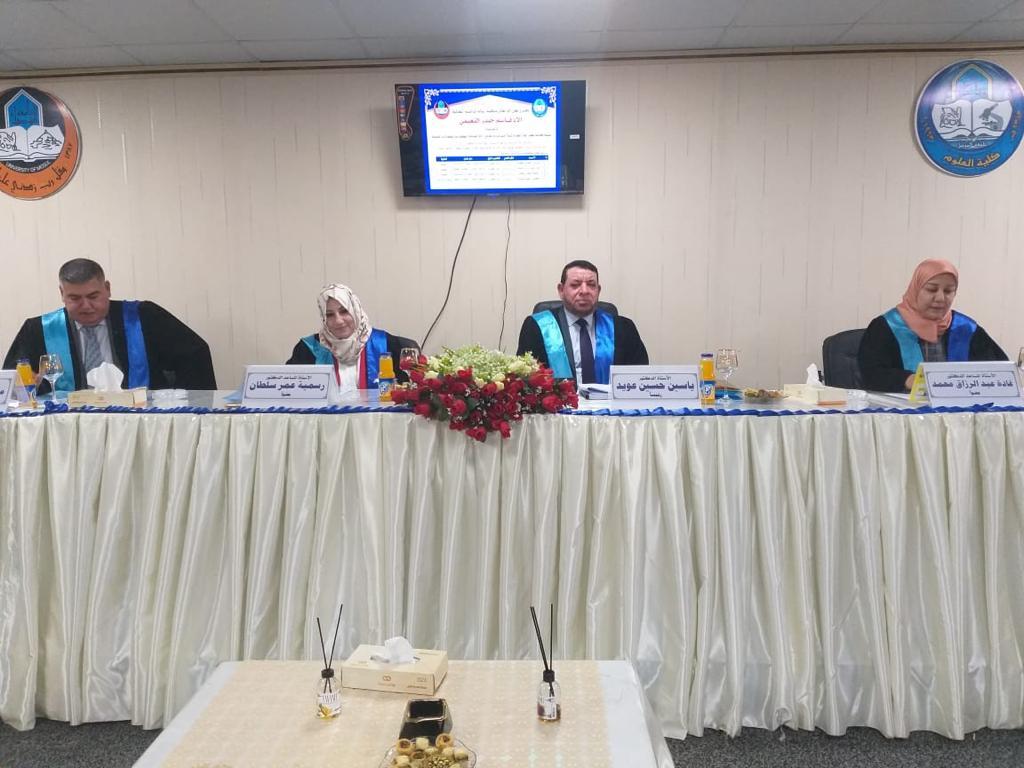 - تقييم فعالية هذه المواد والمركبات المنتخبة في التحييد البلازميدي ٤-ملاحضة علاقة تحييد البلازميدات مع إزالة صفة المقاومة للمضادات الحيوية.ترأس لجنة المناقشة الاستاذ الدكتور ياسين حسين عويد وعضوية كل من الاستاذ المساعد الدكتورة غادة عبد الرزاق محمد والاستاذ المساعد الدكتورة رسمية عمر سلطان وبأشراف وعضوية الأستاذ الدكتور محسن أيوب عيسى .قدمت السيدة عميد الكلية كتاب شكر للأستاذ الدكتور ياسين حسين عويد من كلية التربية للبنات / جامعة تكريت ؛ لتكبده عناء السفر و حضور المناقشة .