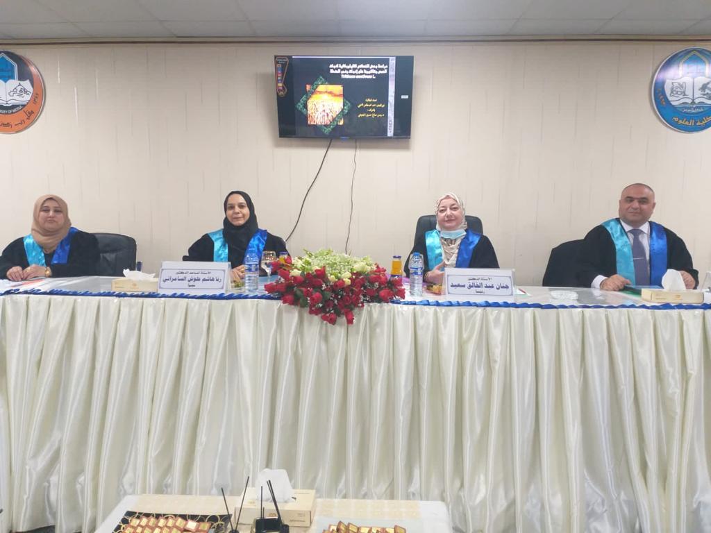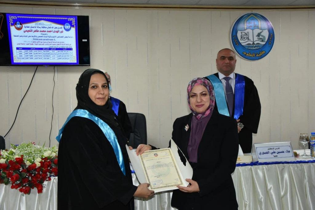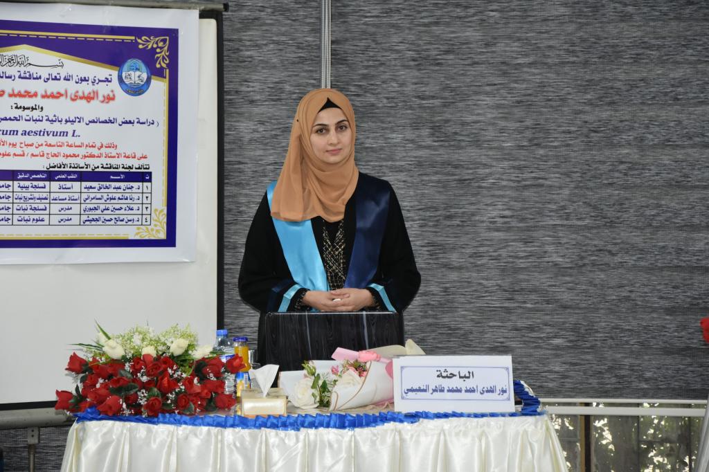 ناقشت كلية العلوم في جامعة الموصل يوم الإثنين الموافق 15 تشرين الثاني 2021 رسالة الماجستير الموسومة ” دراسة بعض الخصائص الاليلوباثية لنبات الحمص وتأثيرها على انبات ونمو الحنطةTriticum aestivum ” حضر جانباً منها الأستاذ المساعد الدكتورة هيام عادل الطائي عميد الكلية و السيد المعاون الإداري وعدداً من تدريسي القسم .هدفت الرسالة التي تقدمت بها الطالبة ( نورالهدى أحمد محمد النعيمي ) من قسم علوم الحياة دراسة التأثيرات الاليلوباثية لمحصول الحمص في محصول الحنطة النامية بعده في نفس الحقل وعزل وتشخيص المركبات الاليلوباثية الموجودة في نبات الحمص فضلًا عن تشخيص الجين المسؤول عن صفة ارتفاع النبات.تطرقت الدراسة إلى إجراء عدة تجارب مختبرية وحقلية لبيان تأثير مخلفات الحمص على انبات ونمو وارتفاع نبات الحنطة .تضمنت الدراسة التشخيص الجزيئي للجين المسؤول عن صفة ارتفاع النبات في الحنطة.تراس لجنة المناقشة الأستاذ الدكتورة جنان عبد الخالق سعيد وعضوية كل من الاستاذ المساعد الدكتورة رنا هاشم علوش والدكتور علاء حسين الجبوري و بإشراف وعضوية الدكتورة وسن صالح حسين الجحيشي .قدمت السيدة عميد الكلية كتاب شكر وتقدير للأستاذ المساعد الدكتورة رنا هاشم علوش من كلية العلوم / جامعة تكريت ؛ لتكبدها عناء السفر و حضور المناقشة .