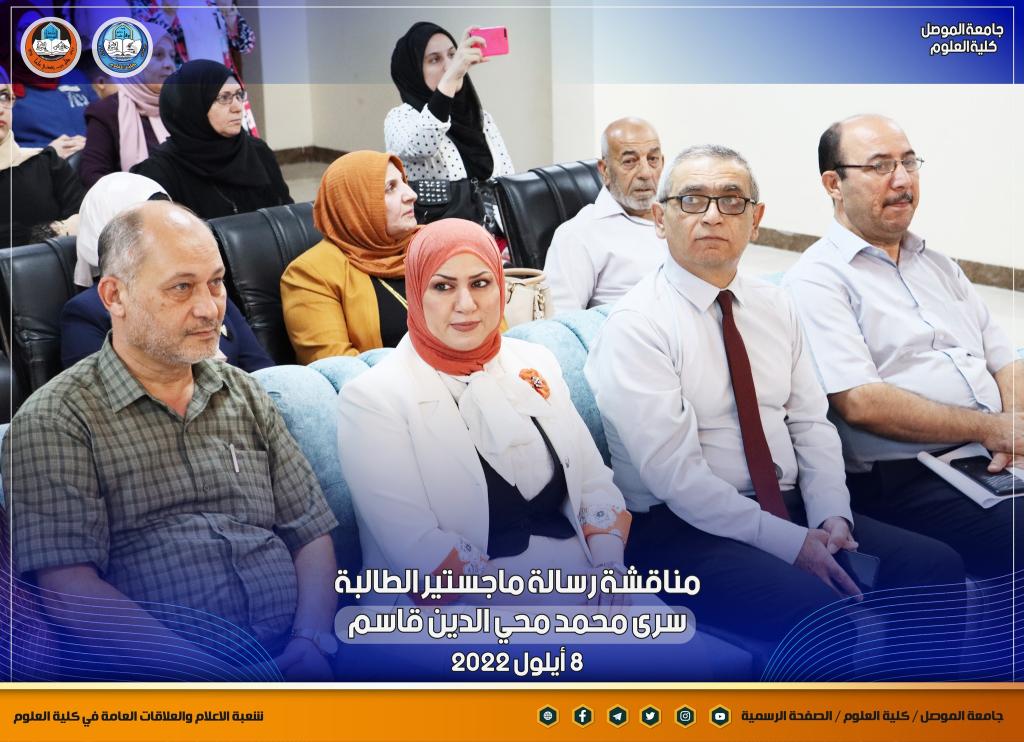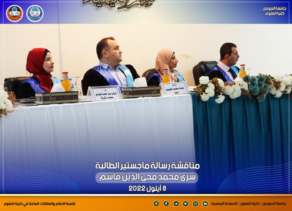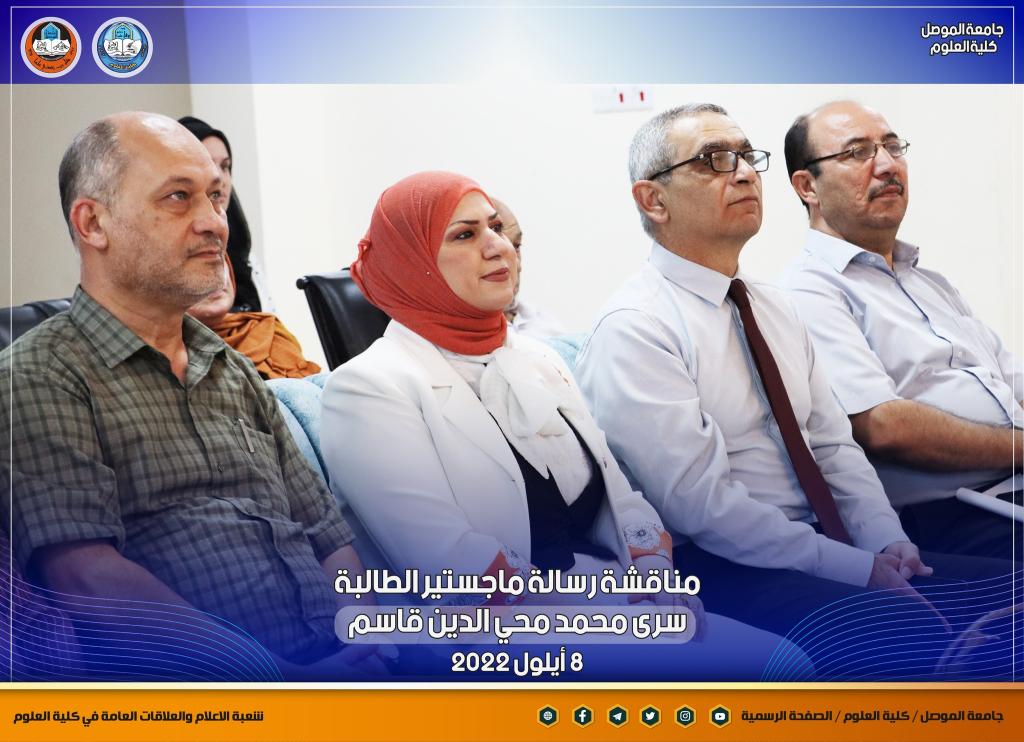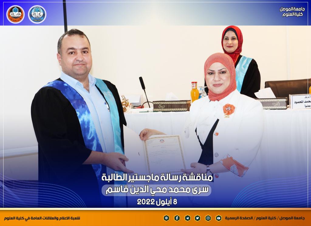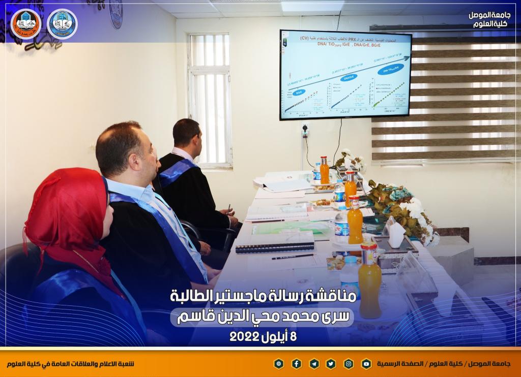 ناقشت كلية العلوم في جامعة الموصل يوم الخميس الموافق 8 أيلول 2022 رسالة الماجستير الموسومة ” دراسة كهروكيميائية لتطوير الأقطاب لتقدير بعض أدوية الأمراض النفسية كمتحسسات حيوية ومعاملتها مع بعض المواد النانوية ” حضر جانباً منها السيدة عميد الكلية الأستاذ الدكتورة هيام عادل إبراهيم والسيد المعاون العلمي والسيد رئيس قسم الكيمياء وعدد من تدريسي وطلبة القسم .تناولت الدراسة التي تقدمت بها الطالبة ( سرى محمد محي الدين ملا حسن) من قسم الكيمياء / فرع الكيمياء الفيزياوية دراسة ثلاثة أجزاء و على النحو الآتي :الجزء الأول : تضمن قياس دراسة السلوك الفولتامتري للـ (TRF)على سطح قطب (BGrE) باستخدام تقنية الفولتامتري الحلقي (CV), تم تطوير المتحسس من خلال البلمرة الكهروكيميائية للـ(TH) والحصول على أفضل متحسس لقياس (TRF) PTH /GrE,تم تعزيز المتحسس أعلاه من خلال وضع طبقة من أنابيب الكاربون النانوية متعددة الجدران MWCNTS لزيادة كفاءة القطب , كما تم أجراء تطبيقات عملية للقطب المحور (PTH/ MWCNTs/GrE) على المستحضرات الصيدلانية ,وتم تشخيص مواصفات السطح للمتحسس باستخدام المجهر الماسح الإلكتروني (SEM)..الجزء الثاني : تضمن قياس دراسة السلوك الفولتامتري (CAZ) على سطح قطب (BGrE) باستخدام تقنية الفولتامتري الحلقي (CV), تم تطوير المتحسس من خلال البلمرة الكهروكيميائية للـ (L-Serine) والحصول على أفضل متحسس لقياس (CAZ) (PSer/GrE),تم تعزيز المتحسس أعلاه من خلال وضع طبقة من أنابيب الكاربون النانوية متعددة الجدران MWCNTS لزيادة كفاءة القطب المحور , وكذلك تم أجراء تطبيقات عملية للقطب المحور (PSer / MWCNTs/GrE) على المستحضرات الصيدلانية ,تم تشخيص مواصفات السطح للمتحسس باستخدام المجهر الماسح الإلكتروني (SEM)..الجزء الثالث : فتضمن قياس دراسة السلوك الفولتامتري للـ(PRX),على سطح قطب (BGrE) باستخدام تقنية الفولتامتري الحلقي (CV), تم تطوير المتحسس من خلال تحضير متحسس حيوي معتمد على DNA لتقدير PRX والحصول على أفضل متحسس لقياس (PRX) (DNA/GrE), تم تعزيز المتحسس أعلاه من خلال وضع طبقة من جزيئات ثاني أوكسيد التيتانيوم النانوية TiO2NPS لزيادة كفاءة القطب المحور ,وكذلك تم أجراء تطبيقات عملية للقطب المحور ((DNA/TiO2NPS /GrE) على المستحضرات الصيدلانية ,وتم تشخيص مواصفات السطح للمتحسس باستخدام المجهر الماسح الإلكتروني (SEM)..ترأس لجنة المناقشة الأستاذ المساعد الدكتورة زاهدة أحمد نجم الجريسي و عضوية الأستاذ المساعد الدكتور صدام محمد أحمد المحمود والأستاذ المساعد الدكتور عمر عادل شريف الحيالي و بعضوية وإشراف المدرس الدكتورة إيمان عبد المنعم محمد صالح الجوادي .قدمت السيدة العميد كتاب شكر وتقدير للدكتور صدام محمد أحمد المحمود من كلية التربية للبنات / جامعة تكريت ؛ لتكبده عناء السفر وجهوده المبذولة في مناقشة الطالبة.شعبة الإعلام والعلاقات العامةالخميس 8 أيلول 2022