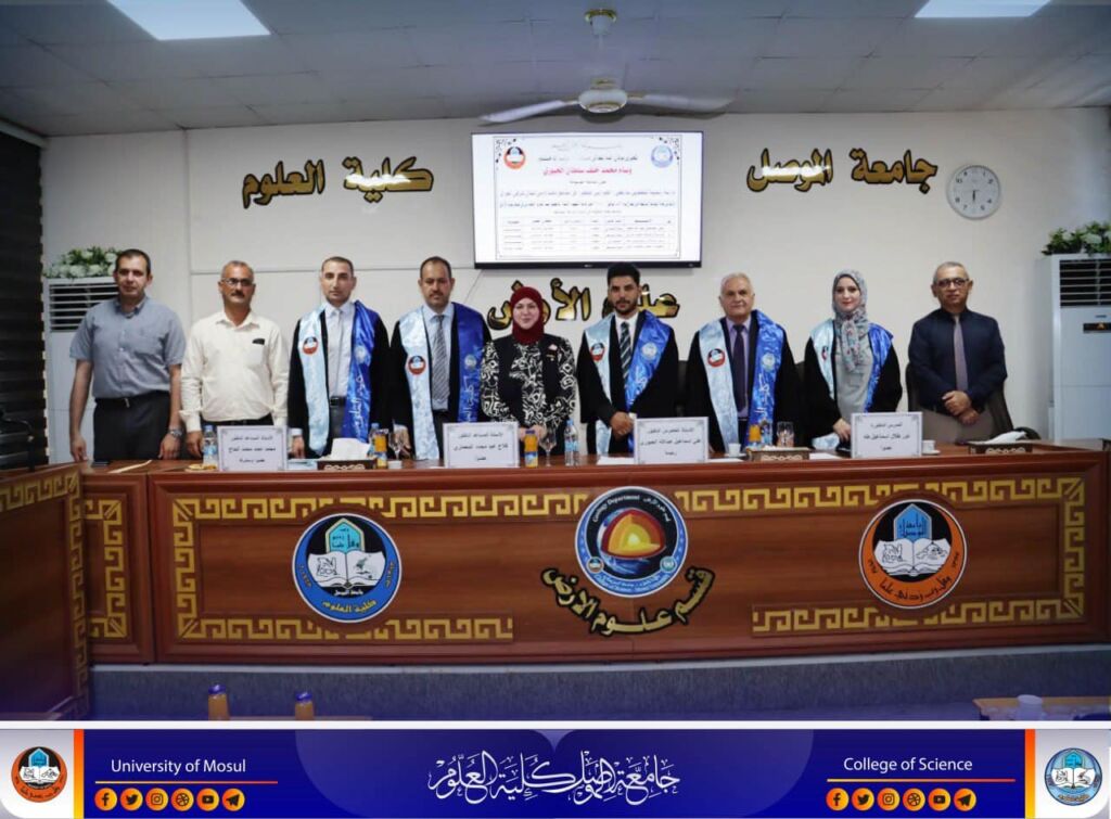 ترأس لجنة المناقشة الأستاذ الدكتور (محمود إسماعيل محمد حسن الجبوري)، وعضوية كل من الأستاذ المساعد الدكتورة (ليلى عبدالله مصطفى عبدالله)، والأستاذ المساعد الدكتور (محمد بحري حسن عبد)، وبعضوية وإشراف الأستاذ الدكتورة (زهراء محمد علي أحمد حمودات) .