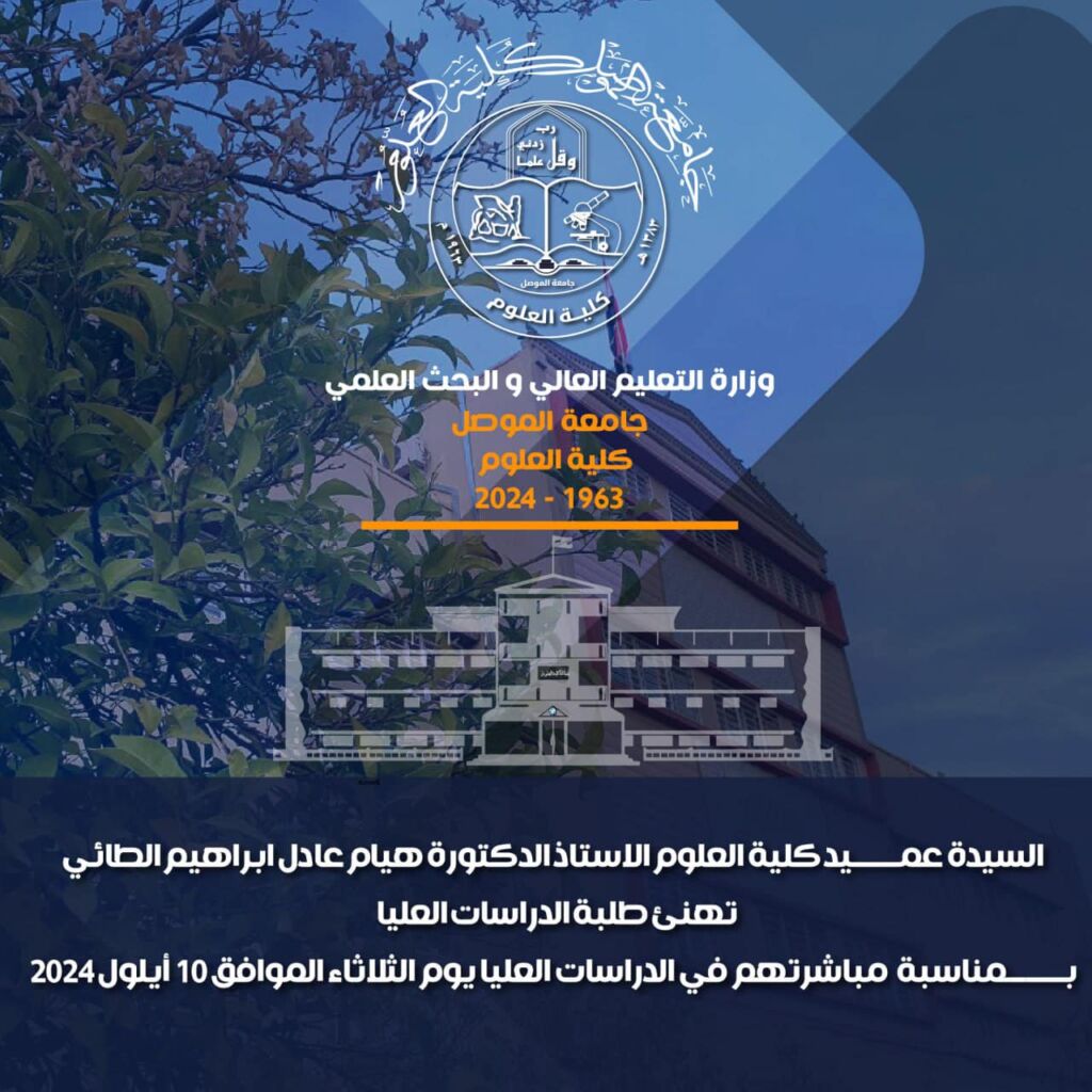 ناقش قسم الكيمياء في كلية العلوم بجامعة الموصل رسالة الماجستير الموسومة ” دراسة وعزل أنزيم كلوتاردوكسين من مصل الدم لدى مرضى سرطان الدم ” يوم الاثنين الموافق 9 أيلول 2024، حضر جانبا منها السيدة عميد كلية العلوم الأستاذ الدكتورة هيام عادل إبراهيم الطائي المحترمة والسيد معاون العميد للشؤون الادارية الدكتور عمر عادل شريف ومقرر القسم الدكتور عمار عبد الستار وعدد من تدريسي الكلية المحترمين.