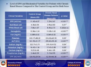الرسالة التي تقدم بها الطالب سبهان إسماعيل شمو ال سعدو تناولت تقييم دور هرمون الإريثروبويتين (EPO) كعلامة حيوية جديدة للكشف المبكر عن التهابات واعتلال الكلية المزمن (CKD) لدى المرضى العراقيين، وأظهرت النتائج أن انخفاض مستوى الهرمون يمكن أن يُعتمد كمؤشر تشخيصي مبكر لضعف وظائف الكلى وزيادة خطر الإصابة بالمرض.