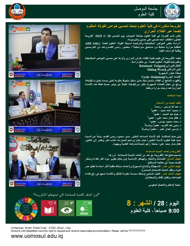 ناقش قسم علوم الأرض في كلية العلوم بجامعة الموصل، يوم الخميس 28 آب 2025، رسالة الماجستير للطالبة إيناس يونس بديع سليم والموسومة ” دراسة رسوبية لتكوين سيكنيان – الجوراسي المبكر – في مقاطع مختارة من شمال شرقي العراق ” .