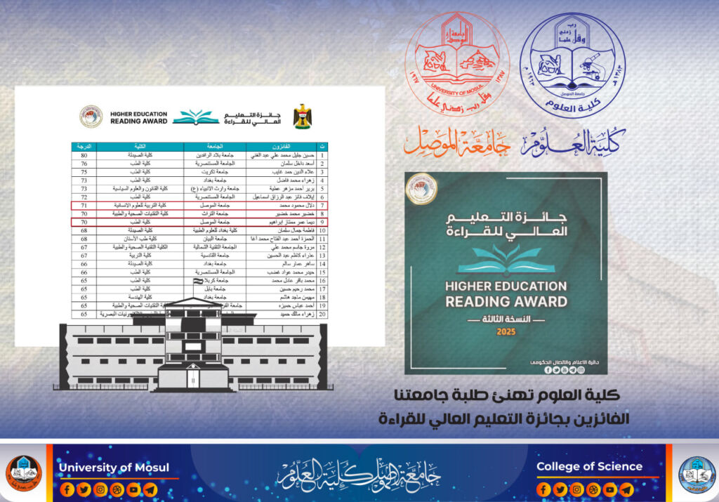 نوقشت في قسم الكيمياء بكلية العلوم – جامعة الموصل رسالة الماجستير الموسومة “عزل وتقييم مستوى الميوراميديز وبعض المتغيرات الكيموحيوية لدى المرضى المصابين بداء كرون”، وذلك يوم الثلاثاء الموافق 7 تشرين الأول 2025.