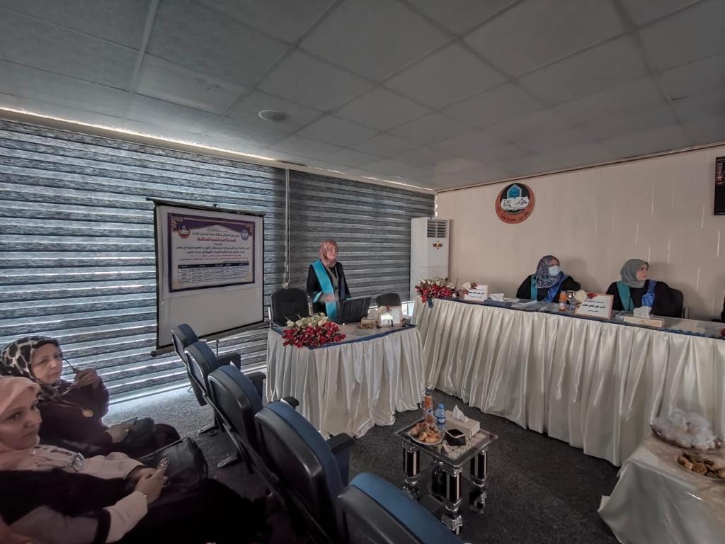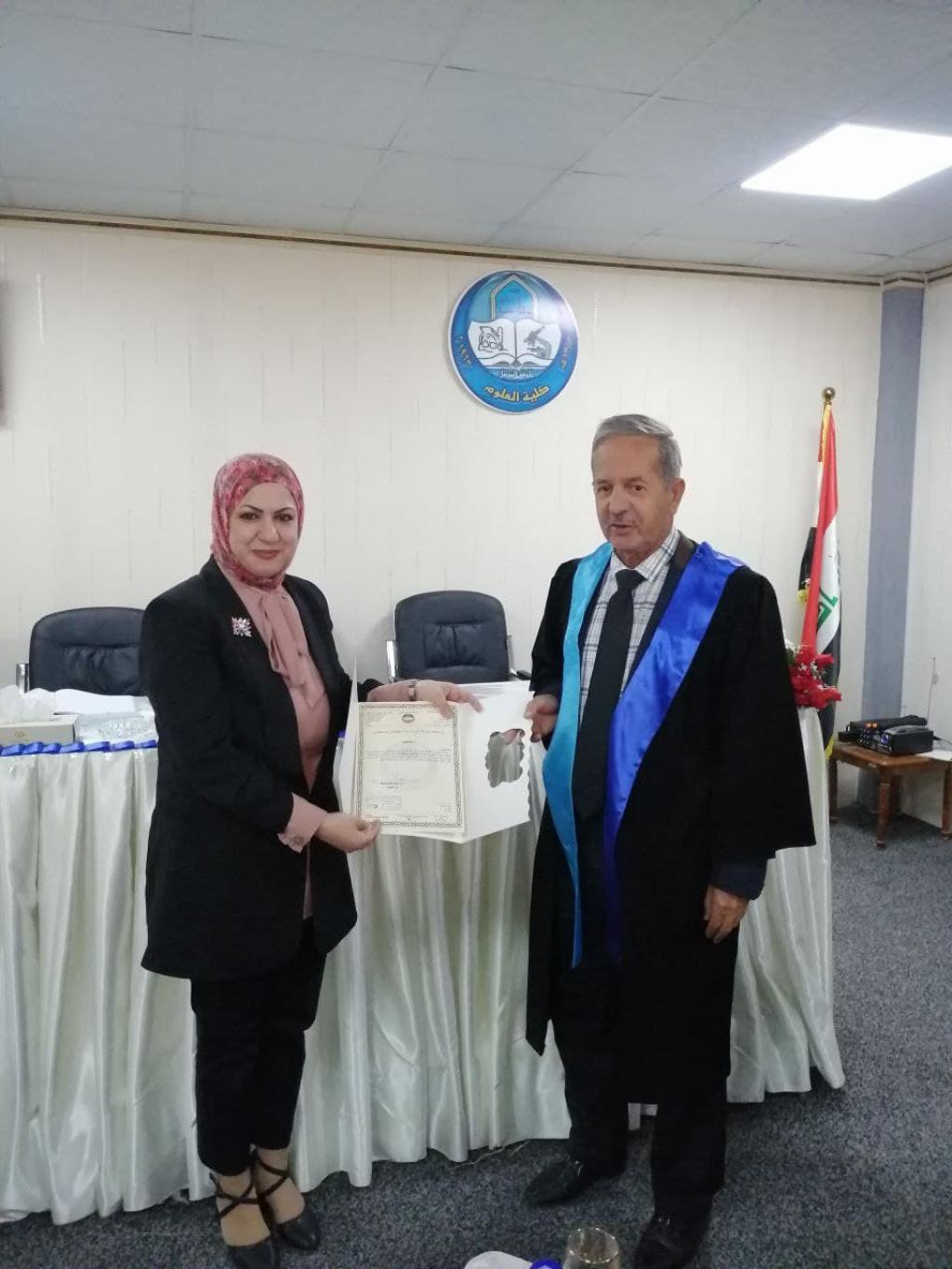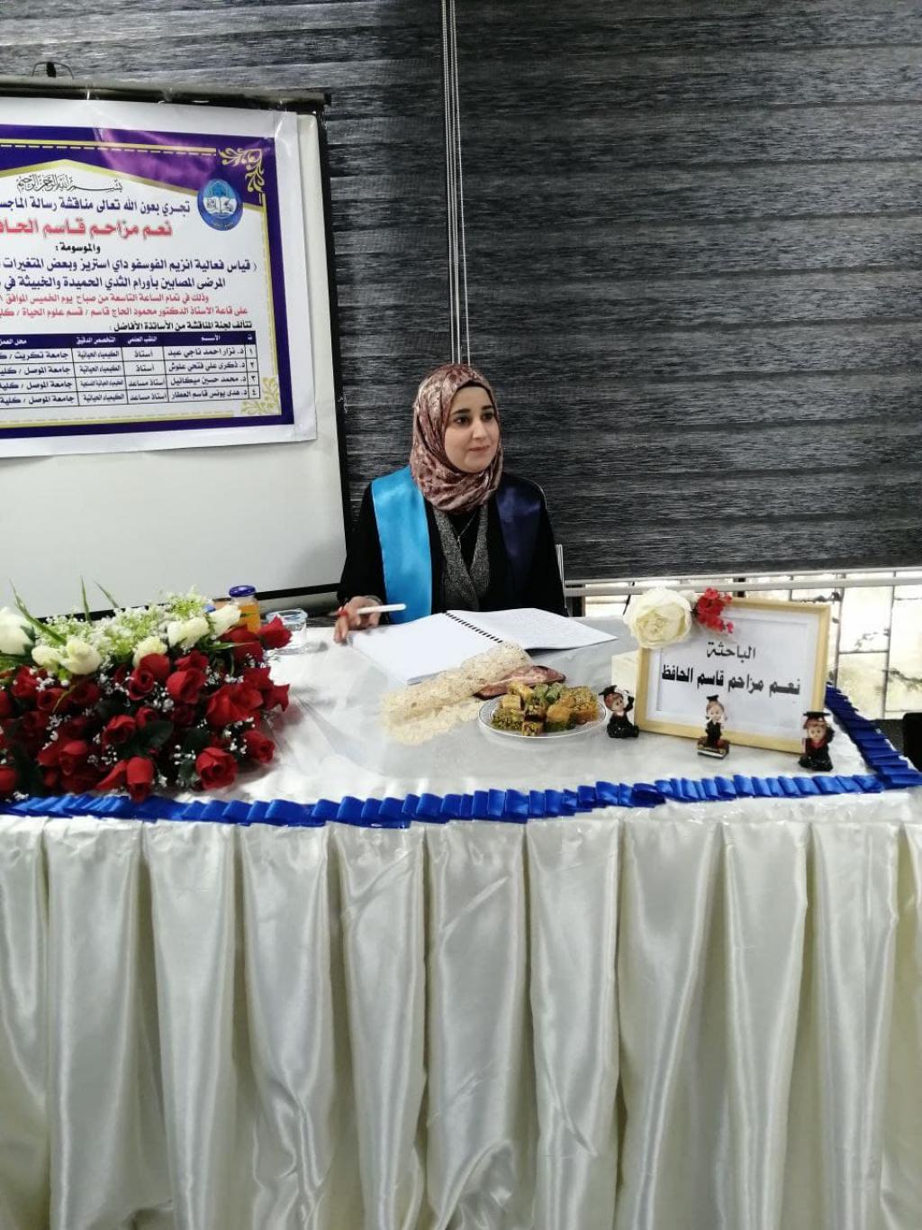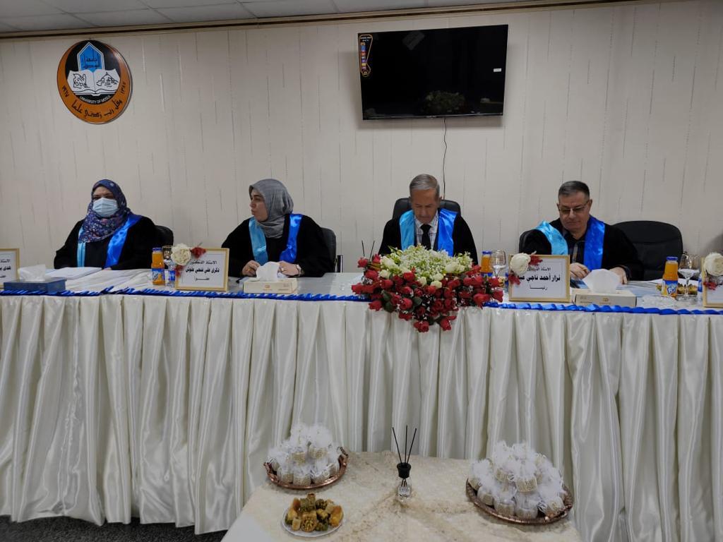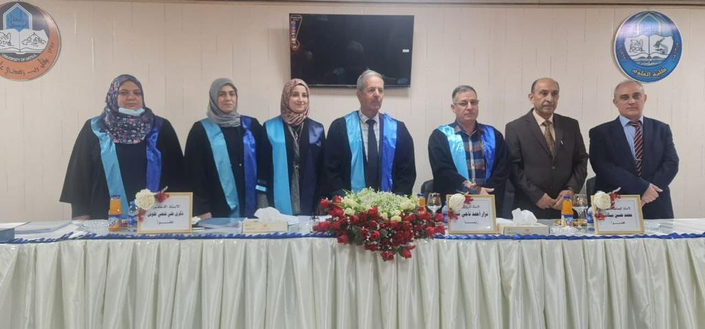 ناقشت كلية العلوم في جامعة الموصل يوم الخميس الموافق 11 تشرين الثاني 2021 رسالة ماجستير الموسومة “قياس فعالية انزيم الفوسفوداي استريز وبعض المتغيرات الكيموحيوية في مصل المرضى المصابين بأورام الثدي الحميدة والخبيثة في مدينة الموصل” حضر جانباً منها الأستاذ المساعد الدكتورة هيام عادل الطائي عميد الكلية و المعاون العلمي الدكتور محمد صبحي وعدداً من تدريسيي الكلية .تناولت الرسالة التي تقدمت بها الطالبة ( نِعم مزاحم قاسم الحافظ ) من قسم علوم الحياة / فرع الحيوان قياس مستويات عدد من المتغيرات الكيموحيوية في مصل المصابات بأورام الثدي الحميدة والخبيثة في مدينة الموصل (تم الحصول على عينات الدم من مستشفى الاورام والطب النووي التخصصي وبعض المختبرات الاهلية) وتضمنت الدراسة ثلاث محاور، اشتمل المحور الاول على تحديد عوامل الخطورة للاصابة بأورام الثدي اما المحور الثاني تضمن تحديد مستويات عدد من المتغيرات الكيموحيوية في مصل المصابات ومقارنتها بعينات السيطرة وتضمن المحور الثالث مقارنة مستويات المتغيرات بين مراحل الورم الاربعة .هدفت الدراسة الى تعيين تراكيز الادينوسين الاحادي الفوسفات الحلقي cAMP من خلال تحديد فعالية انزيم الفوسفوداي استريز-4 والبروتين كاينيز، التحري فيما اذا كانت السمنة احد عوامل الخطورة من خلال قياس مستوى كل من هورموني الكورتيزول واللبتين فضلا عن تراكيز فيتامين D وتعيين تراكيز عدد من العناصر والتي اشتملت على الكالسيوم، السيلينيوم، المنغنيز والحديد فضلا عن تحديد تراكيز الفيريتين والبروتين التفاعلي C ، كما تضمنت الدراسة تحديد قيم منسب كتلة الجسم ومقارنة المتغيرات قيد الدراسة في مراحل الورم المختلفة وتحديد عوامل الخطورة للإصابة بأورام الثدي في مدينة الموصل.ترأس لجنة المناقشة الاستاذ الدكتور نزار أحمد ناجي عبد وعضوية كل من الاستاذ الدكتورة ذكرى علي علوش و الاستاذ المساعد الدكتور محمد حسين ميكائيل وبإشراف وعضوية الاستاذ المساعد الدكتورة هدى يونس العطار.قدمت السيدة العميد كتاب شكر وتقدير للأستاذ الدكتور نزار أحمد ناجي من كلية العلوم / جامعة تكريت ؛ لتكبده عناء السفر و ترأسه لجنة المناقشة .