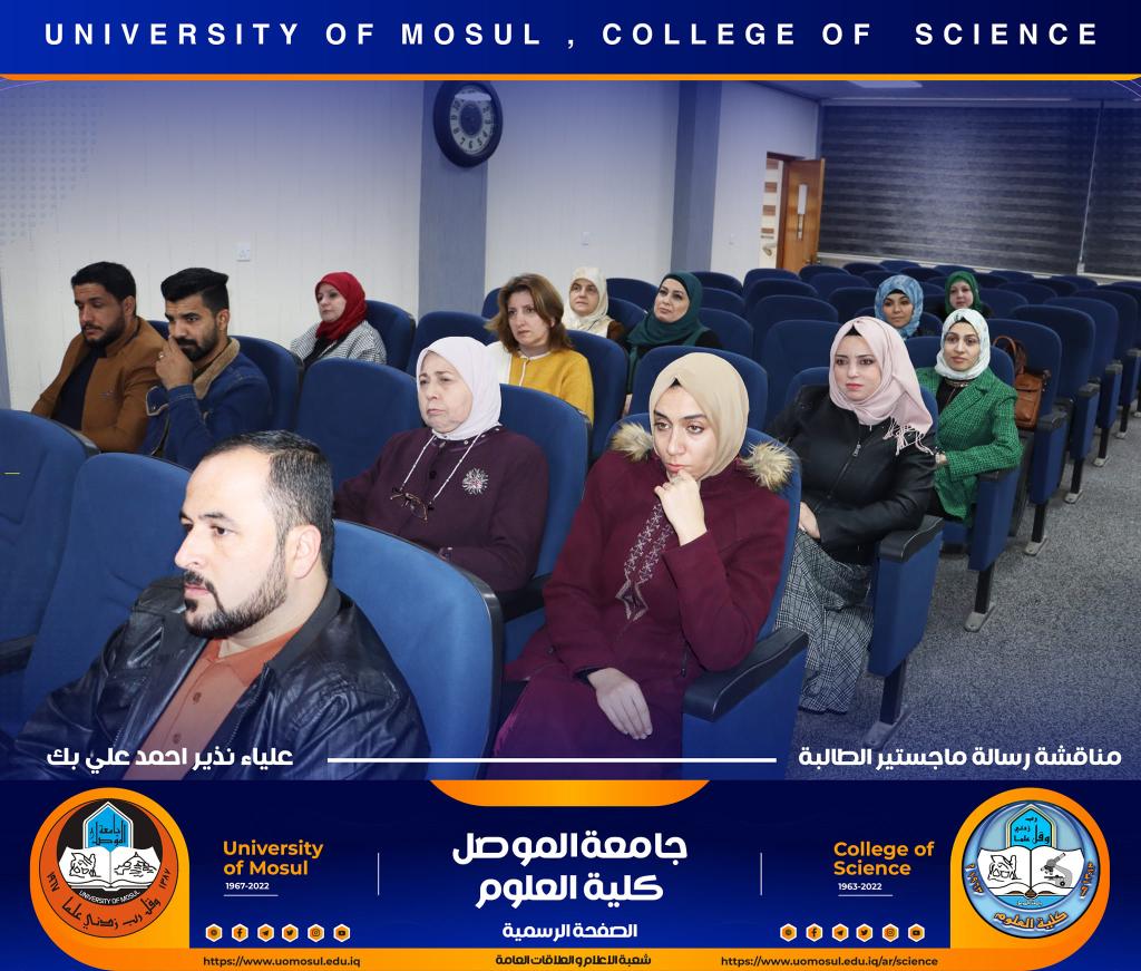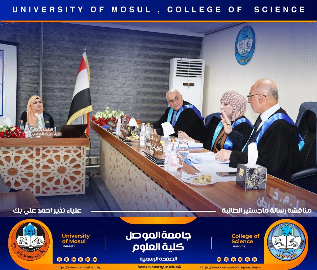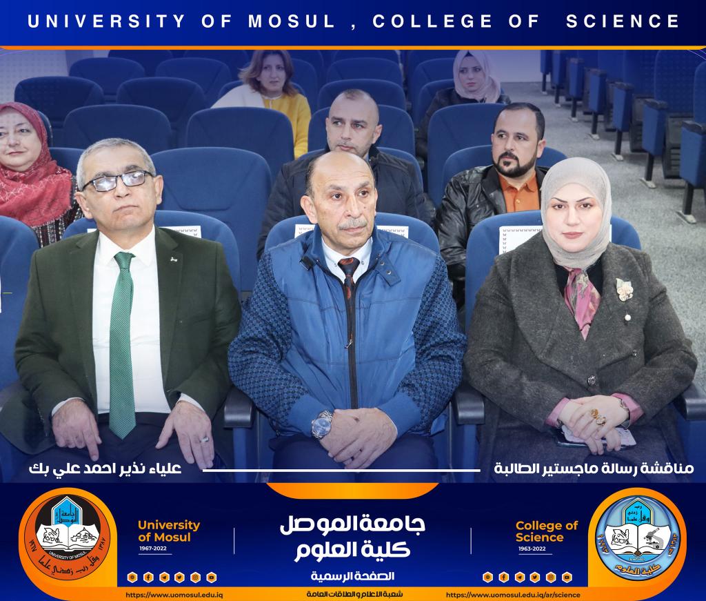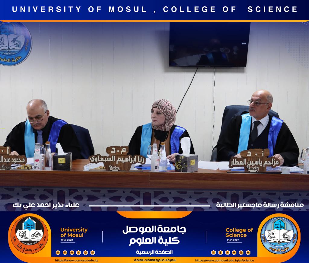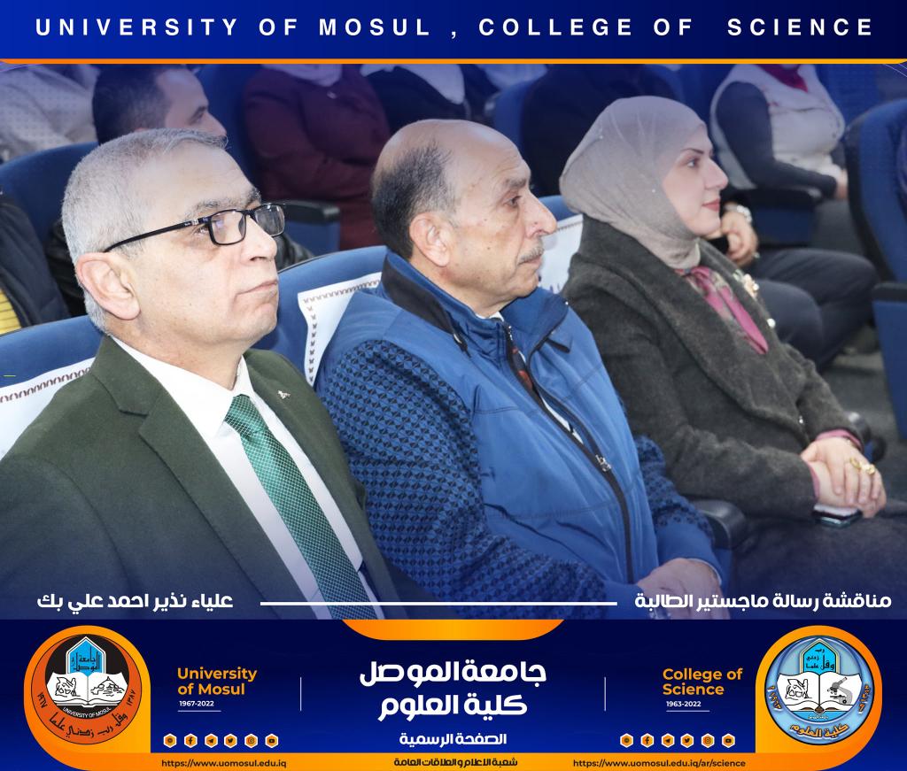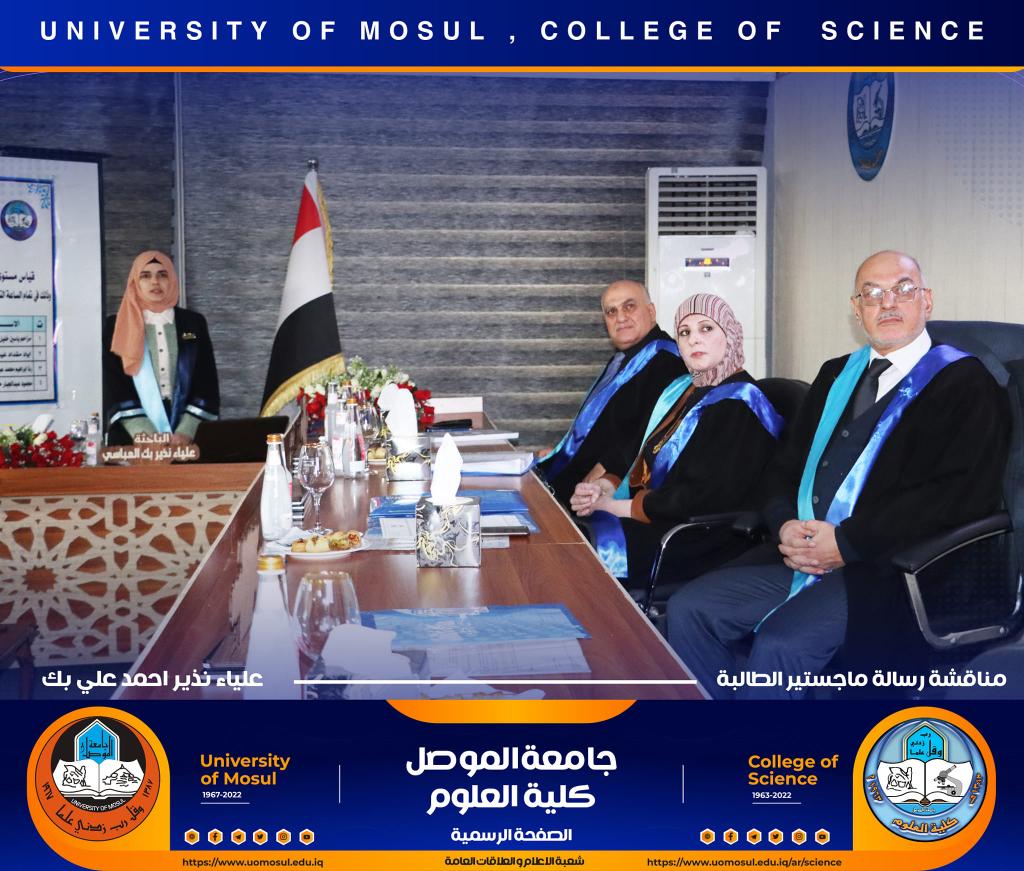 ناقش قسم علوم الحياة في كلية العلوم بجامعة الموصل رسالة الماجستير الموسومة ” قياس مستوى بعض المعايير المناعية لتقييم فعالية الجهاز المناعي للأصحاء في محافظة نينوى ” يوم الثلاثاء الموافق 13 كانون الأول 2022.حضر جانباً منها السيدة عميد الكلية الأستاذ الدكتورة هيام عادل إبراهيم والسادة معاوني العميد والسيد رئيس القسم وعدد من تدريسي القسم.تناولت الدراسة التي تقدمت بها الطالبة ( علياء نذير أحمد بك العباسي ) فرع الأحياء المجهرية عدد من المحاور منها :دراسة تأثير فيتامين D وفيتامين C وكل من الزنك والسلينيوم على العوامل المناعية المدروسة ، و دراسة تأثير بعض العادات والسلوك اليومي للأشخاص قيد الدراسة على بعض العوامل المناعية ، اضافة الى تقييم تأثير كل من التعرض للشمس والوزن الزائد على العوامل المناعية المدروسة ، و دراسة تأثير نوع الغذاء وكمية شرب الماء للأشخاص قيد الدراسة على بعض العوامل المناعية في الجسم.هدفت الدراسة الى :1- تحديد تأثير بعض الفيتامينات والعناصر على إنتاج الأجسام المضادة والخلايا المناعية وفعالية المتمم في الجسم.2- إيجاد العلاقة بين كفاءة الجهاز المناعي وكل من النمط الغذائي وبعض السلوك والعادات اليومية.3- التحري عن العوامل التي تساعد على تنشيط وتقوية الجهاز المناعي البشري.4- تحديد تأثير الإفراط في تناول اللحوم والسكريات والرياضة وتناول المكملات الغذائية على بعض العوامل المناعية .أوضحت النتائج وجود عوامل مؤثرة سلبا على الجهاز المناعي وخاصة على كل من فعالة المتمم و IgM وبدرجة كبيرة ، كما كان هناك مؤثرات أخرى على صحة الجهاز المناعي شملت طبيعة الغذاء والصحة العامة والسلوك اليومي.ترأس لجنة المناقشة الأستاذ الدكتور مزاحم ياسين خليل العطار، وعضوية كل من الأستاذ المساعد الدكتور أياد مقداد غيدان مبارك من جامعة تكريت ، والمدرس الدكتورة رنا إبراهيم محمد عبدالله وبإشراف الأستاذ الدكتور محمود عبدالجبار حسين الطوبجي.شعبة الإعلام والعلاقات العامةالثلاثاء 13 كانون الأول 2022