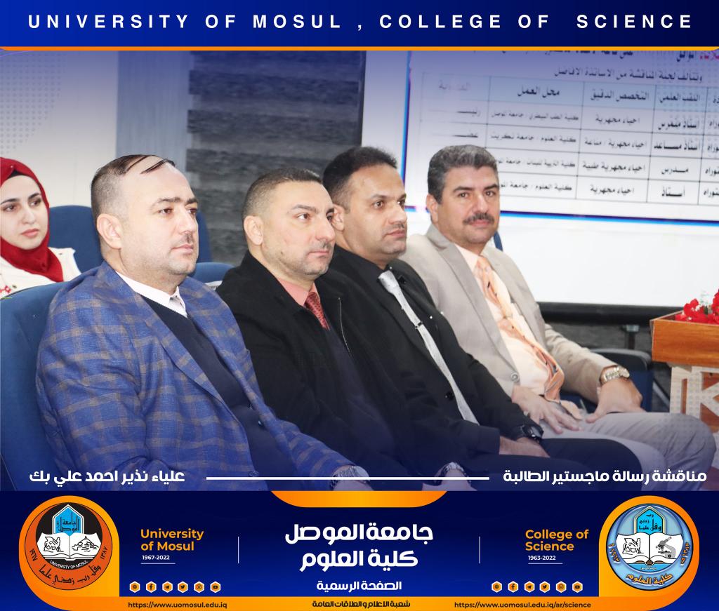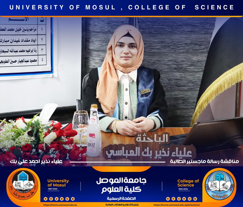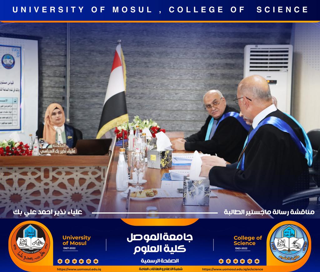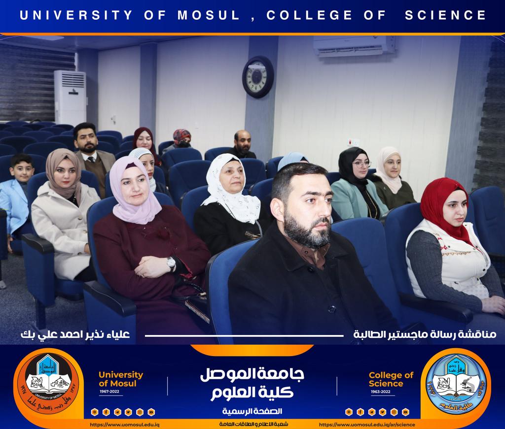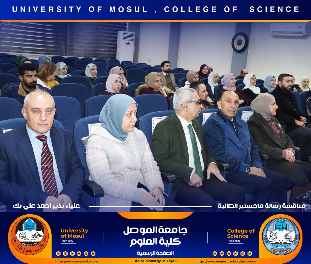 ناقش قسم علوم الحياة في كلية العلوم بجامعة الموصل رسالة الماجستير الموسومة ” قياس مستوى بعض المعايير المناعية لتقييم فعالية الجهاز المناعي للأصحاء في محافظة نينوى ” يوم الثلاثاء الموافق 13 كانون الأول 2022.حضر جانباً منها السيدة عميد الكلية الأستاذ الدكتورة هيام عادل إبراهيم والسادة معاوني العميد والسيد رئيس القسم وعدد من تدريسي القسم.تناولت الدراسة التي تقدمت بها الطالبة ( علياء نذير أحمد بك العباسي ) فرع الأحياء المجهرية عدد من المحاور منها :دراسة تأثير فيتامين D وفيتامين C وكل من الزنك والسلينيوم على العوامل المناعية المدروسة ، و دراسة تأثير بعض العادات والسلوك اليومي للأشخاص قيد الدراسة على بعض العوامل المناعية ، اضافة الى تقييم تأثير كل من التعرض للشمس والوزن الزائد على العوامل المناعية المدروسة ، و دراسة تأثير نوع الغذاء وكمية شرب الماء للأشخاص قيد الدراسة على بعض العوامل المناعية في الجسم.هدفت الدراسة الى :1- تحديد تأثير بعض الفيتامينات والعناصر على إنتاج الأجسام المضادة والخلايا المناعية وفعالية المتمم في الجسم.2- إيجاد العلاقة بين كفاءة الجهاز المناعي وكل من النمط الغذائي وبعض السلوك والعادات اليومية.3- التحري عن العوامل التي تساعد على تنشيط وتقوية الجهاز المناعي البشري.4- تحديد تأثير الإفراط في تناول اللحوم والسكريات والرياضة وتناول المكملات الغذائية على بعض العوامل المناعية .أوضحت النتائج وجود عوامل مؤثرة سلبا على الجهاز المناعي وخاصة على كل من فعالة المتمم و IgM وبدرجة كبيرة ، كما كان هناك مؤثرات أخرى على صحة الجهاز المناعي شملت طبيعة الغذاء والصحة العامة والسلوك اليومي.ترأس لجنة المناقشة الأستاذ الدكتور مزاحم ياسين خليل العطار، وعضوية كل من الأستاذ المساعد الدكتور أياد مقداد غيدان مبارك من جامعة تكريت ، والمدرس الدكتورة رنا إبراهيم محمد عبدالله وبإشراف الأستاذ الدكتور محمود عبدالجبار حسين الطوبجي.شعبة الإعلام والعلاقات العامةالثلاثاء 13 كانون الأول 2022