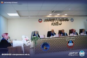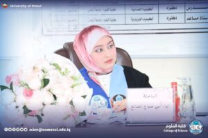 وفي الختام قدّم السيد رئيس قسم الكيمياء الأستاذ الدكتور فراس أحمد ذنون المحترم، نيابةً عن السيدة عميد كلية العلوم الأستاذ الدكتورة هيام عادل إبراهيم المحترمة، كتاب شكر وتقدير إلى الأستاذ المساعد الدكتورة وجدان محمد صالح محمد، تثميناً لحضورها ومشاركتها الفاعلة وإسهامها العلمي في إثراء المناقشة وملاحظاتها القيّمة التي أسهمت في تقويم الرسالة وتعزيز رصانتها الأكاديمية.