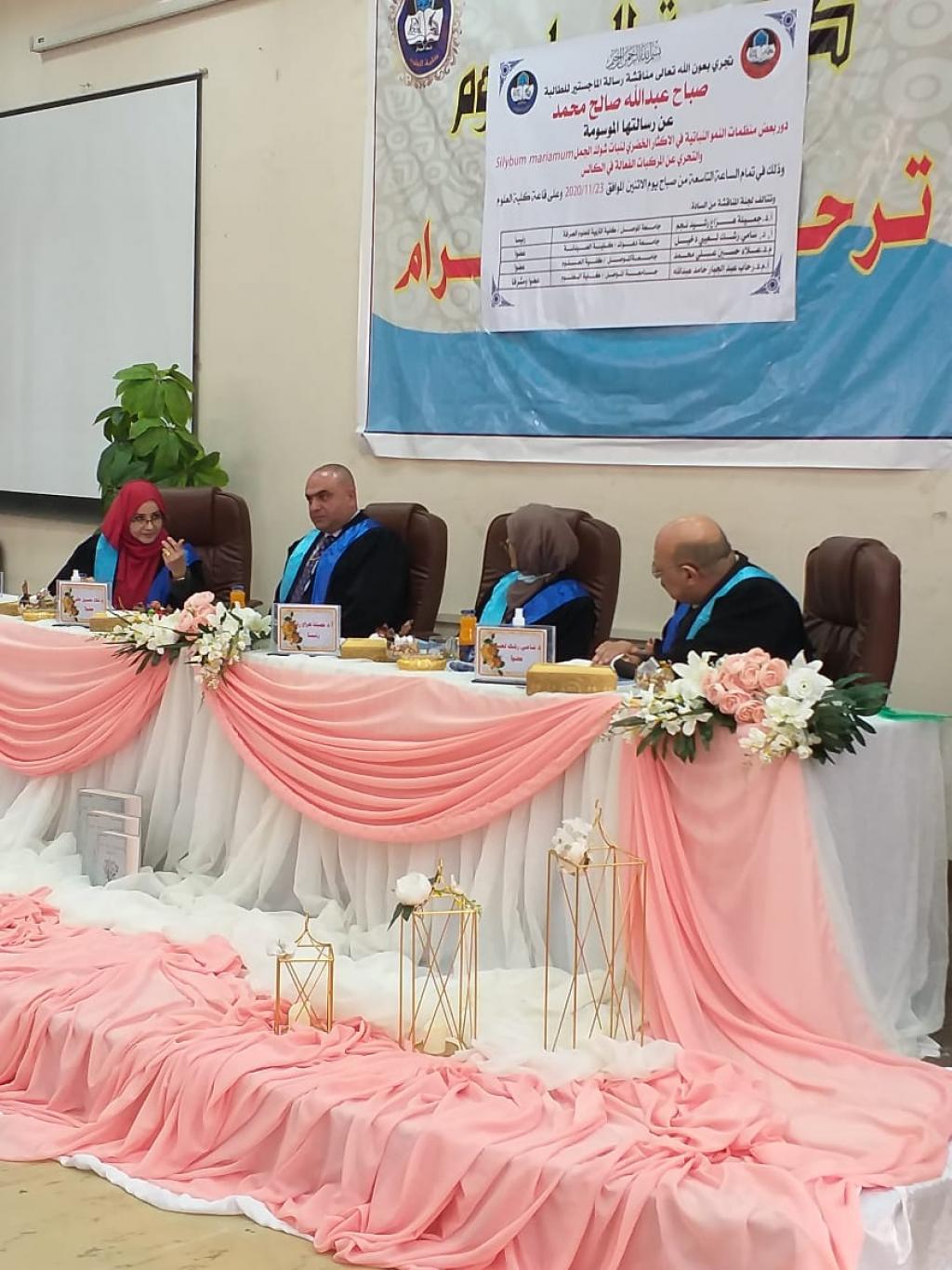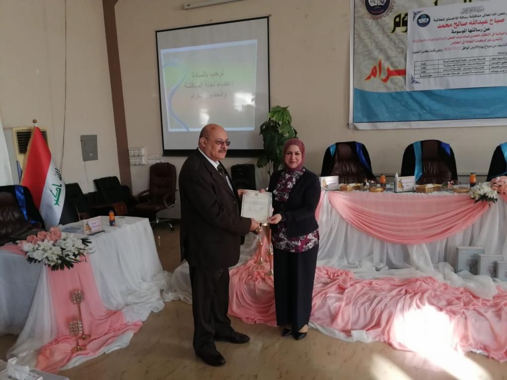 • أ.م.د. رحاب عبدالجبار حامد / جامعة الموصل / عضواً و مشرفاً .حيث قدّمت السيدة عميد كلية العلوم الأستاذ المساعد الدكتورة هيام عادل إبراهيم الطائي كتاب شكر و تقدير إلى الأستاذ المساعد الدكتور سامي رشك لعيبي دخيل من كلية الصيدلة / جامعة دهوك ؛ لتكبده عناء السفر و مشاركته في مناقشة الطالبة .