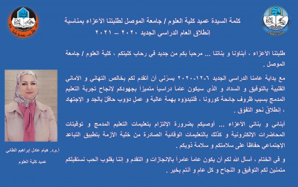 ناقشت كلية العلوم في جامعة الموصل يوم الاثنين الموافق 2020/11/30 رسالة الماجستير الموسومة ” التأثيرات الشكلية والنسيجية لعقار Cisplatin المضاد للسرطان على حوامل واجنة الفئران البيض ” .اذ خلُصت الدراسة التي تقدمت بها الطالبة (صفا خالد فتحي علي) الى ان الجرعات التي تتراوح تراكيزها من (0.25,0.5,1,2) mg/kg من عقار Cisplatin قادرة على احداث تشوهات خلقية عيانية ونسيجية في بعض اناث الفئران البيض الحوامل .وهدفت الدراسة الى التعرف على انواع مختلفة من التشوهات الظاهرية في اجنة الفئران البيض النرويجية Rattus norvegius التي يحدثها عقار Cisplatin عند تناوله من الحوامل واستعماله بتراكيز مختلفة ولفترات حقن مختلفة وكذلك دراسة بعض التغيرات النسجية الداخلية لحوامل الفئران البيض من خلال الفحص النسيجي للمقاطع المأخوذة منها.تألفت لجنة المناقشة من السادة: